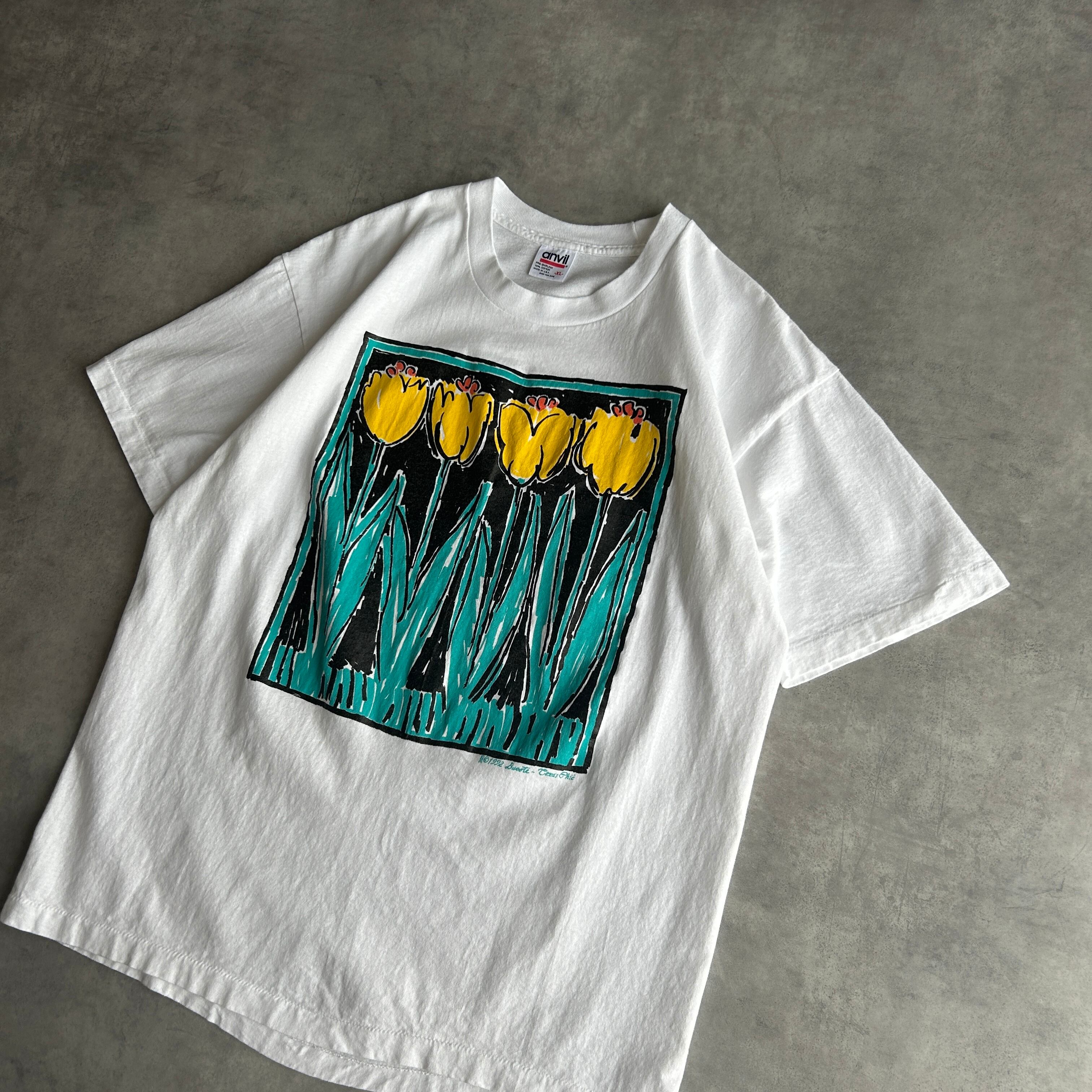 黒ベースに鮮やかな色を用いたリノカット風デザインのチューリップ。