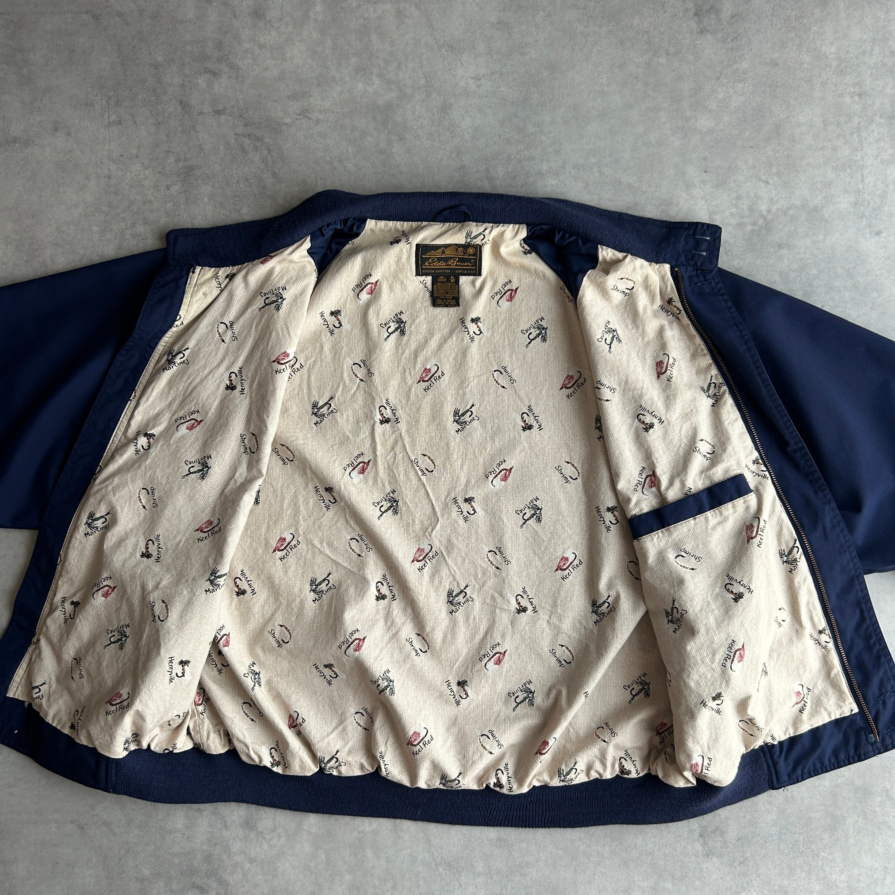 フロントジップにはウインドシールド付き、裏地は様々な種類のルアーが描かれています。