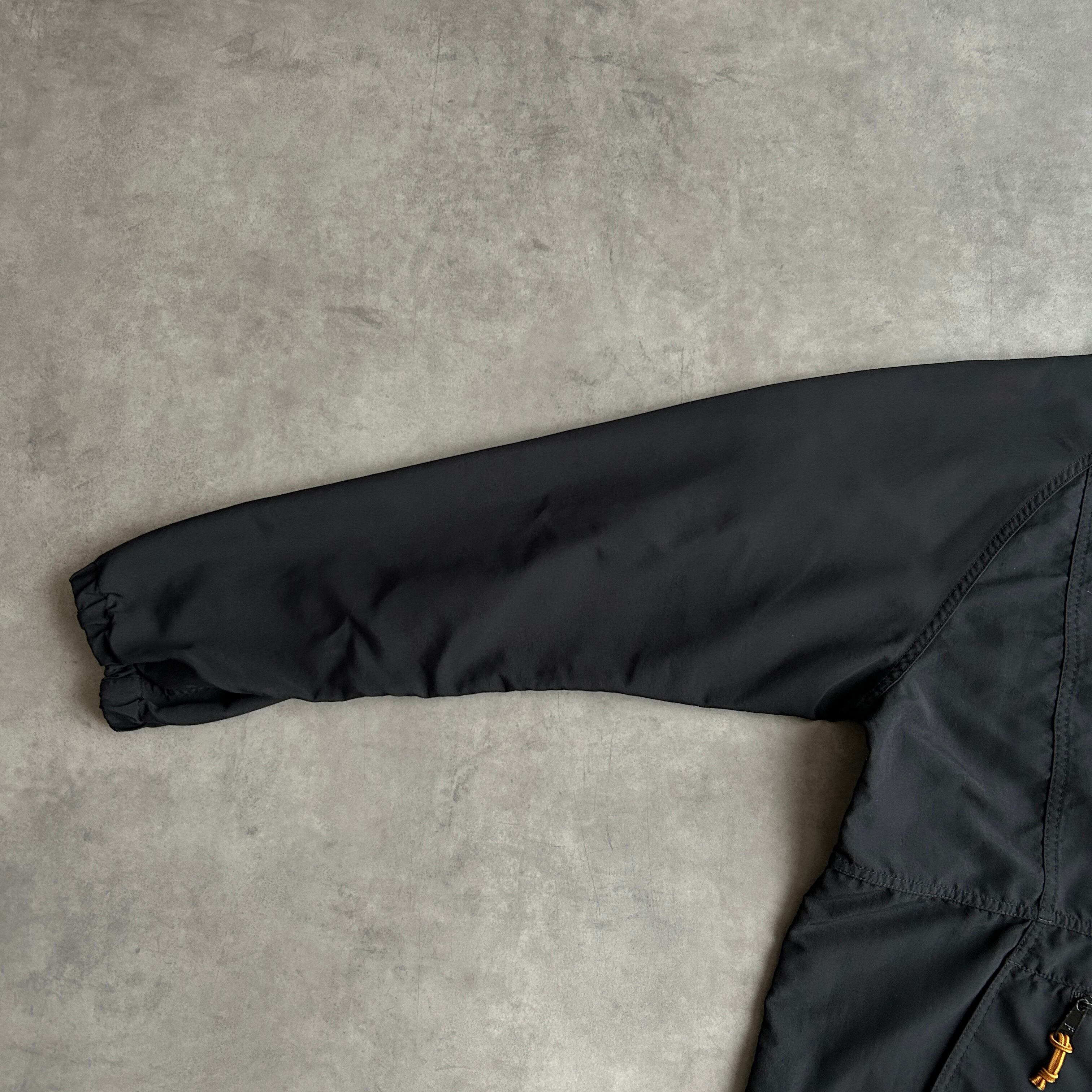 胸元にロゴワッペン、裾にはドローコード付き。