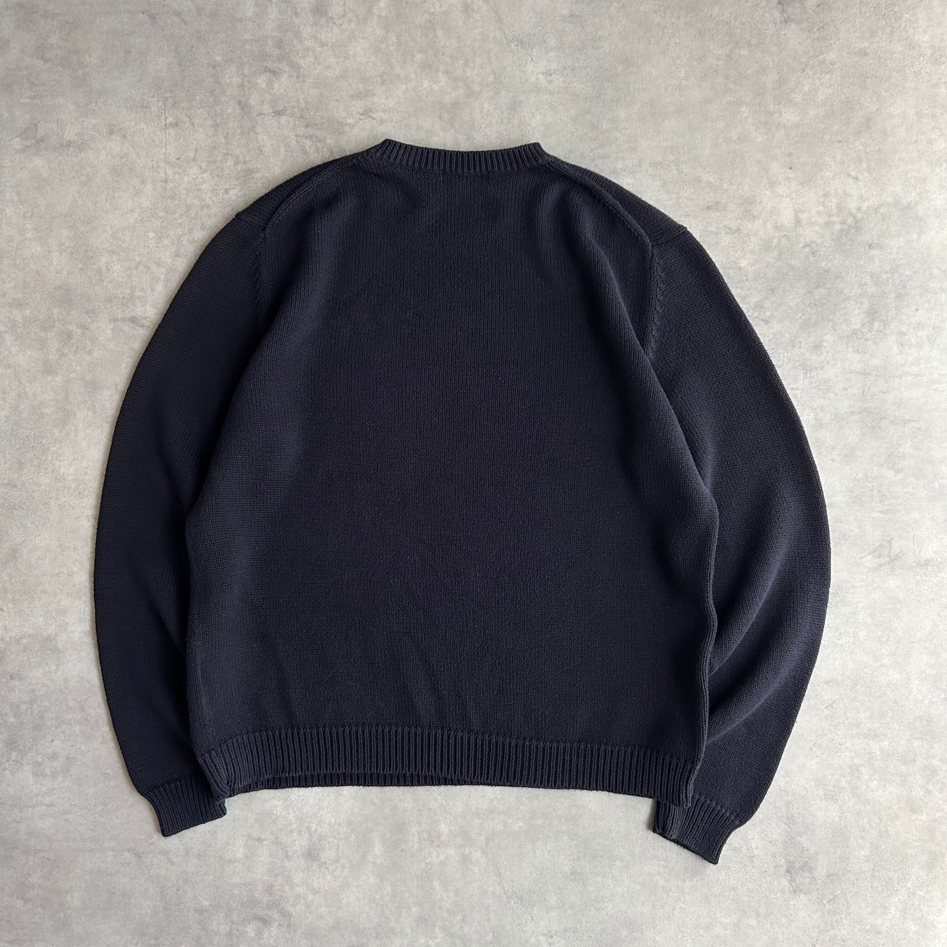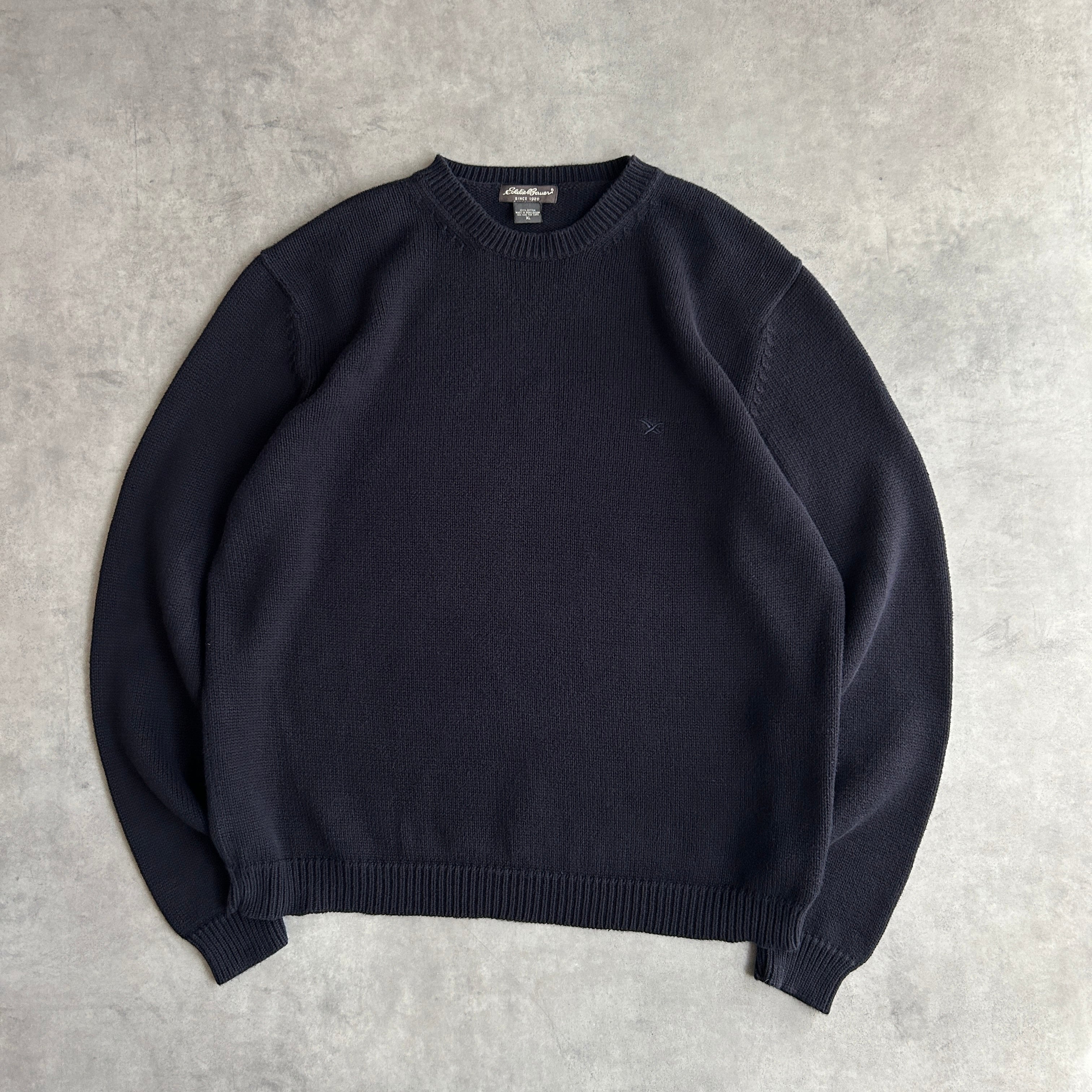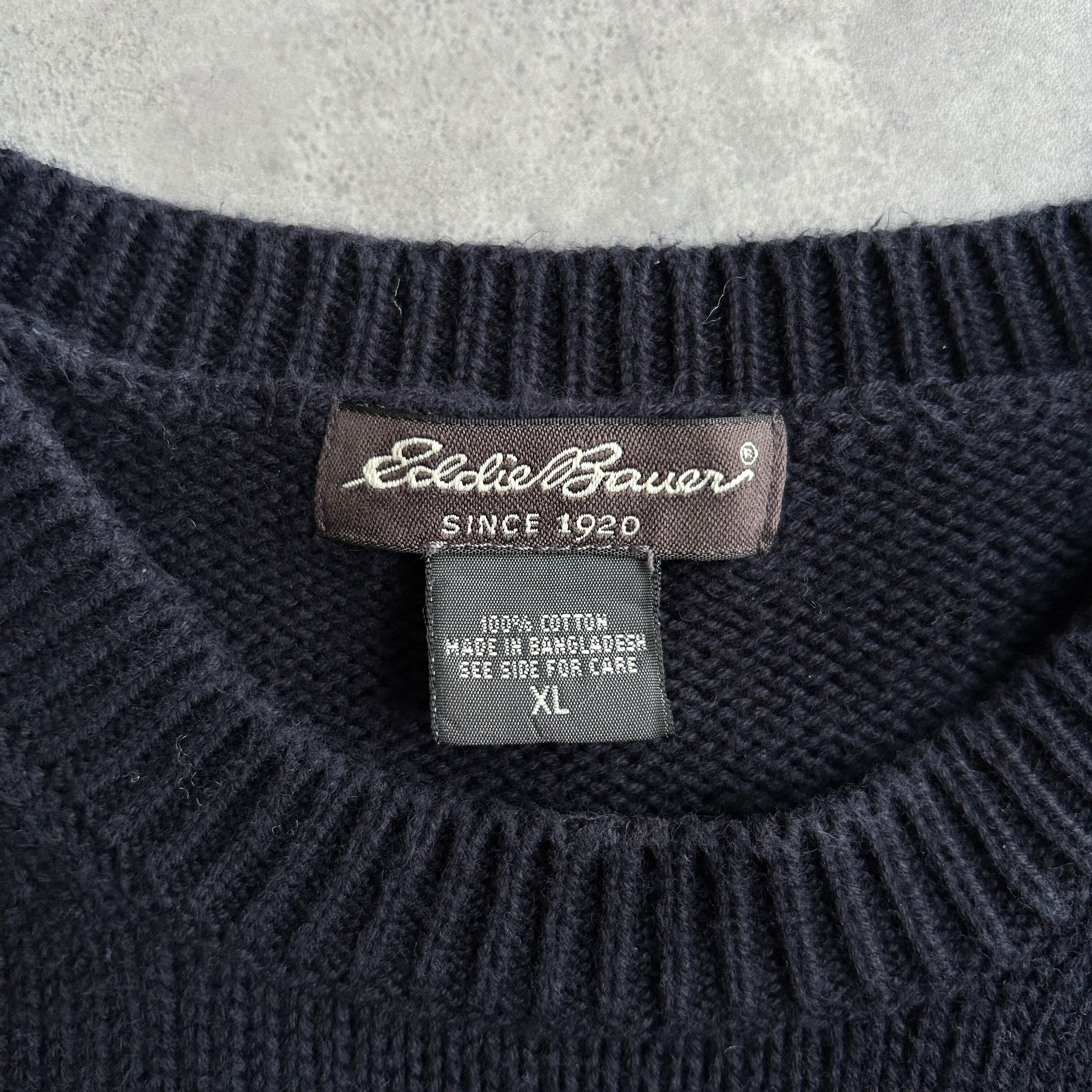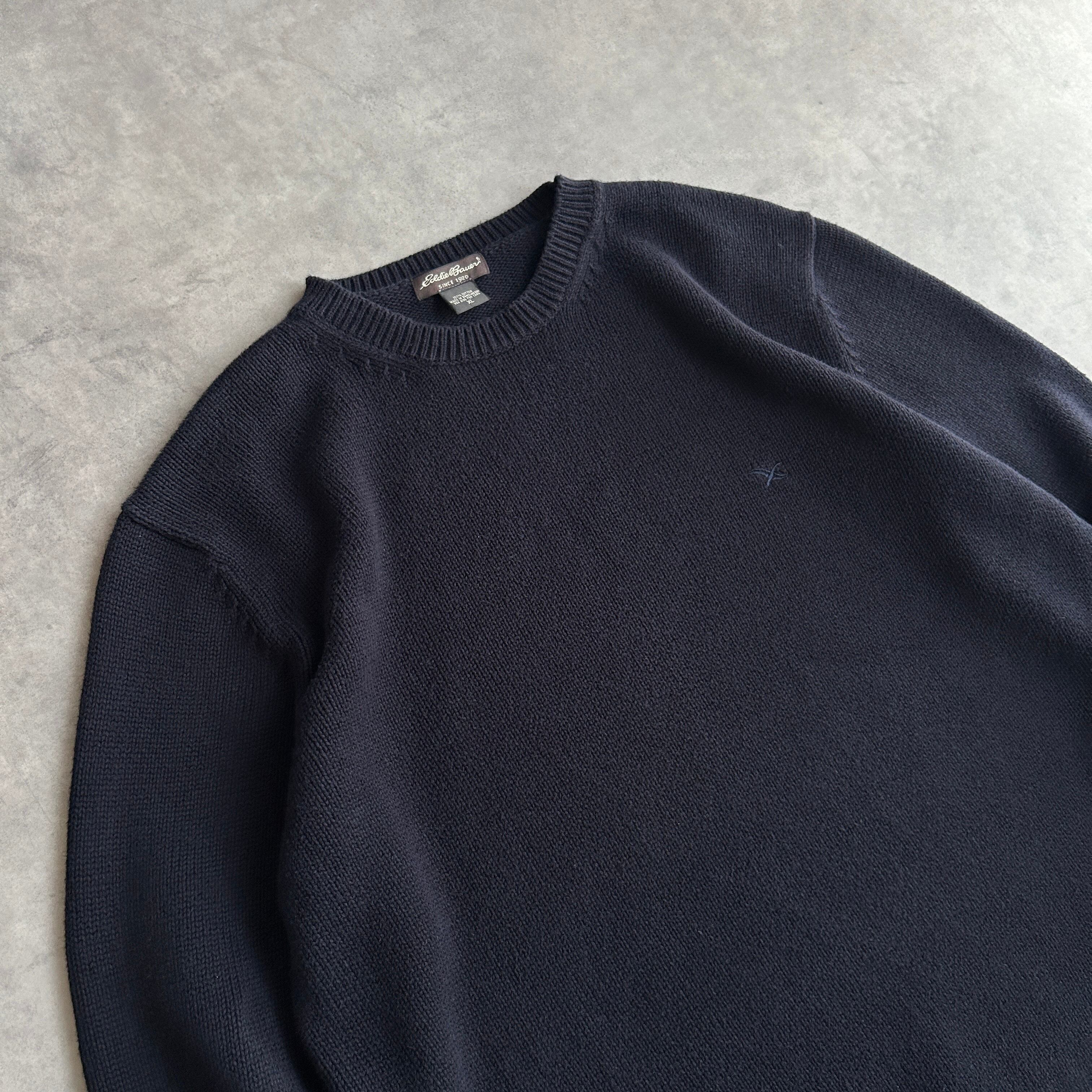 00s/Eddie Bauer/エディーバウアー/コットンニット/ワンポイントロゴ刺繍/プルオーバー/クルーネック/無地/ソリッド/ノームコア/ネイビー/紺/XL