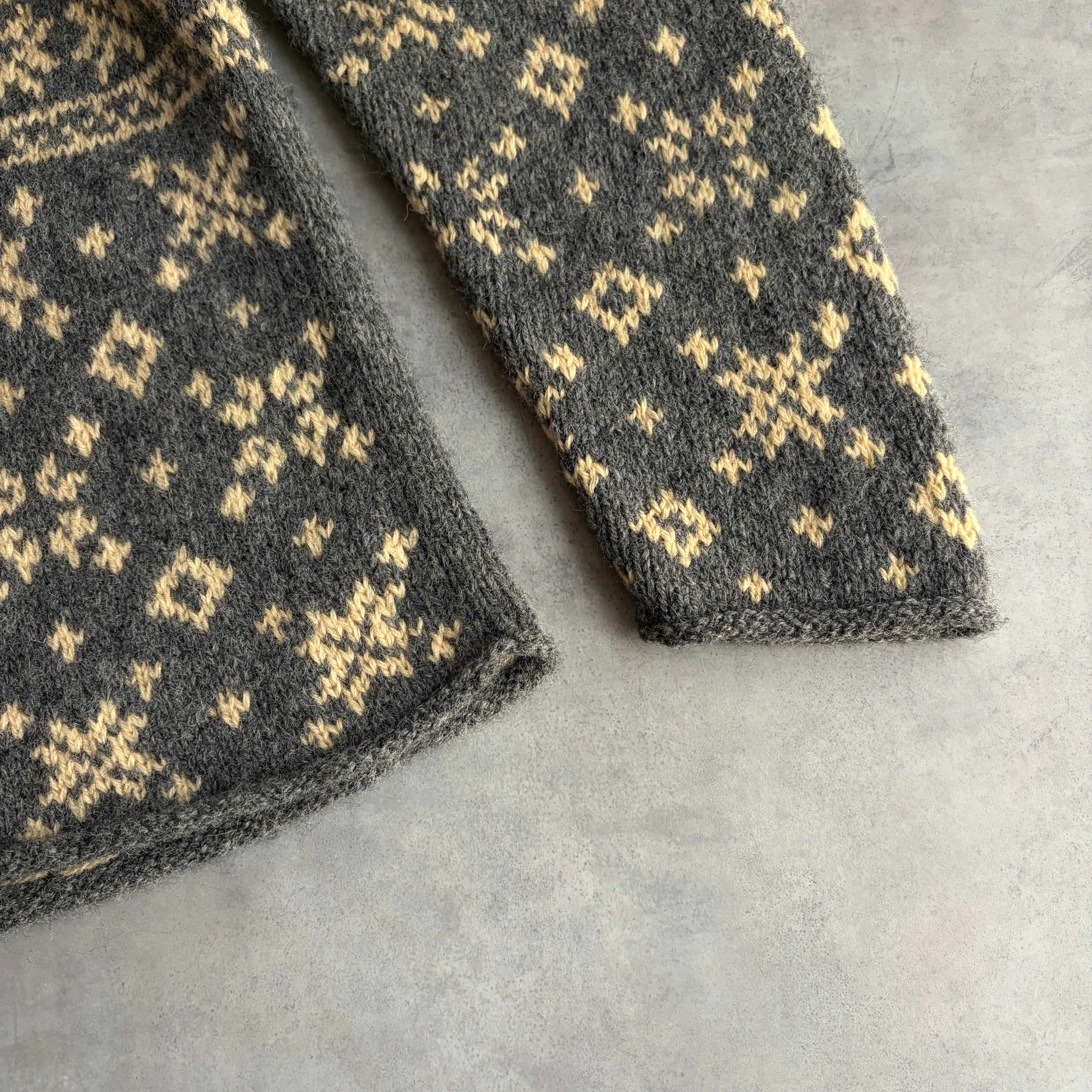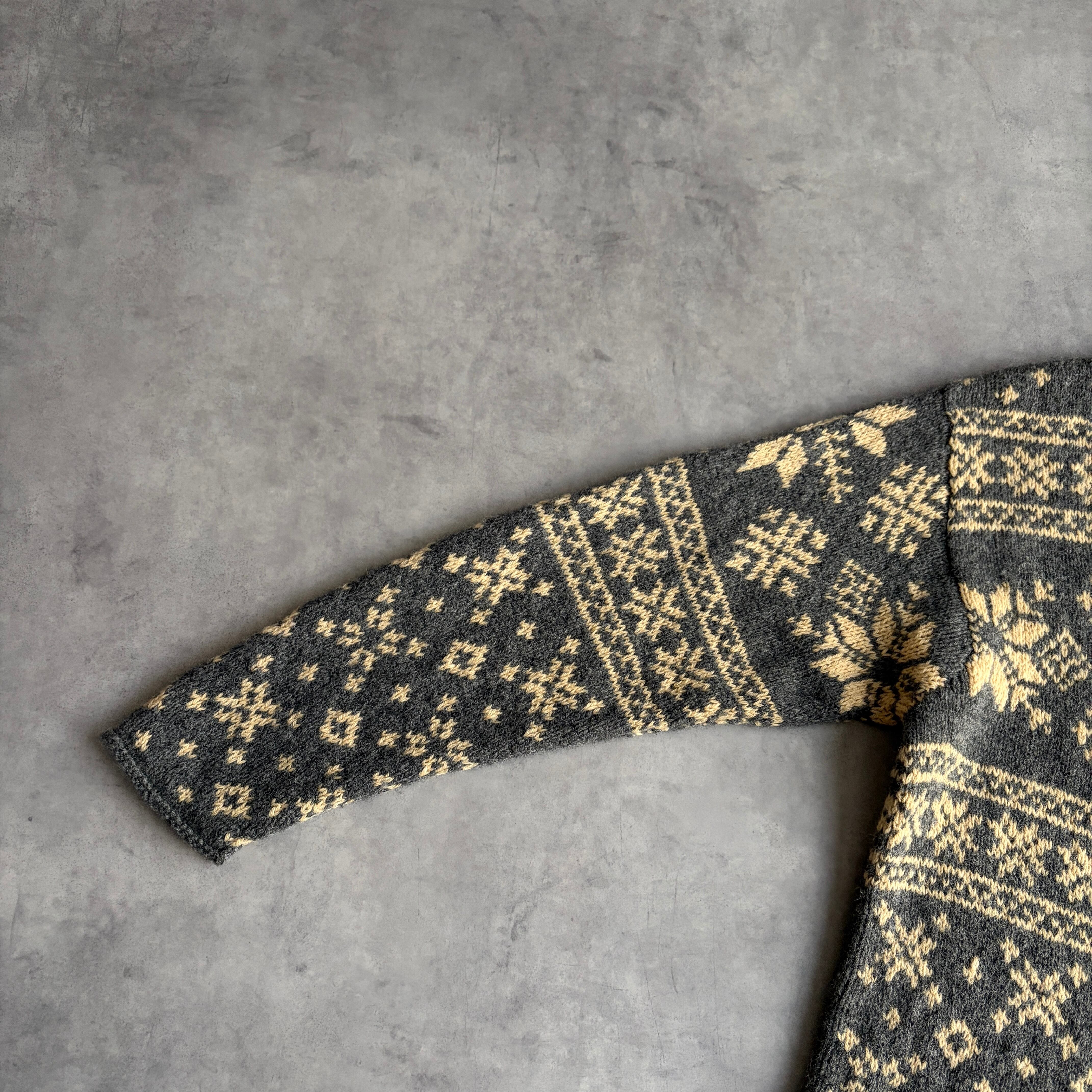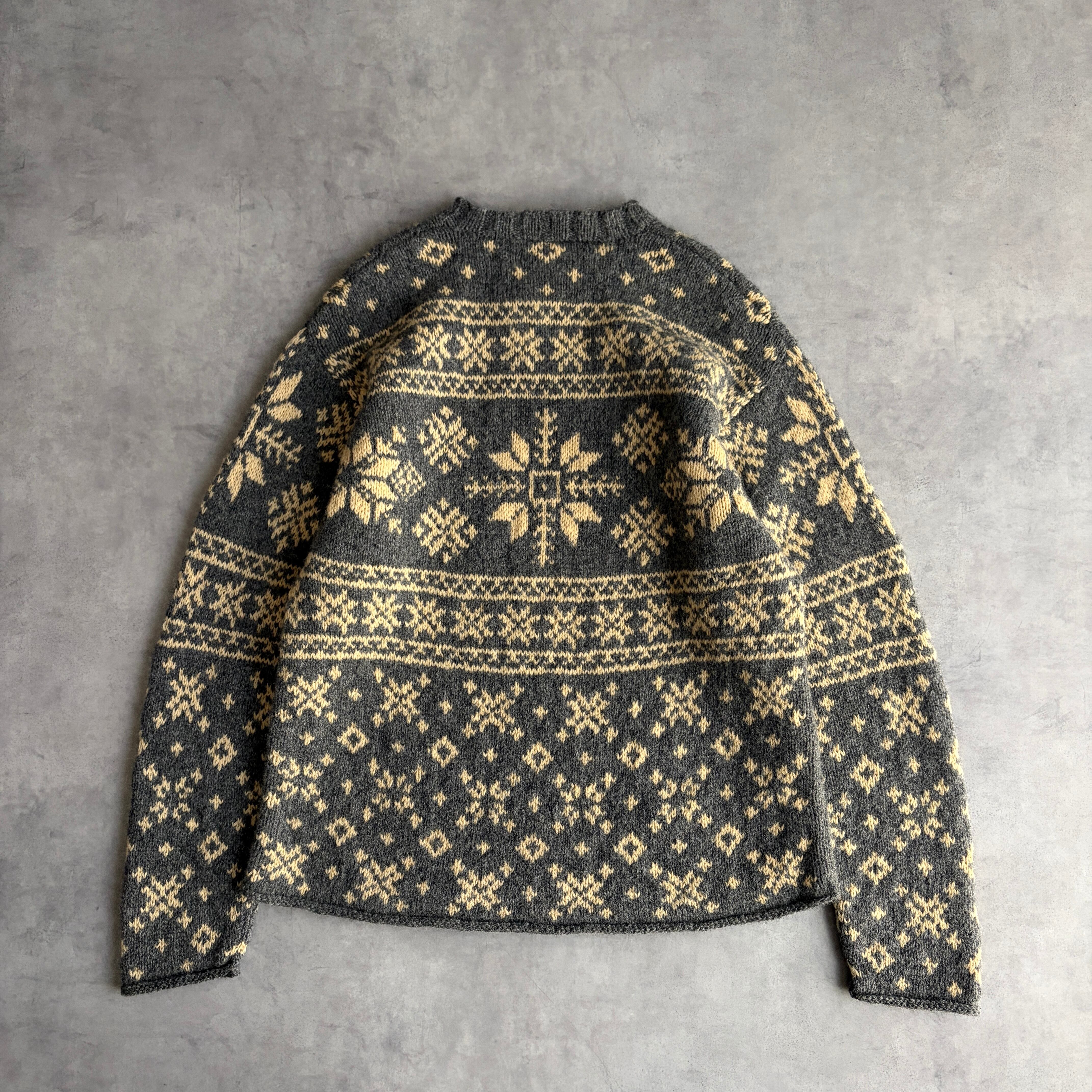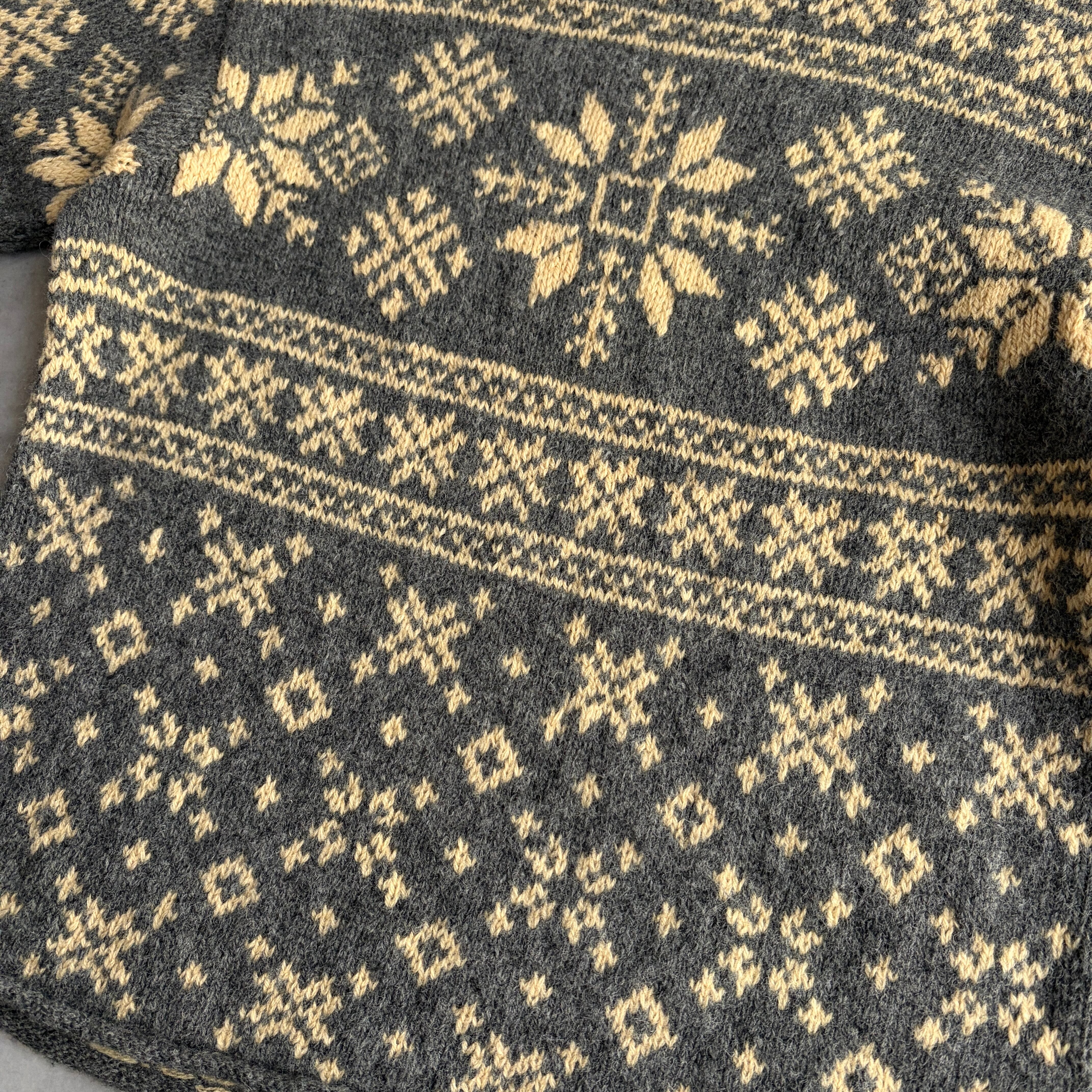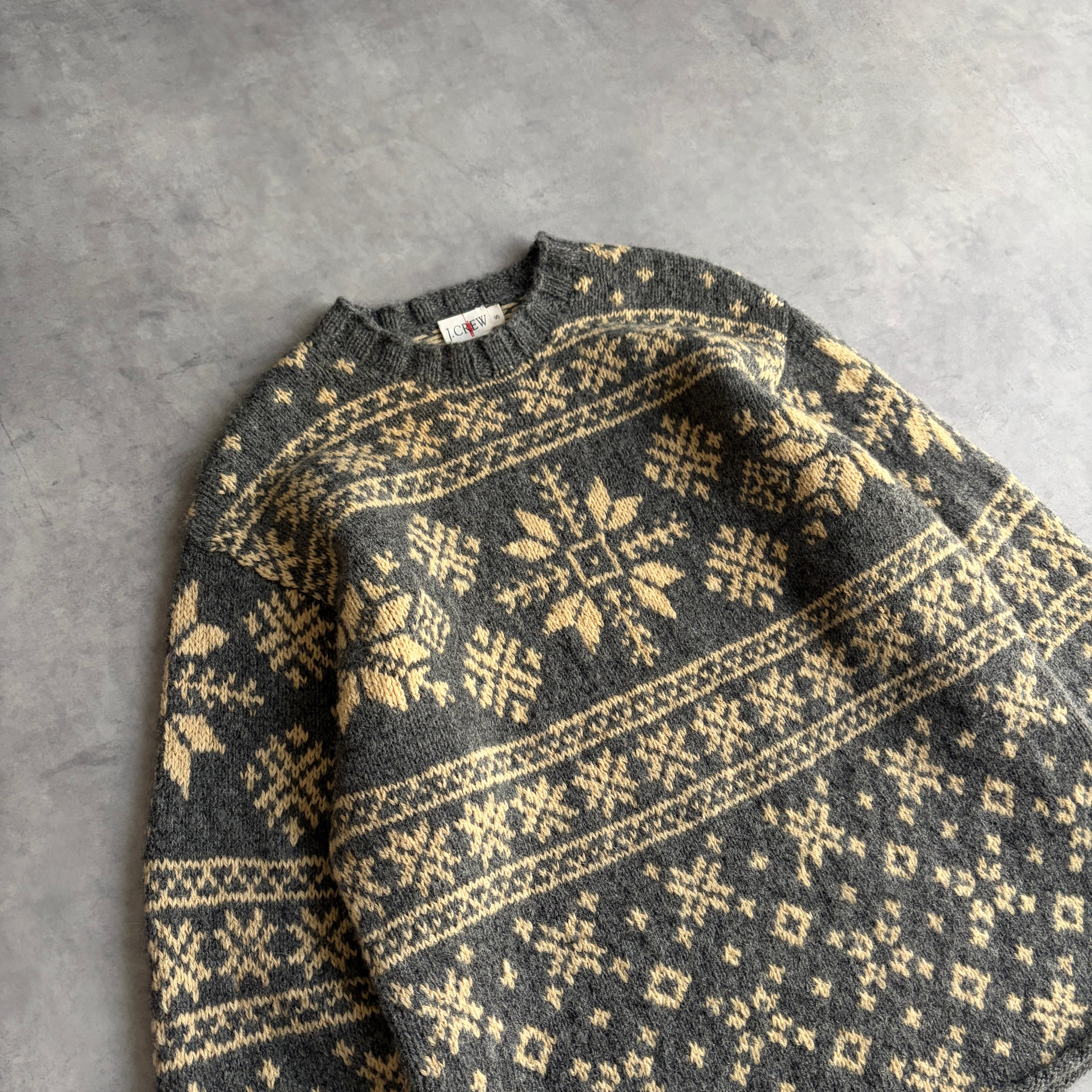 90s/J.CREW/ジェークルー/ウールニット/巨人タグ/プルオーバー/クルーネック/ノルディック柄/氷結晶/バーズアイ/袖裾ロール/グレー/灰色/S