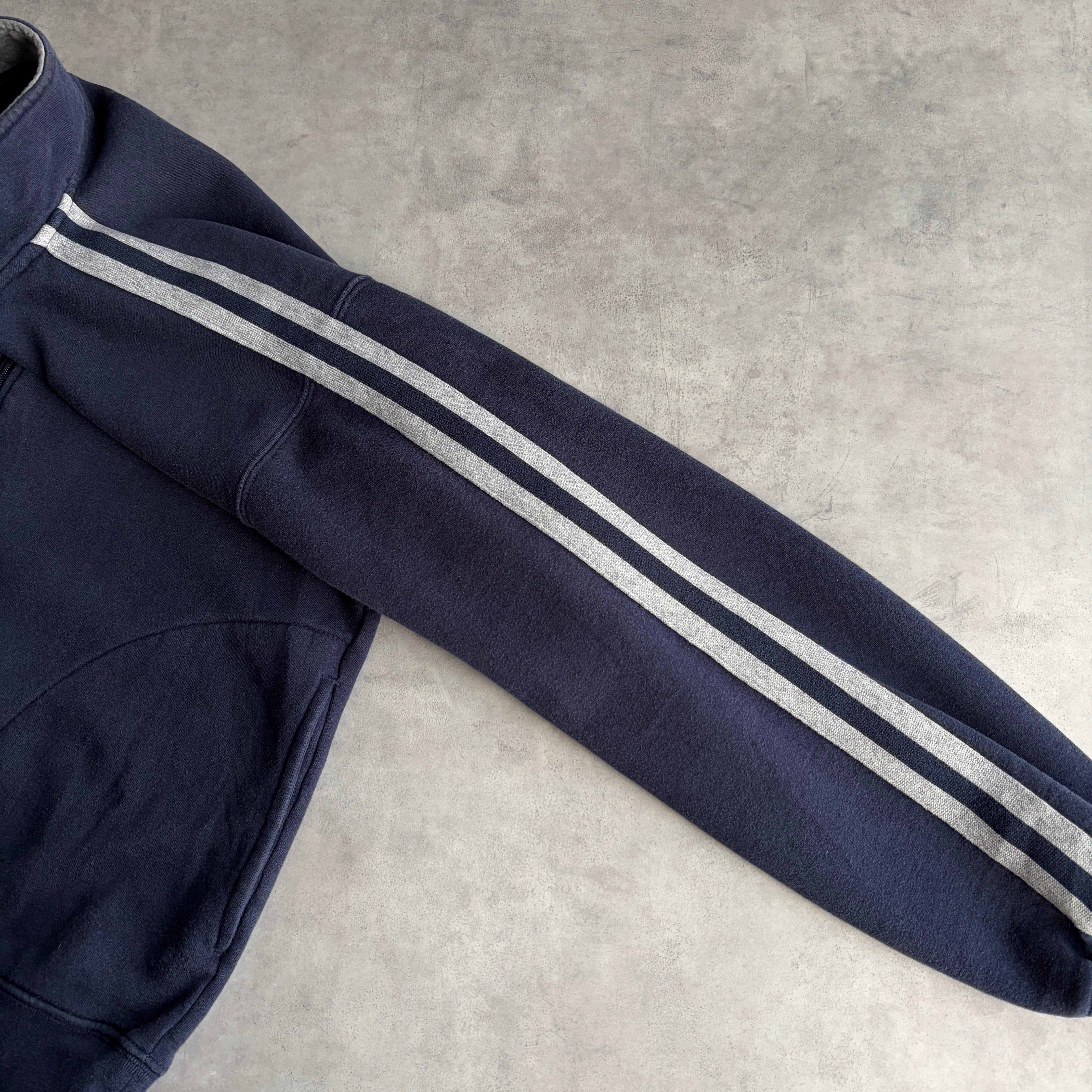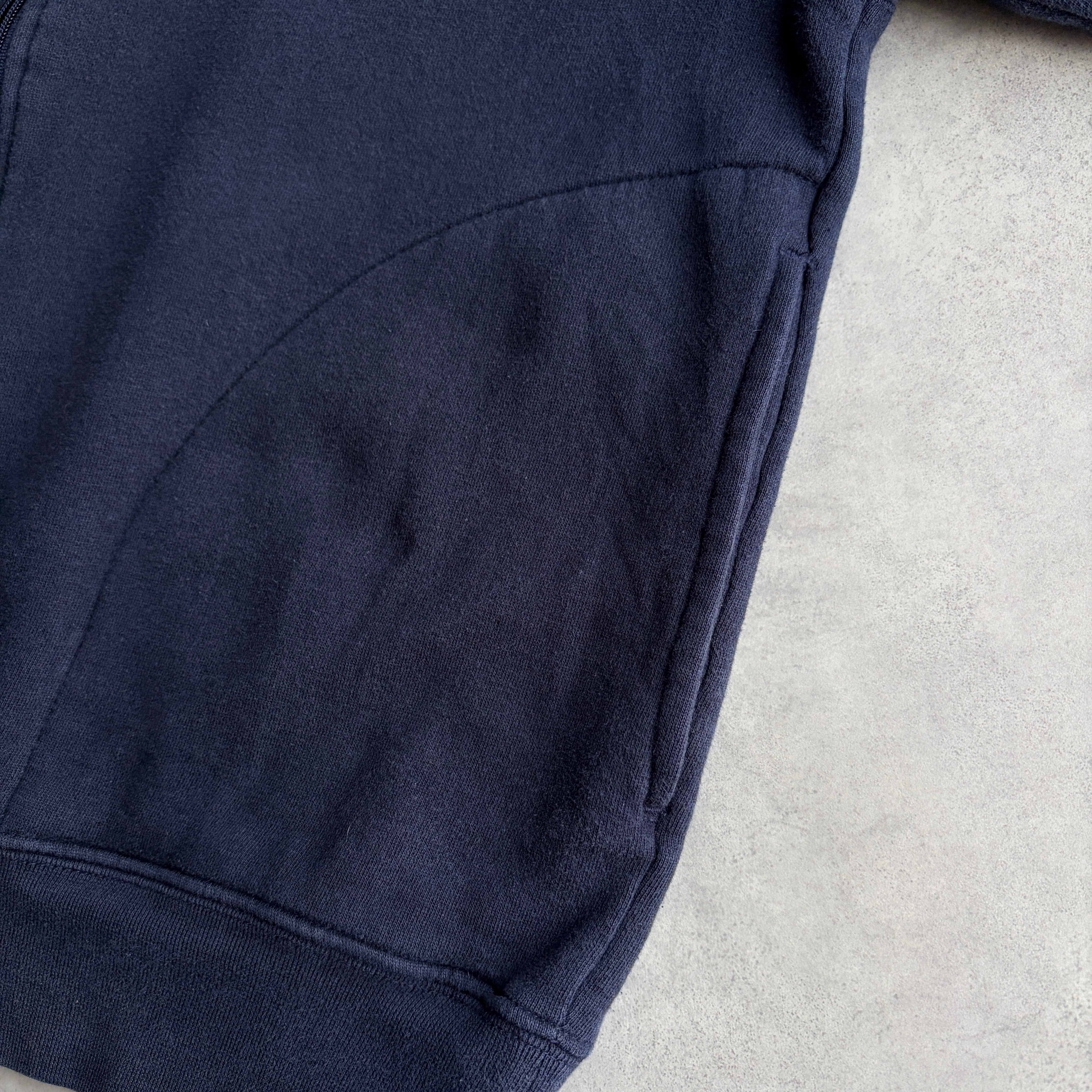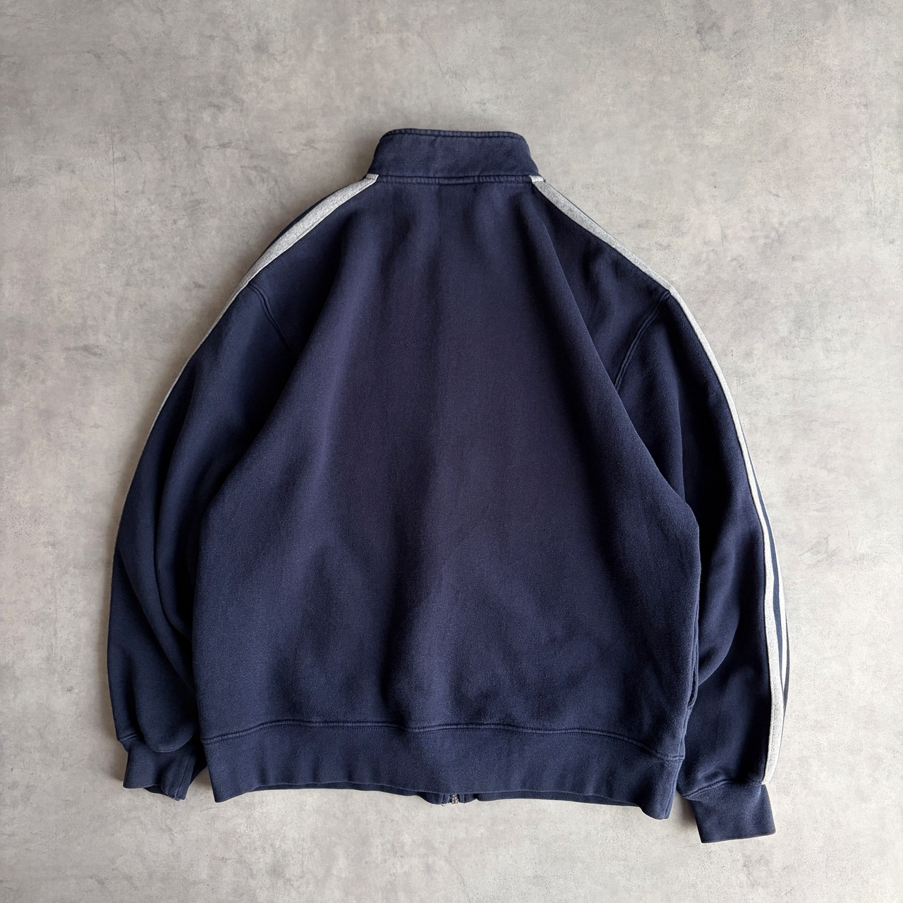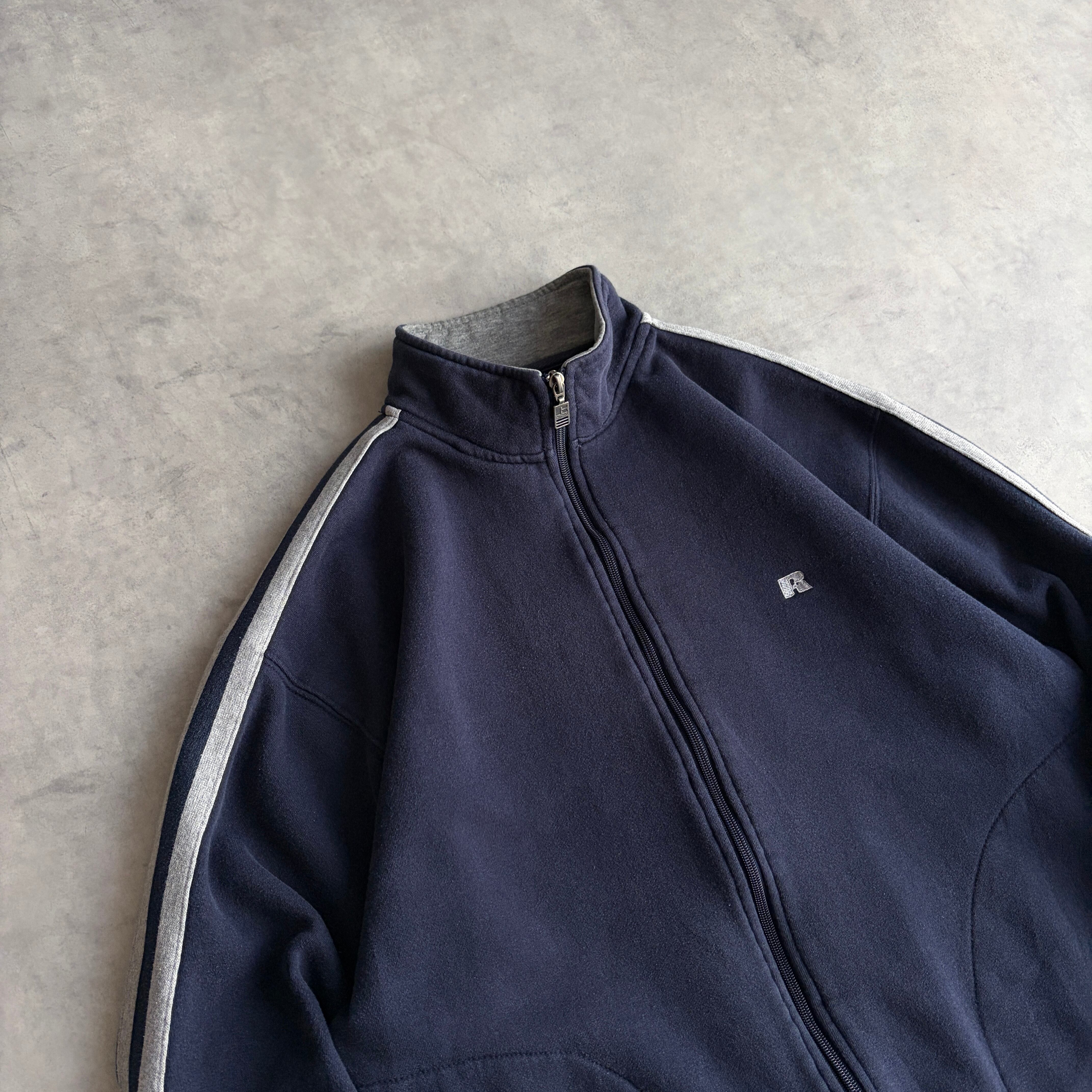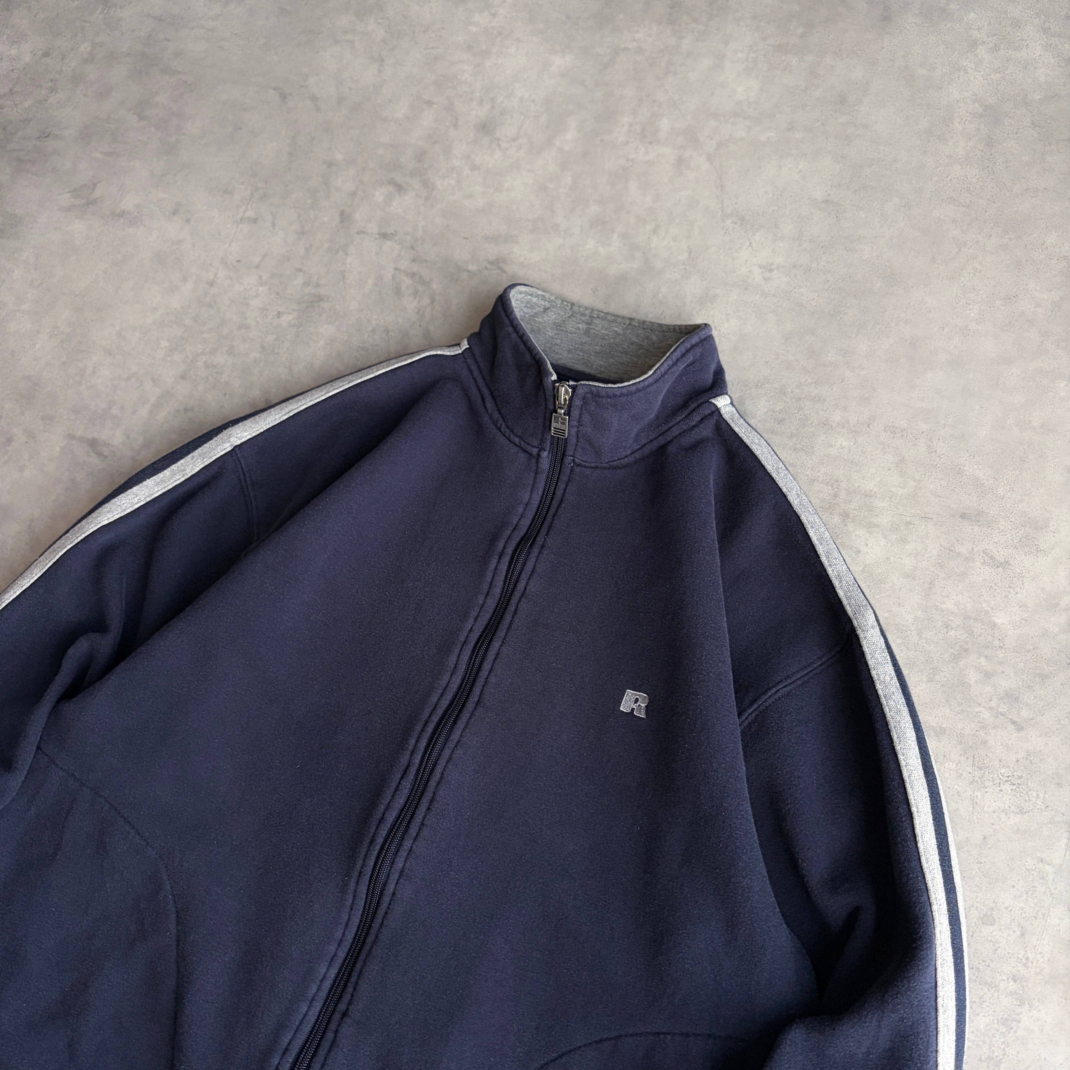90s/RUSSELL ATHLETIC/ラッセルアスレチック/フルジップスウェット/トラックジャケット/ジップアップ/スタンドカラー/立ち襟/ロゴチャーム/ワンポイント刺繍/袖ライン/ポケット付き/ネイビー/紺/L