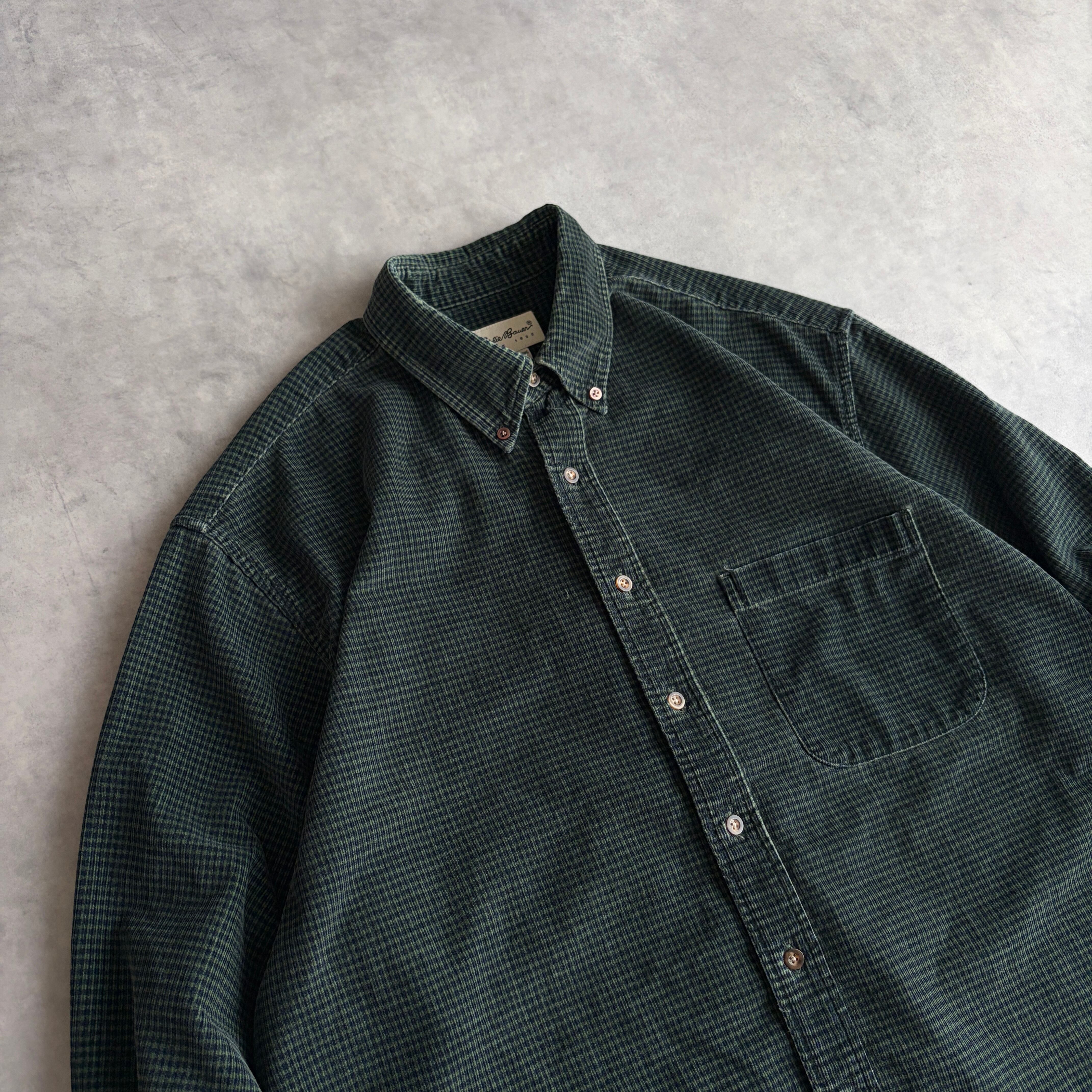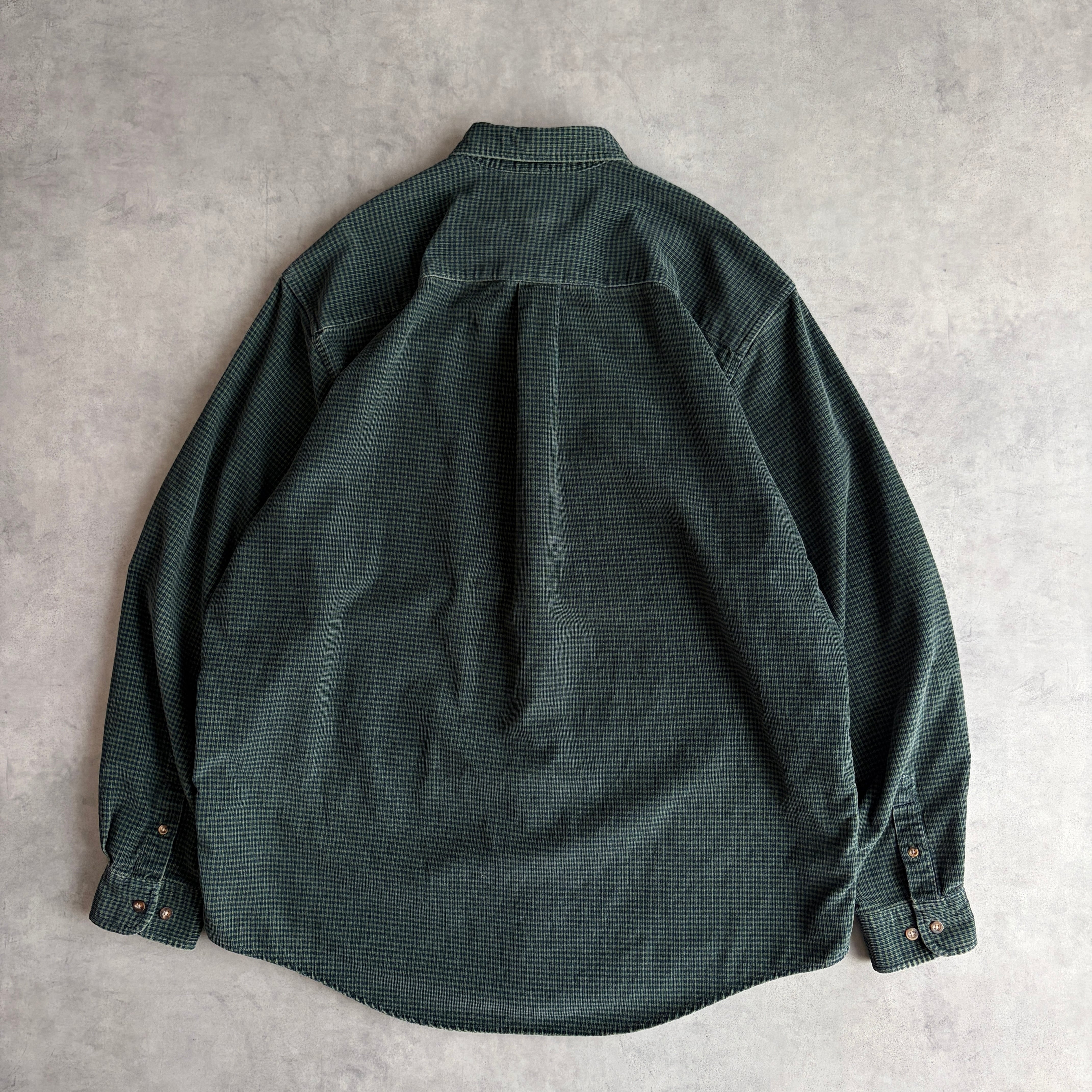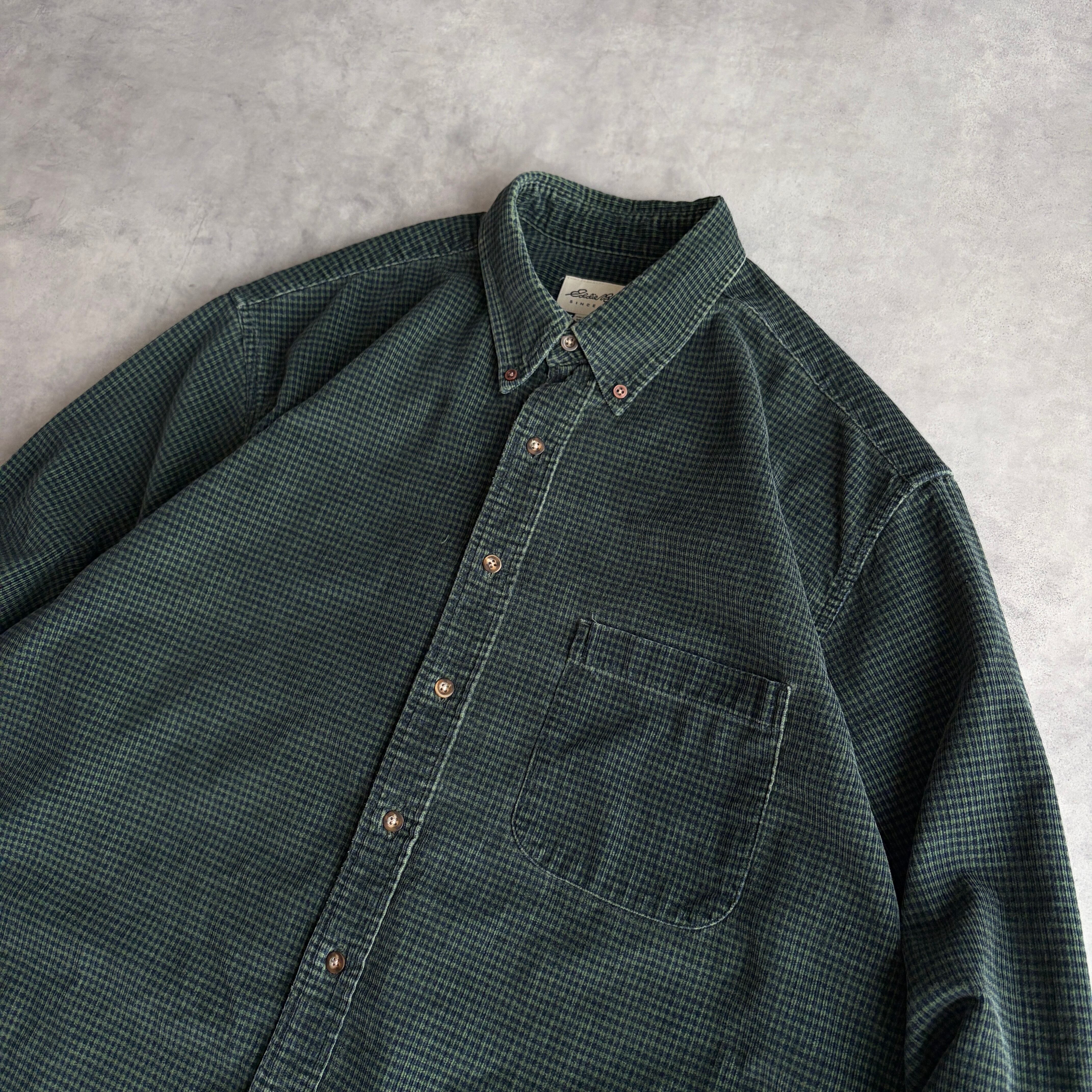 90s/Eddie Bauer/エディーバウアー/長袖/BDシャツ/ボタンダウン/コーデュロイ/コーズ/ギンガムチェック/小格子柄/グリーン×ネイビー/緑×紺/L