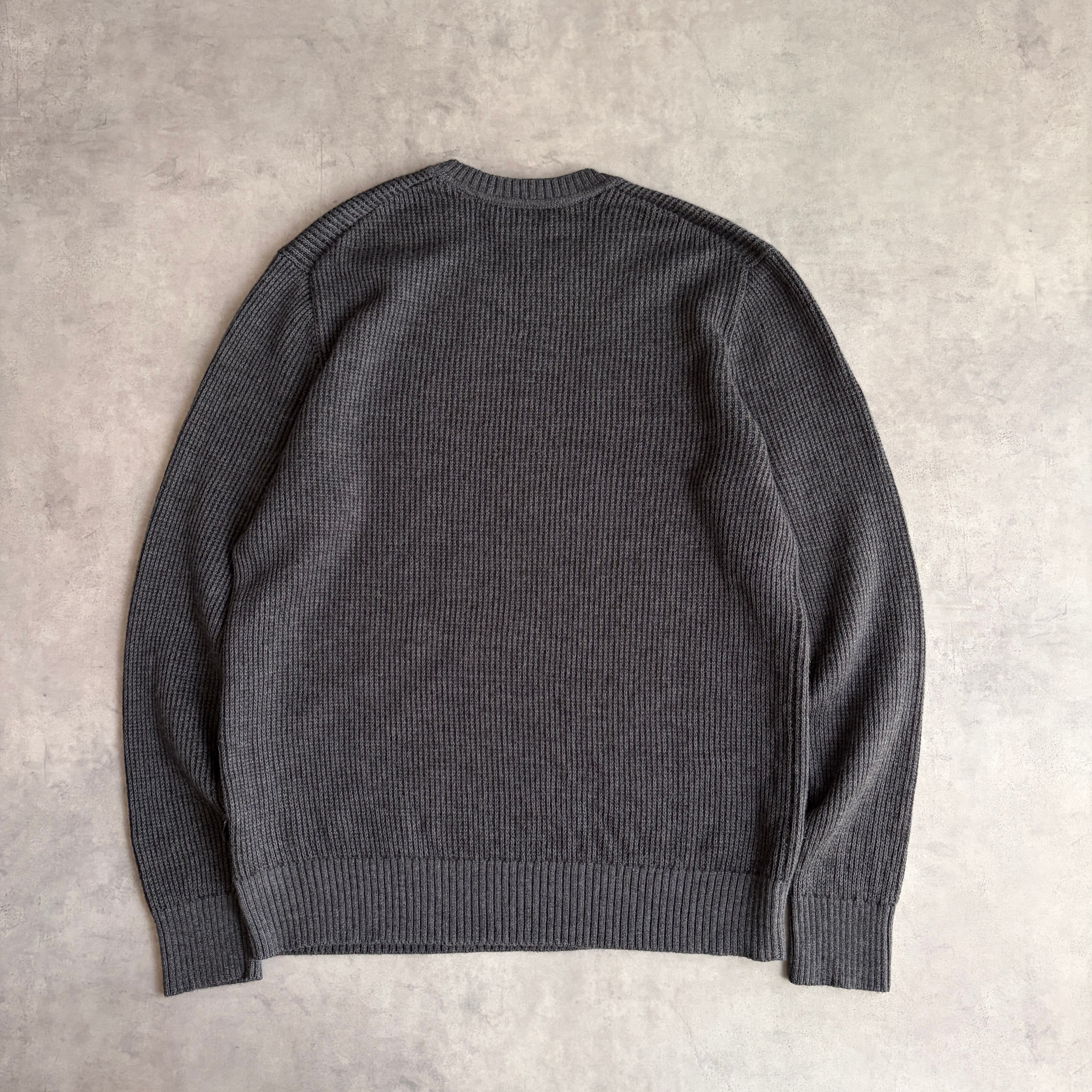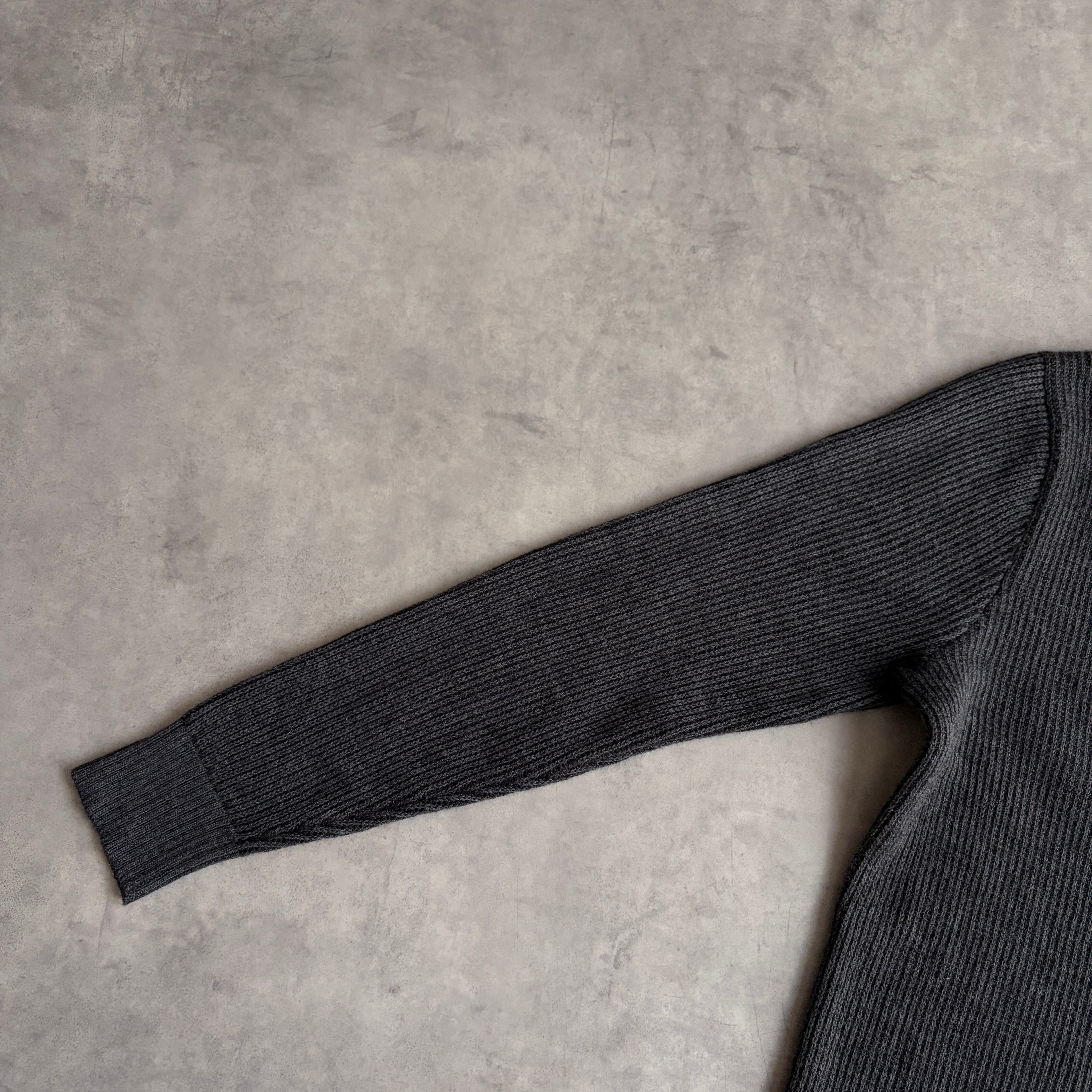 滑らかで柔らかい肌触りのメリノウールを使用しており、グレーとブラックの畦編みのニット。