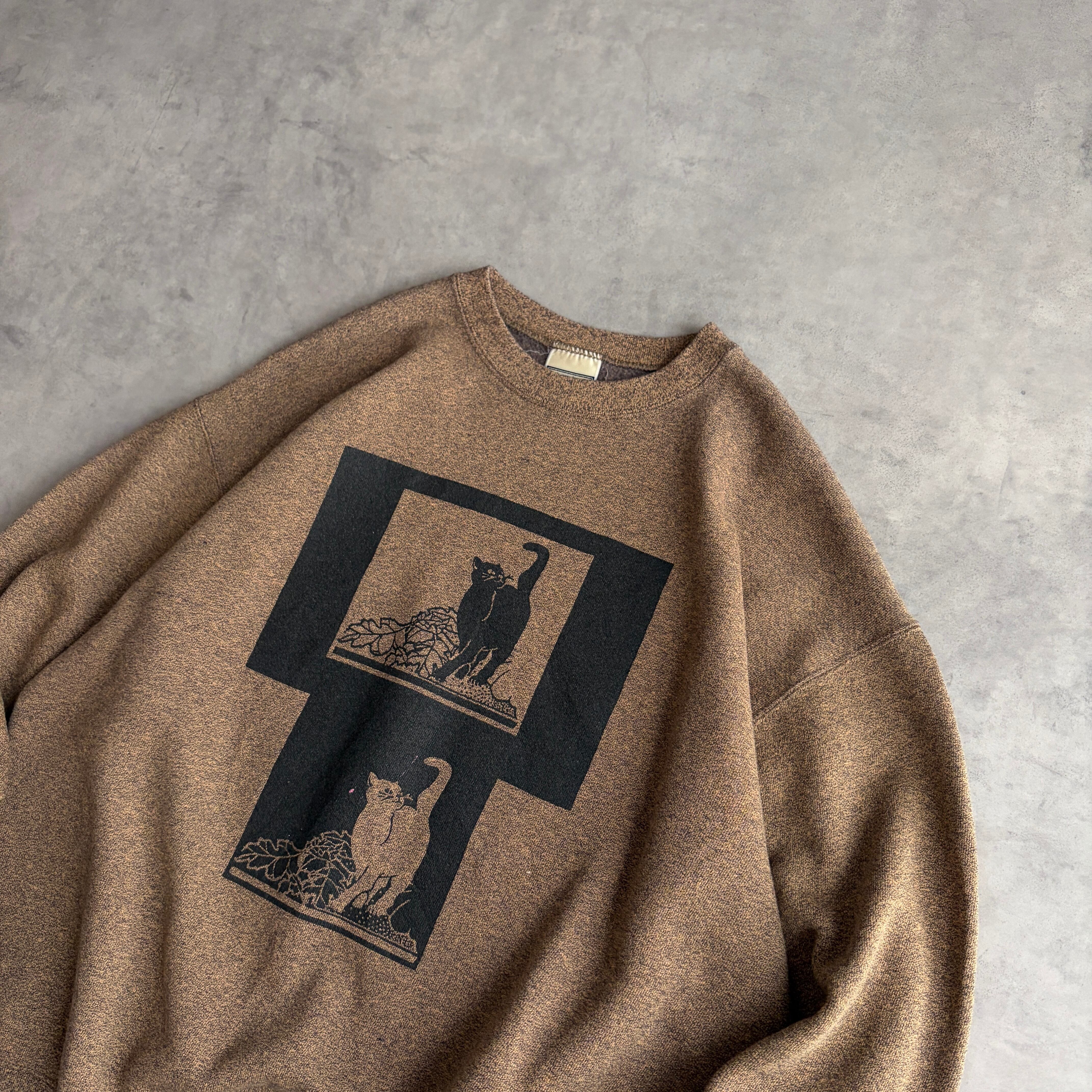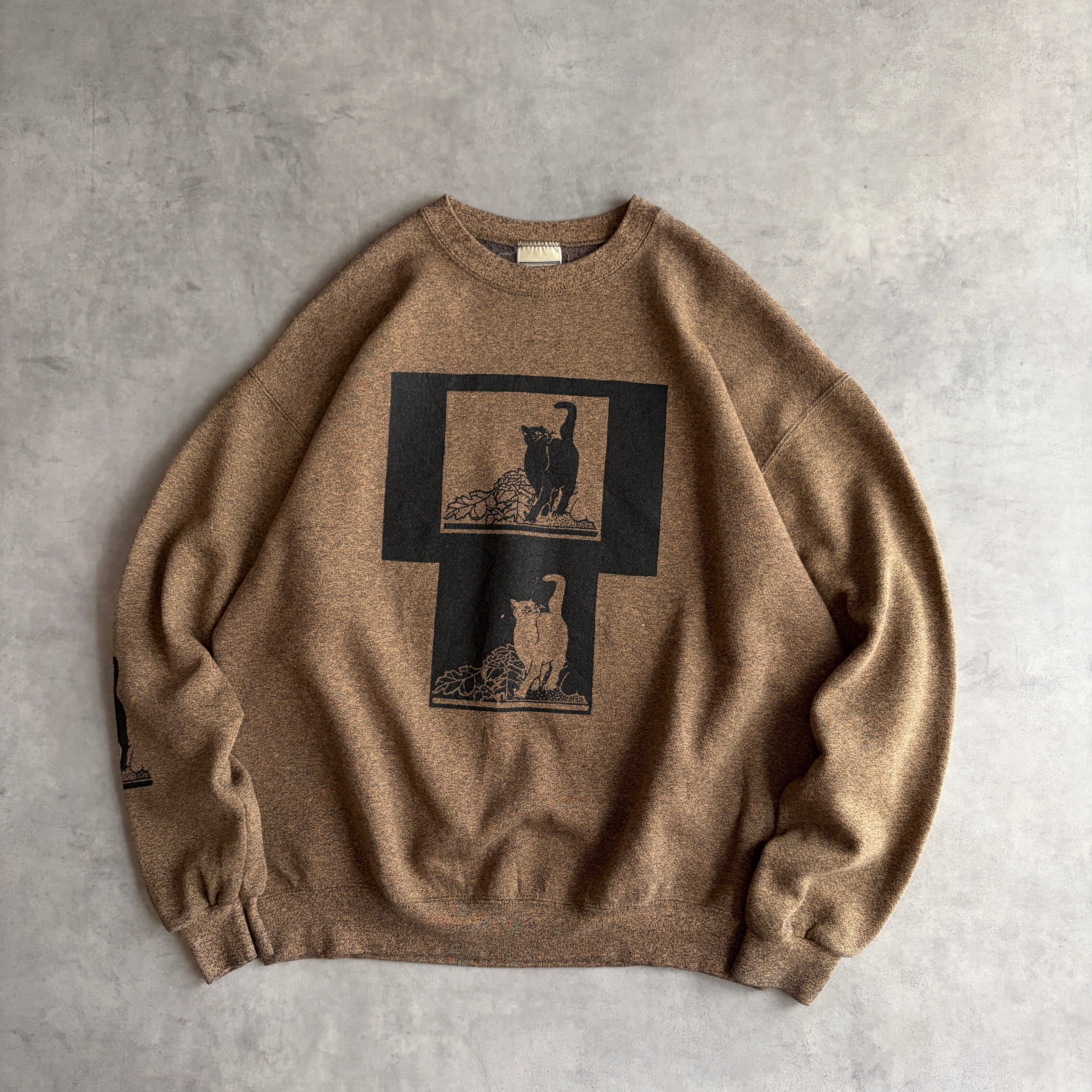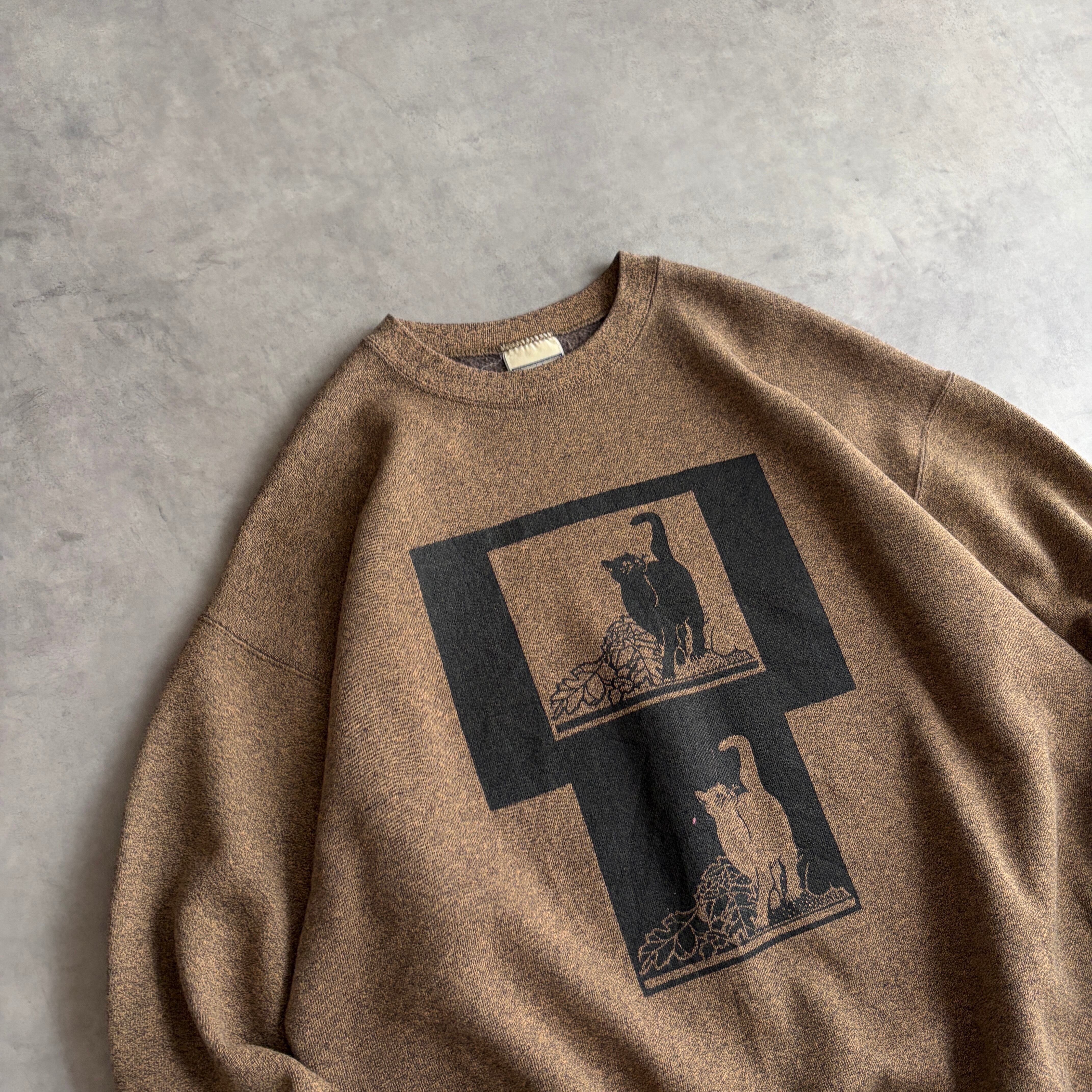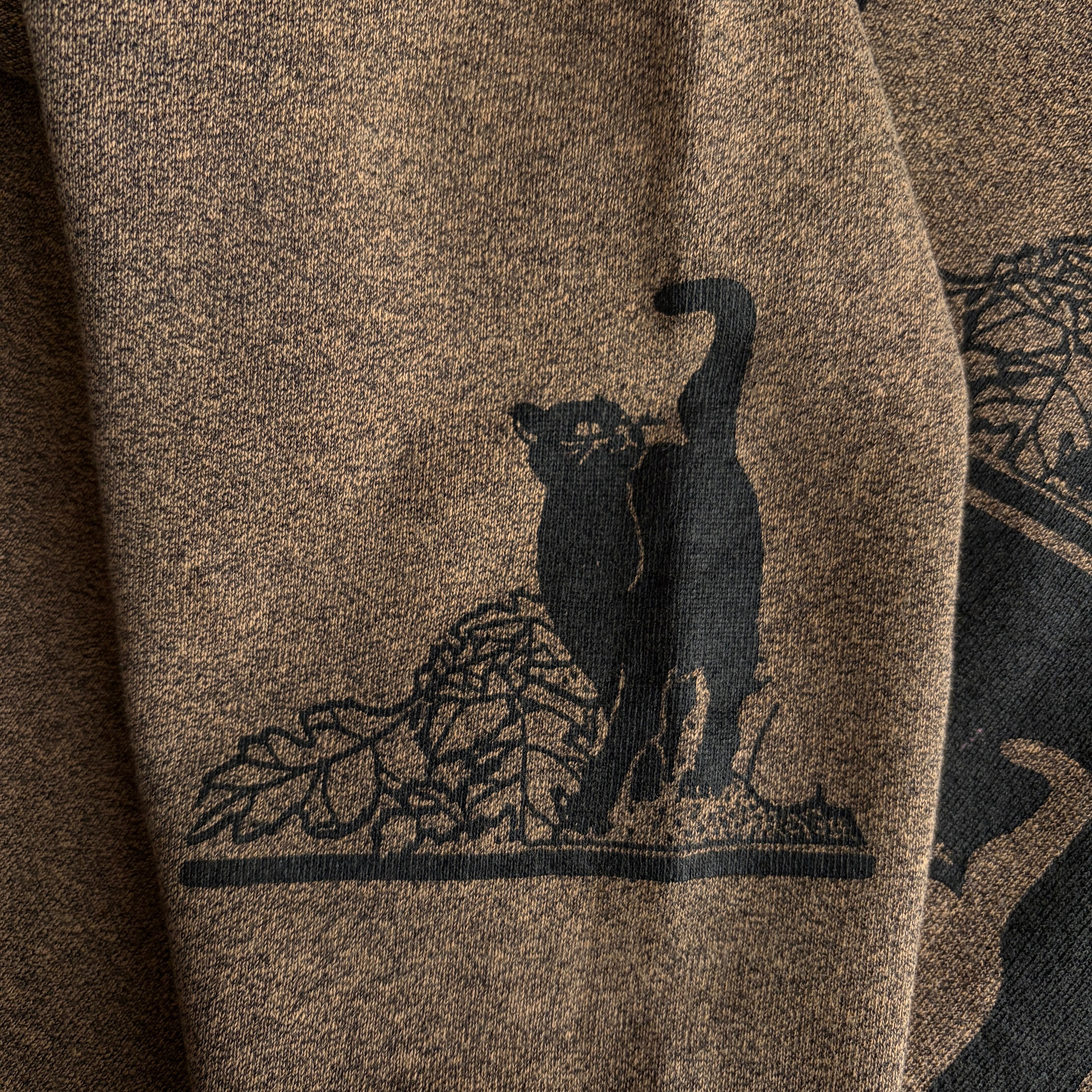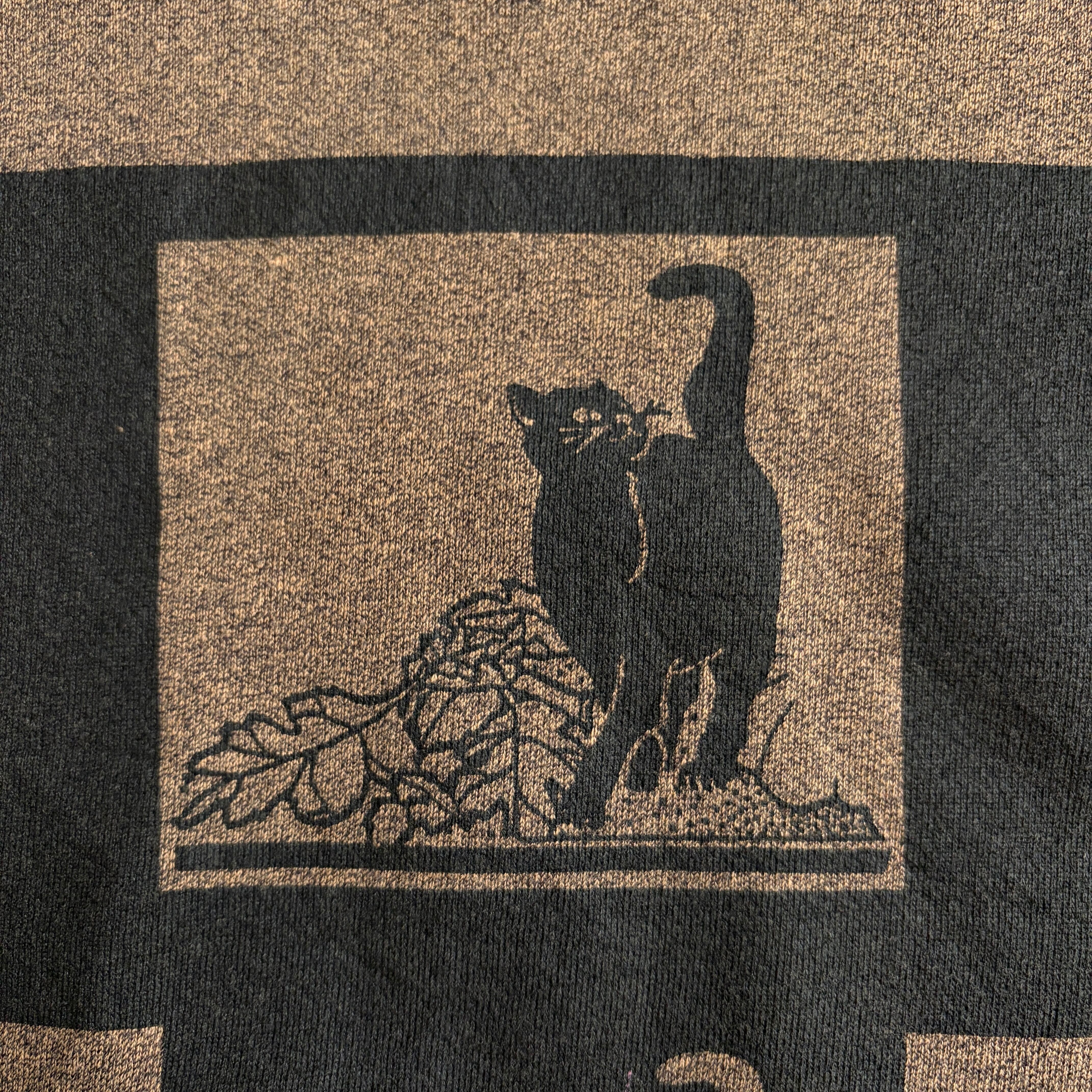 フロントには黒猫モチーフの配色反転アートプリント、右袖にも同様のものがあり、背面には肉球が一つプリントされているアイテム。