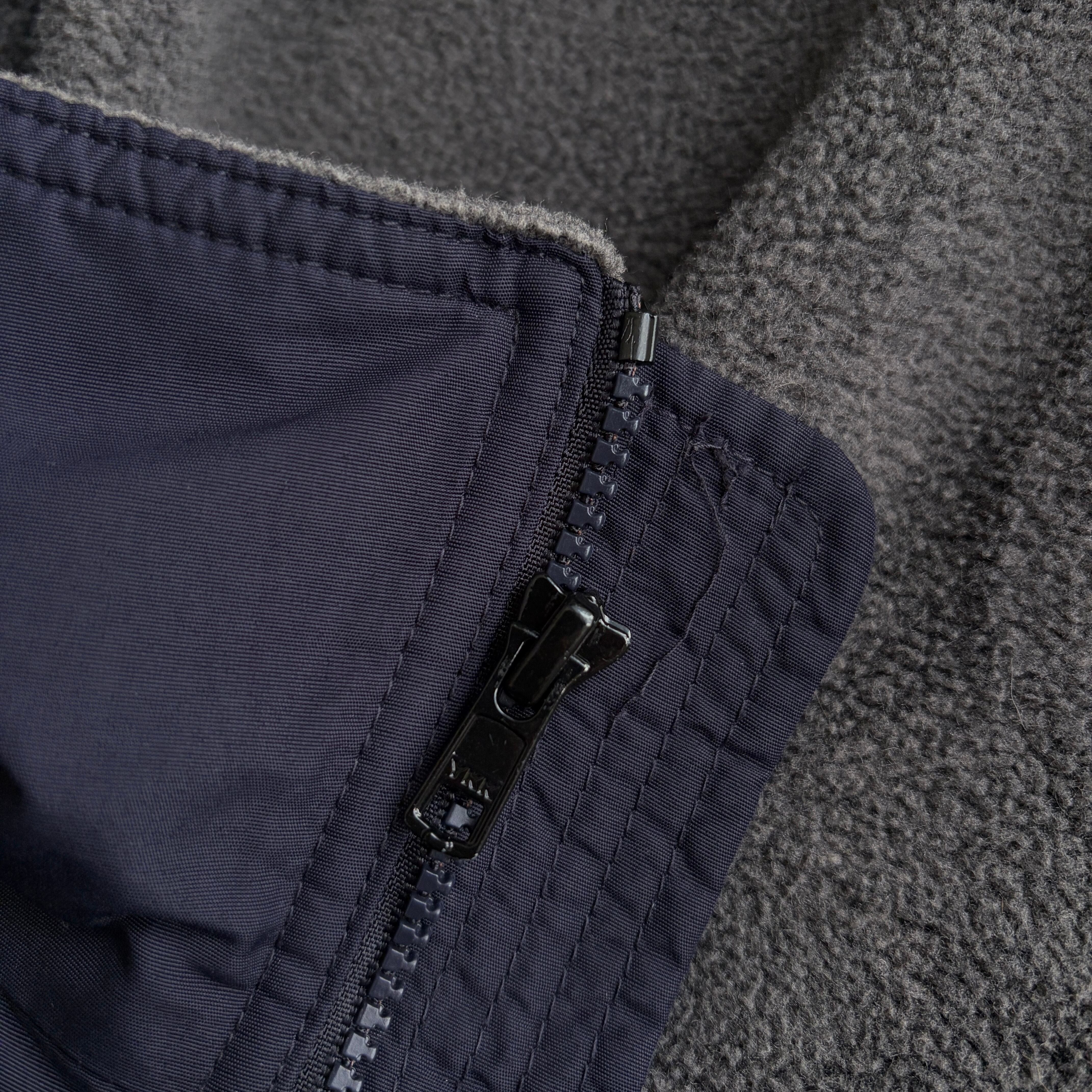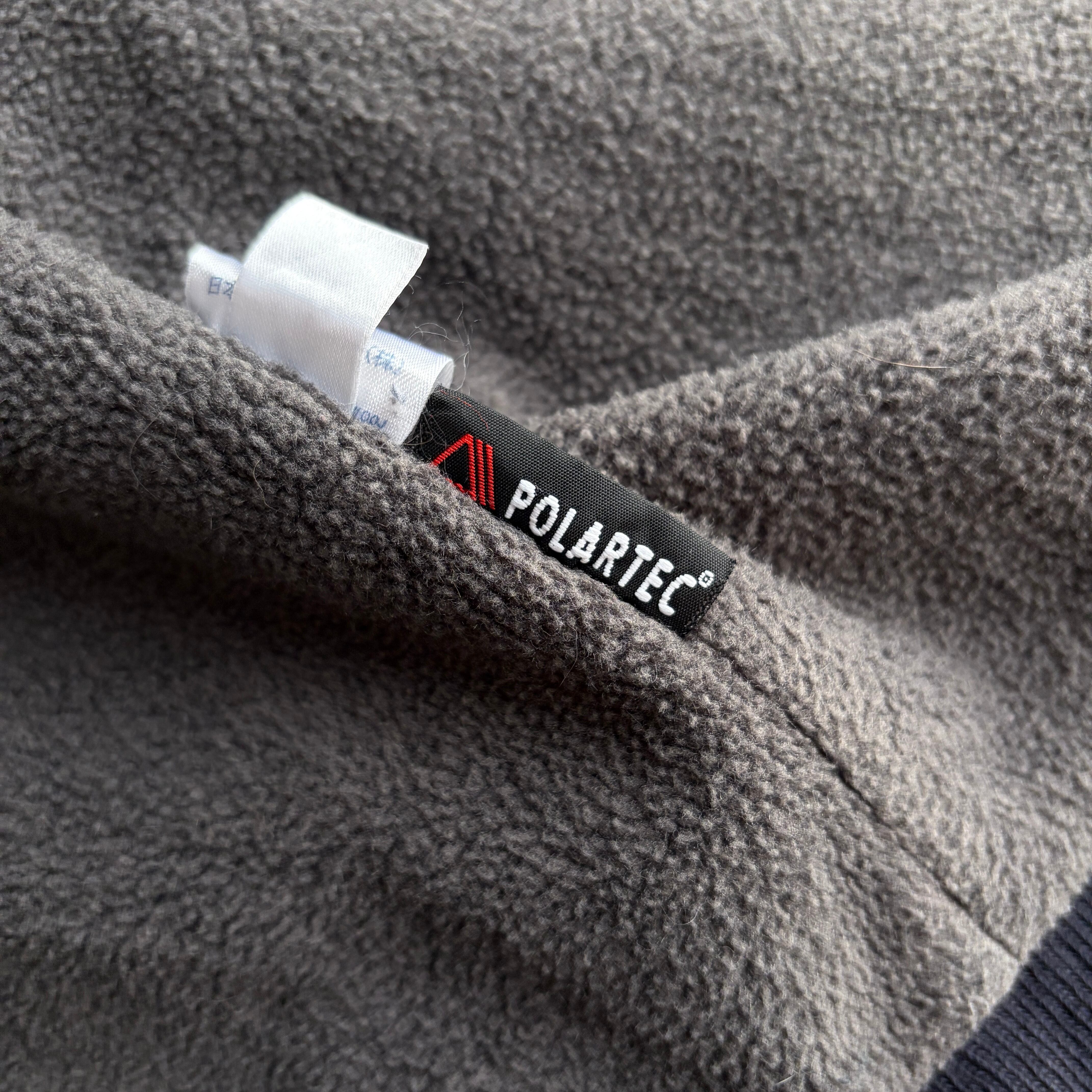 スモールボックスロゴに首まで守ってくれるスタンドカラー、短丈ながらも身幅もあり、外はナイロン裏地はフリース(POLARTEC)で寒い冬にはもってこいのアイテムです。