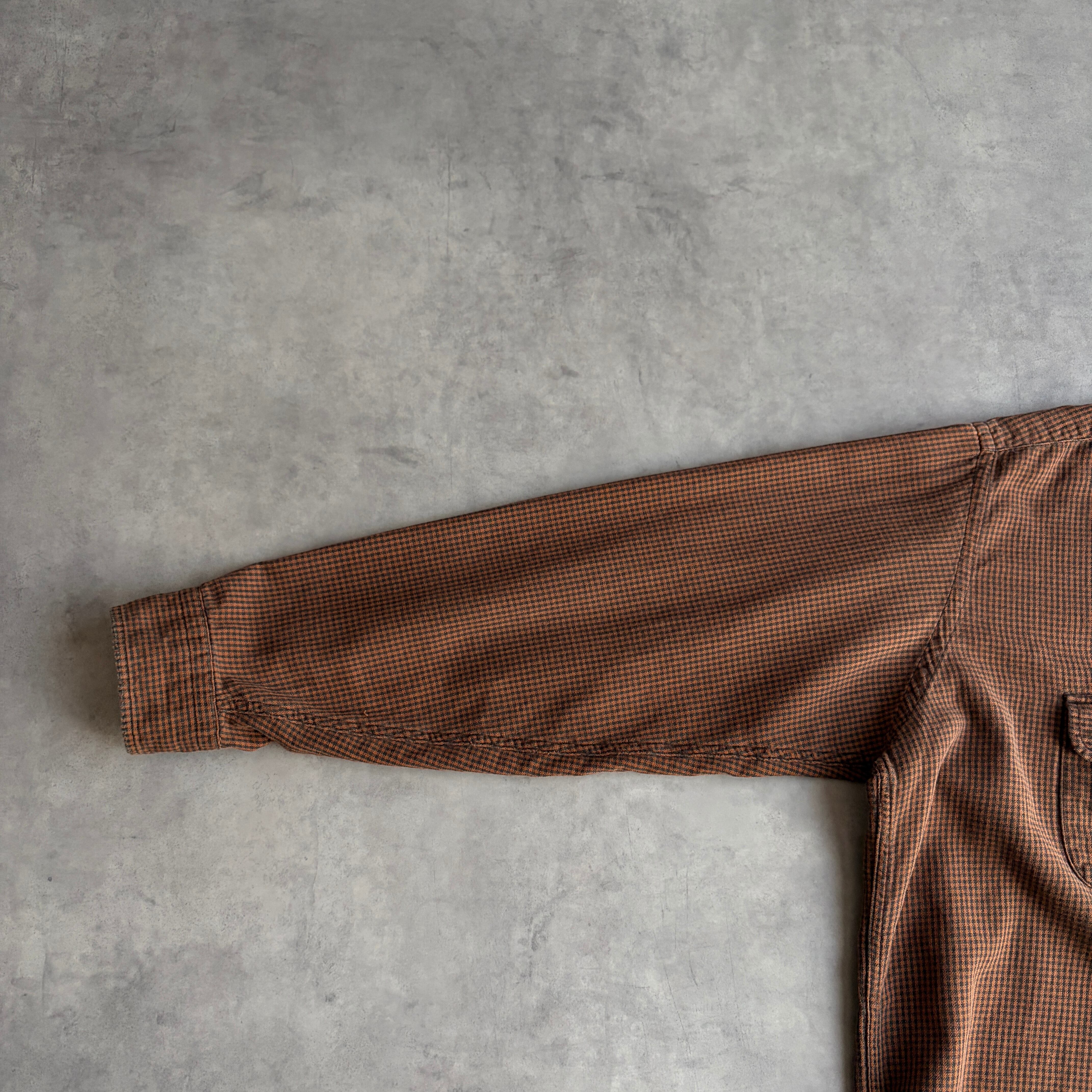 ブラックとブラウンの好配色ギンガムチェックにフラップポケット、薄手で柔らかい生地。