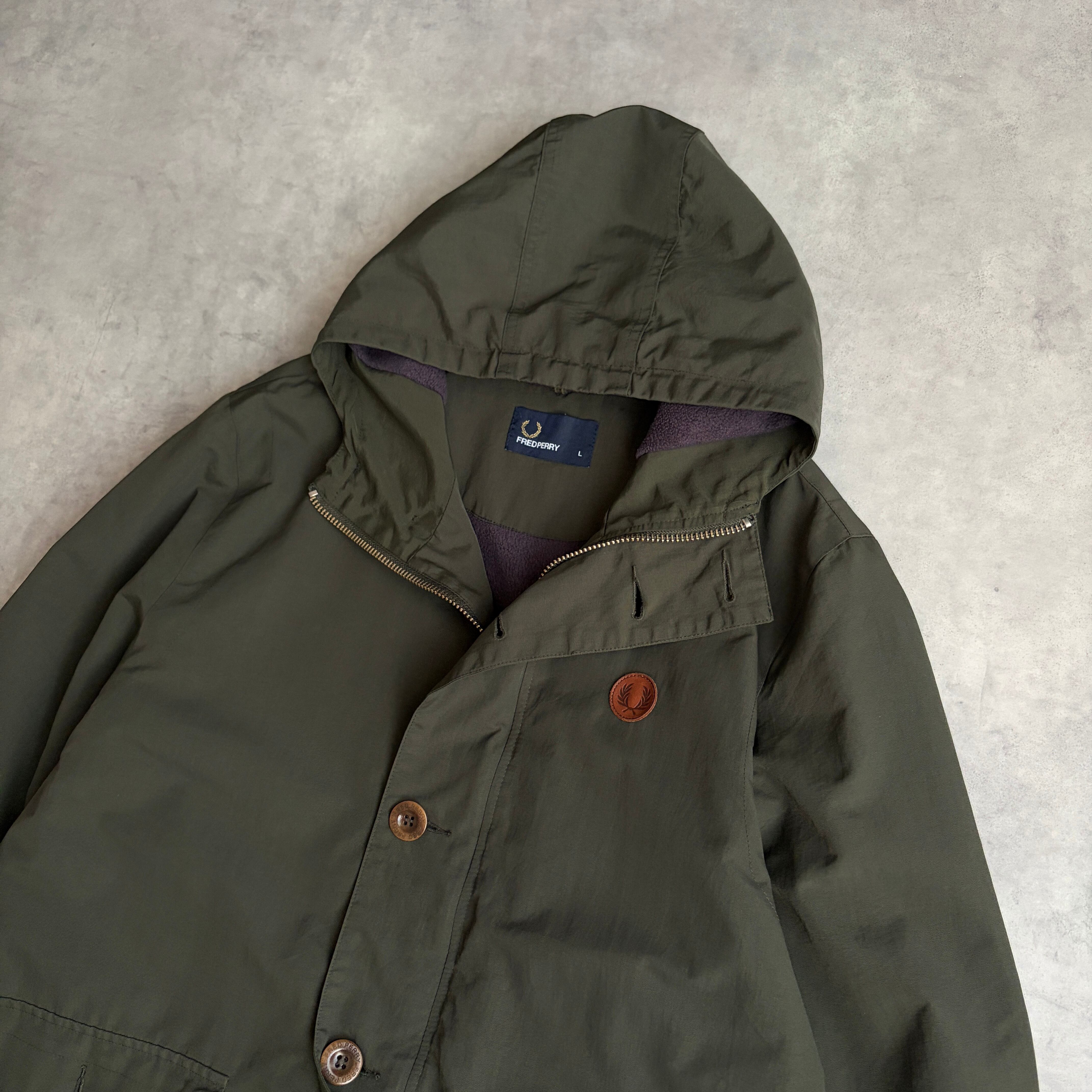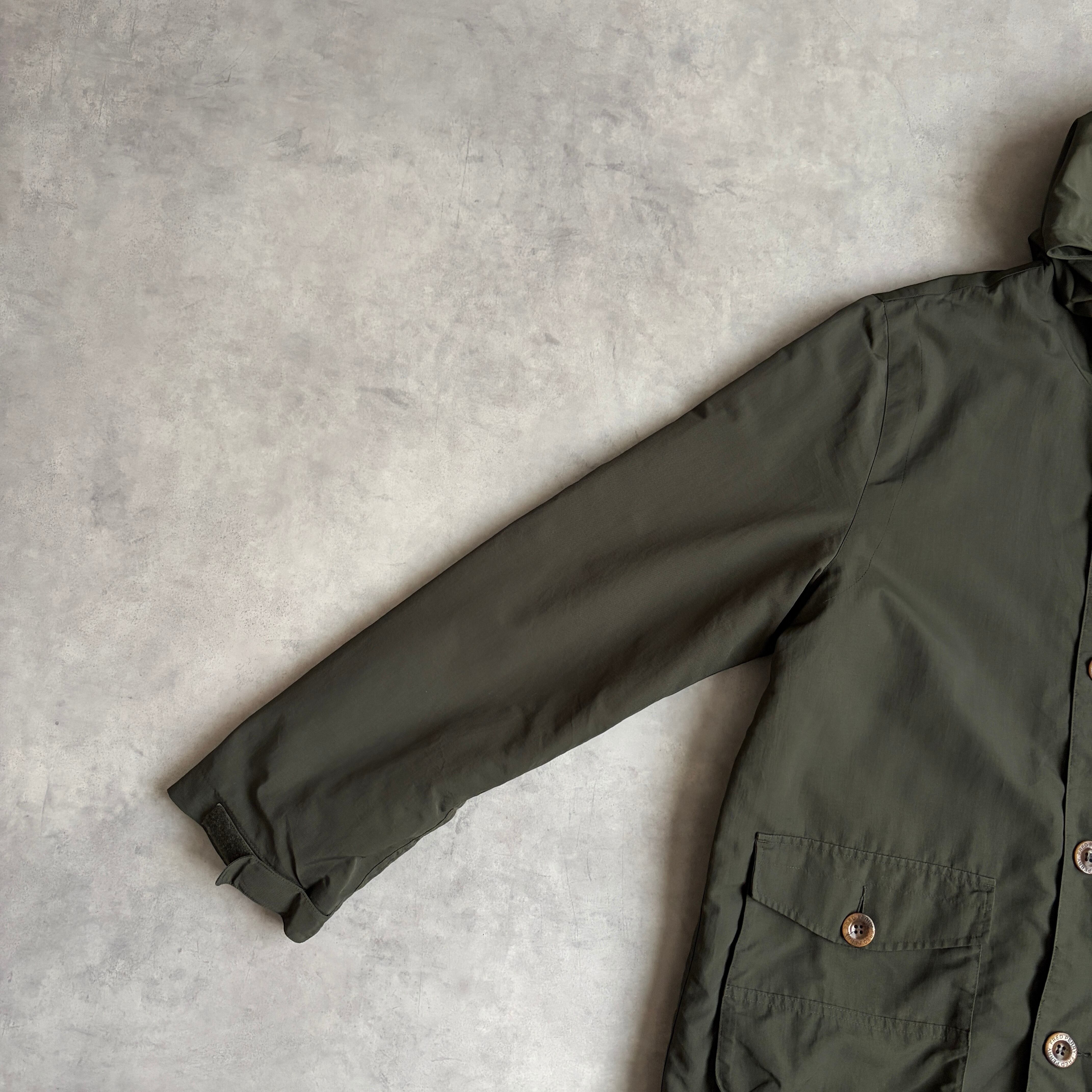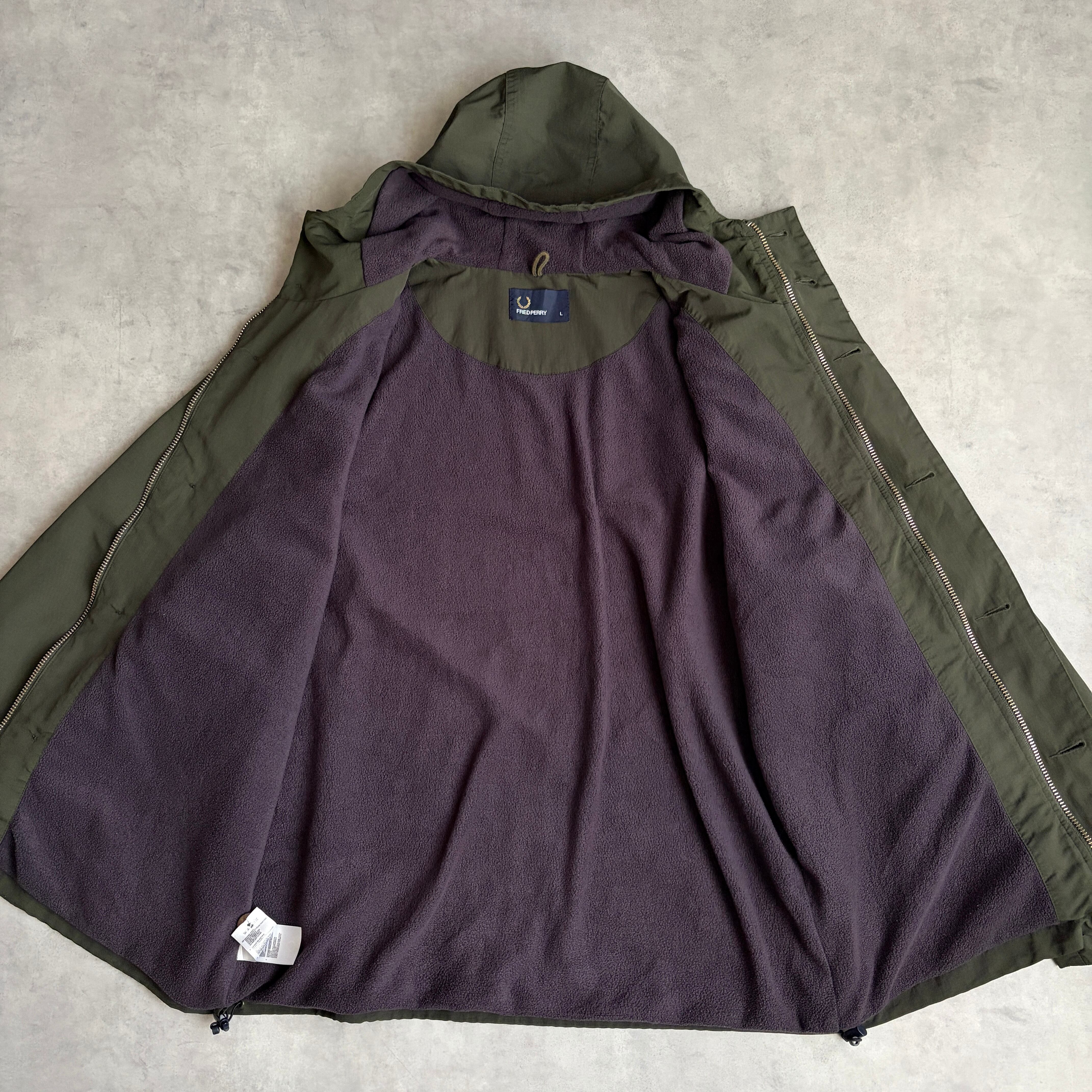ダブルジップに比翼フロント、袖リブに裾ドローコード付き。