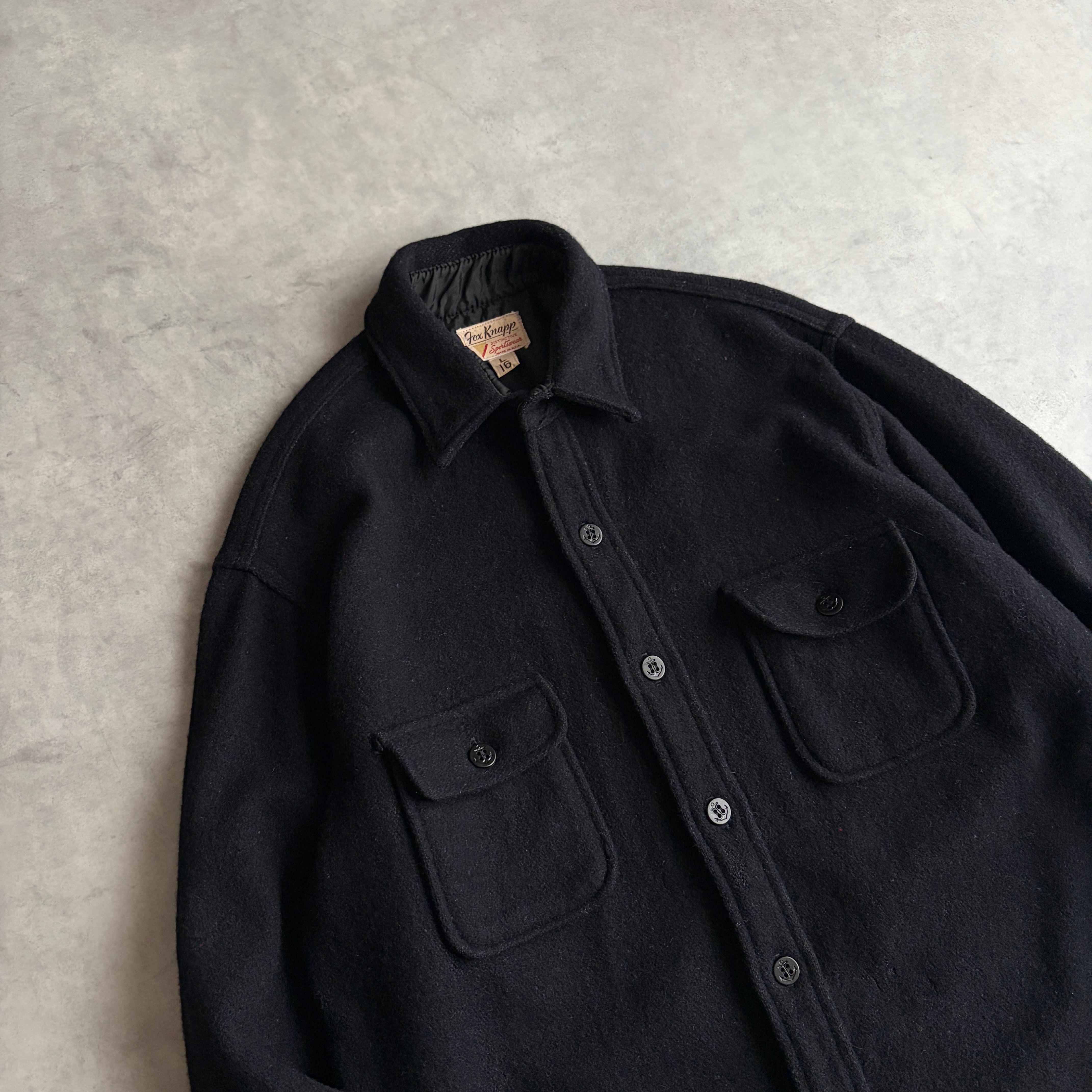 60s/Fox Knapp/フォックス・ナップ/CPO/無地/ソリッド/ノームコア/ウールシャツジャケット/USA製/アメリカ製/民間品/フラップポケット/サイドスリット/肉厚/フランネル/ダークネイビー/黒紺