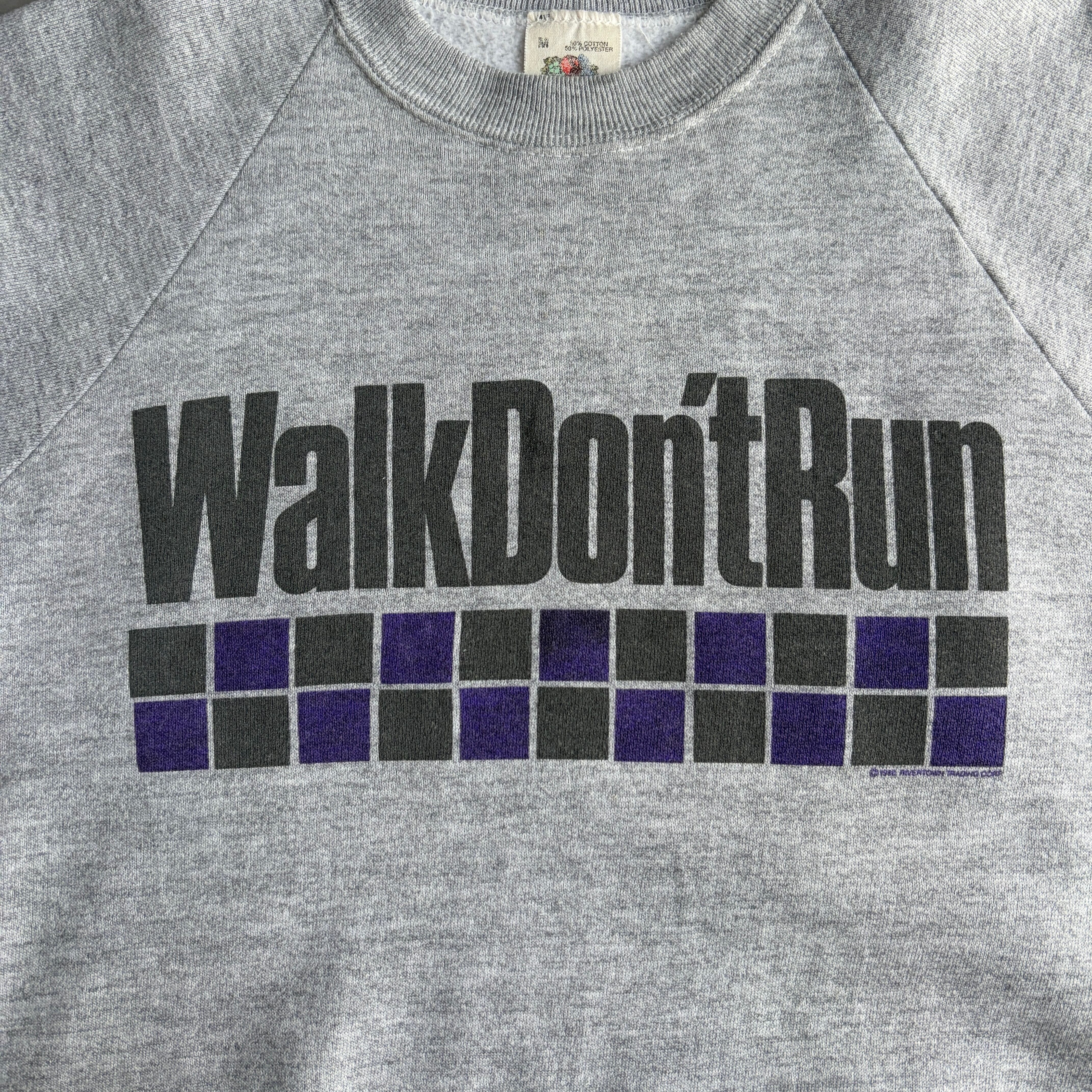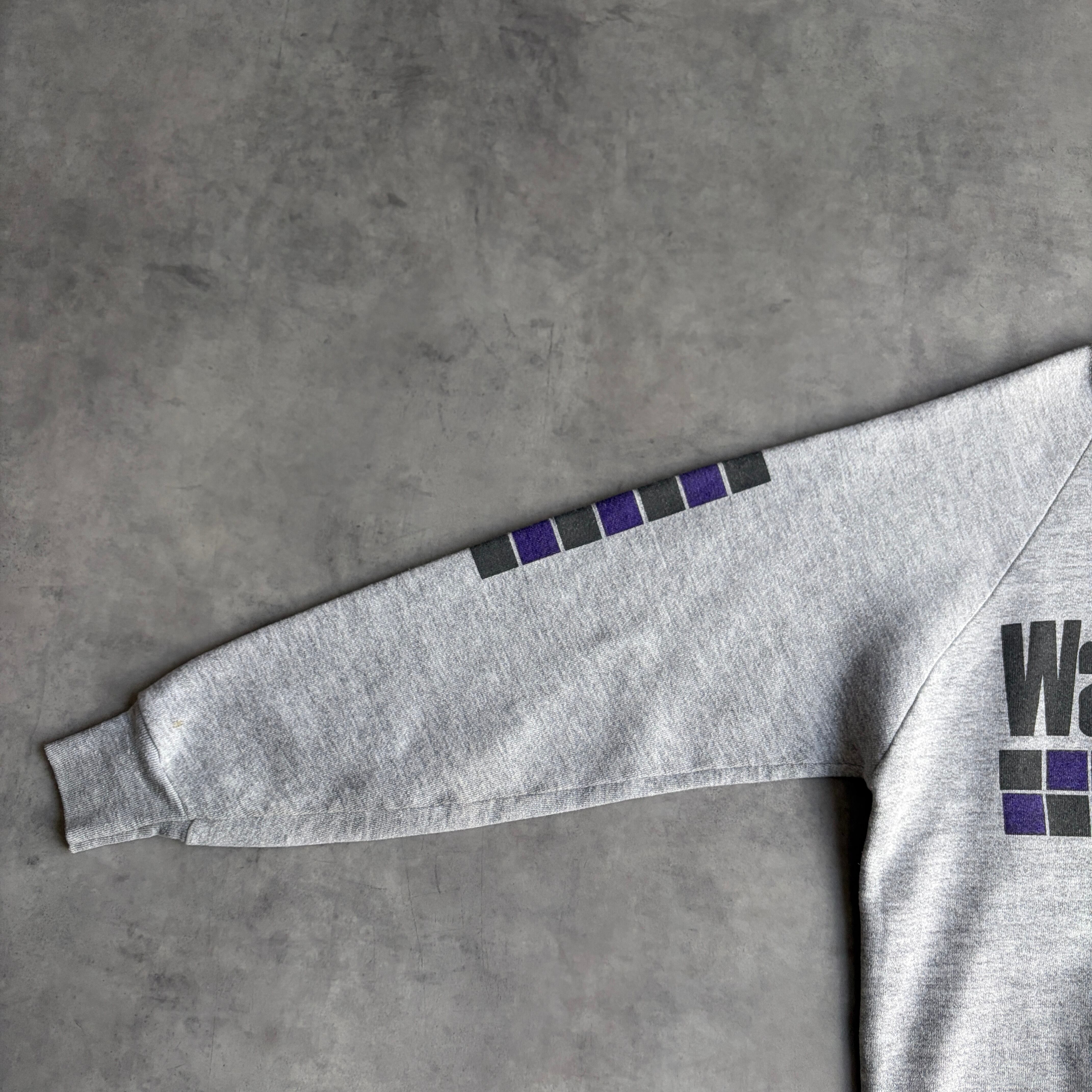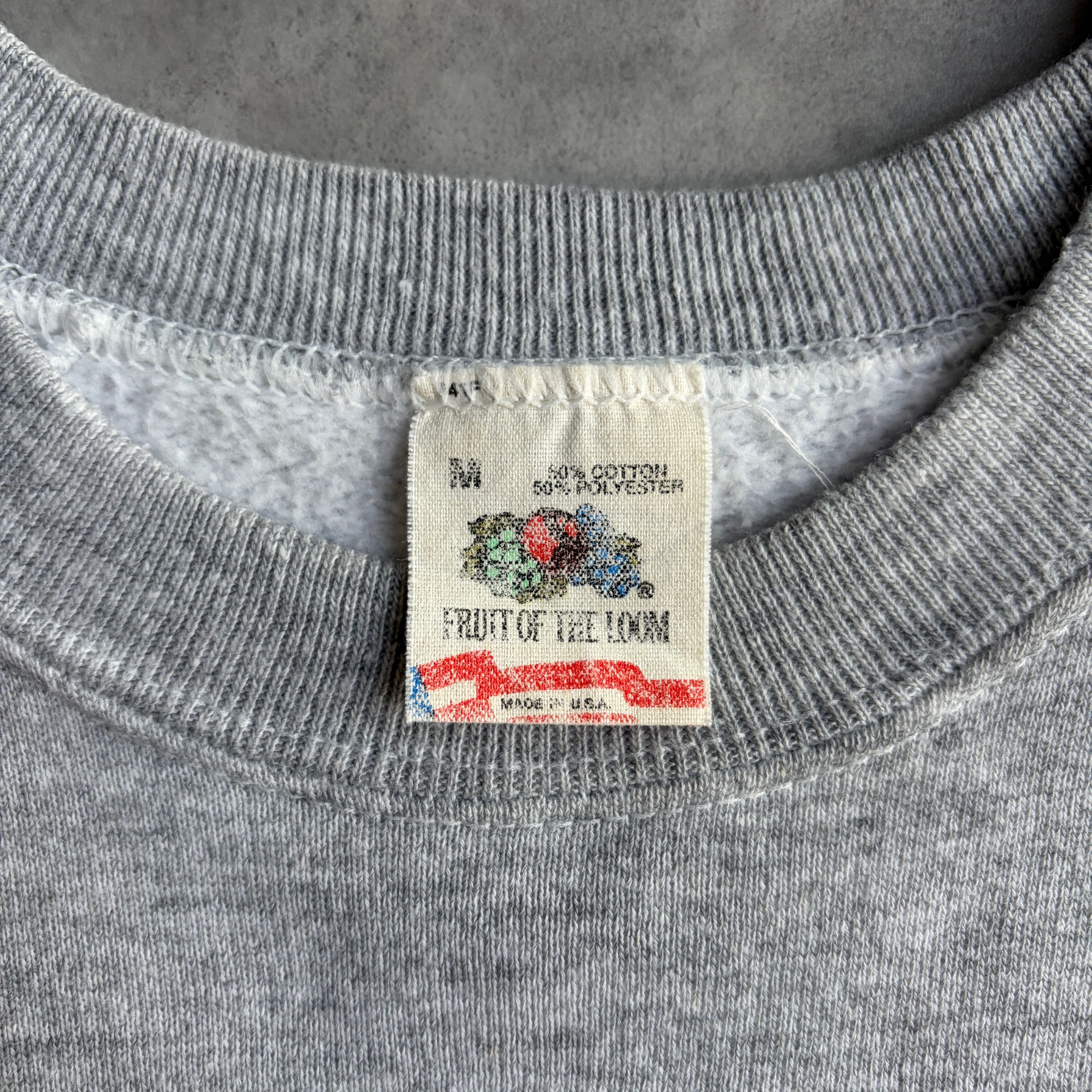 80s/FRUIT OF THE LOOM/フルーツオブザルーム/プリントスウェット/USA製/アメリカ製/ラグランスリーブ/メッセージ/グラフィック/袖プリント/ブラック柄/リフレクター/杢グレー