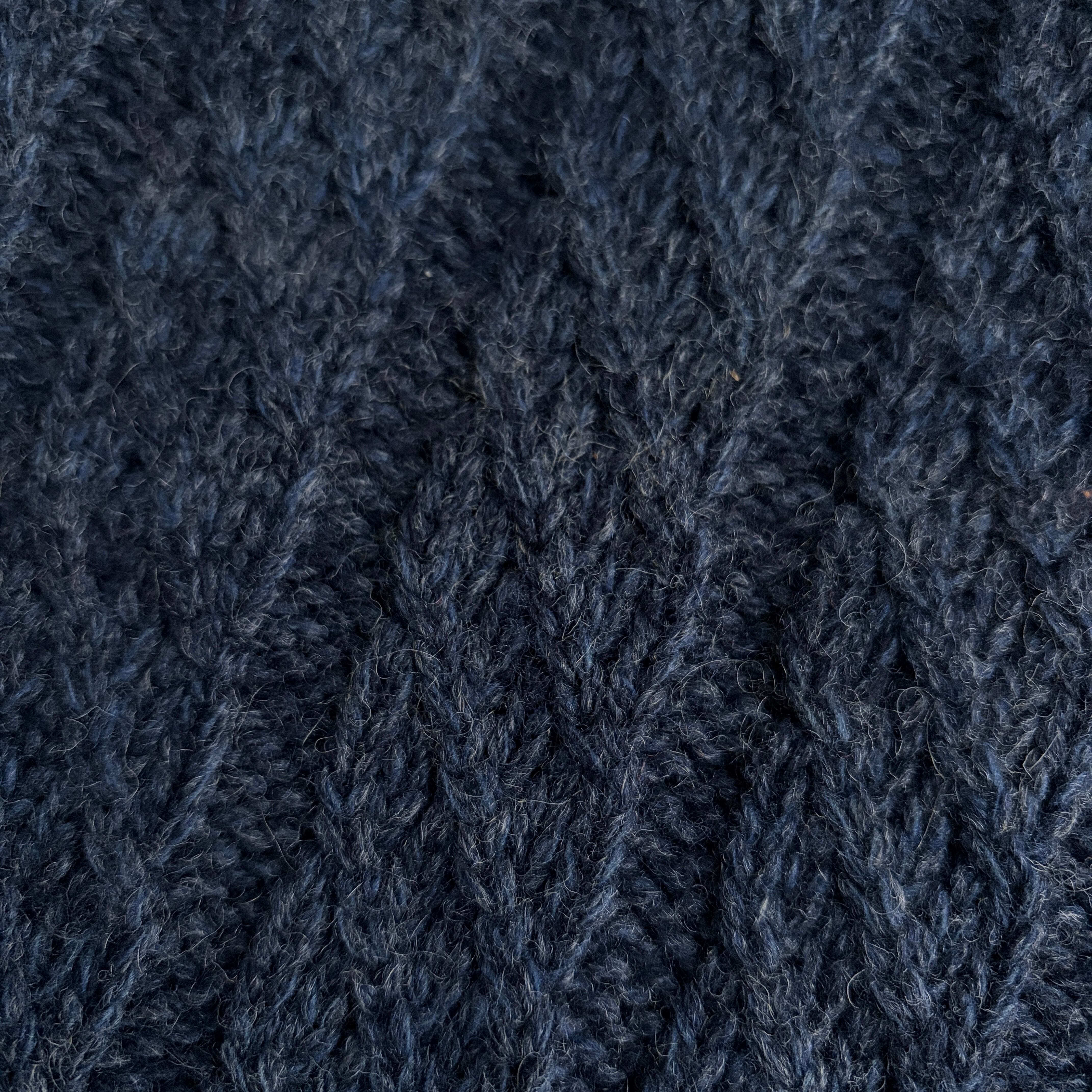 かすんだネイビーカラーのメランジ生地に立体感のある編み方がいいですね。