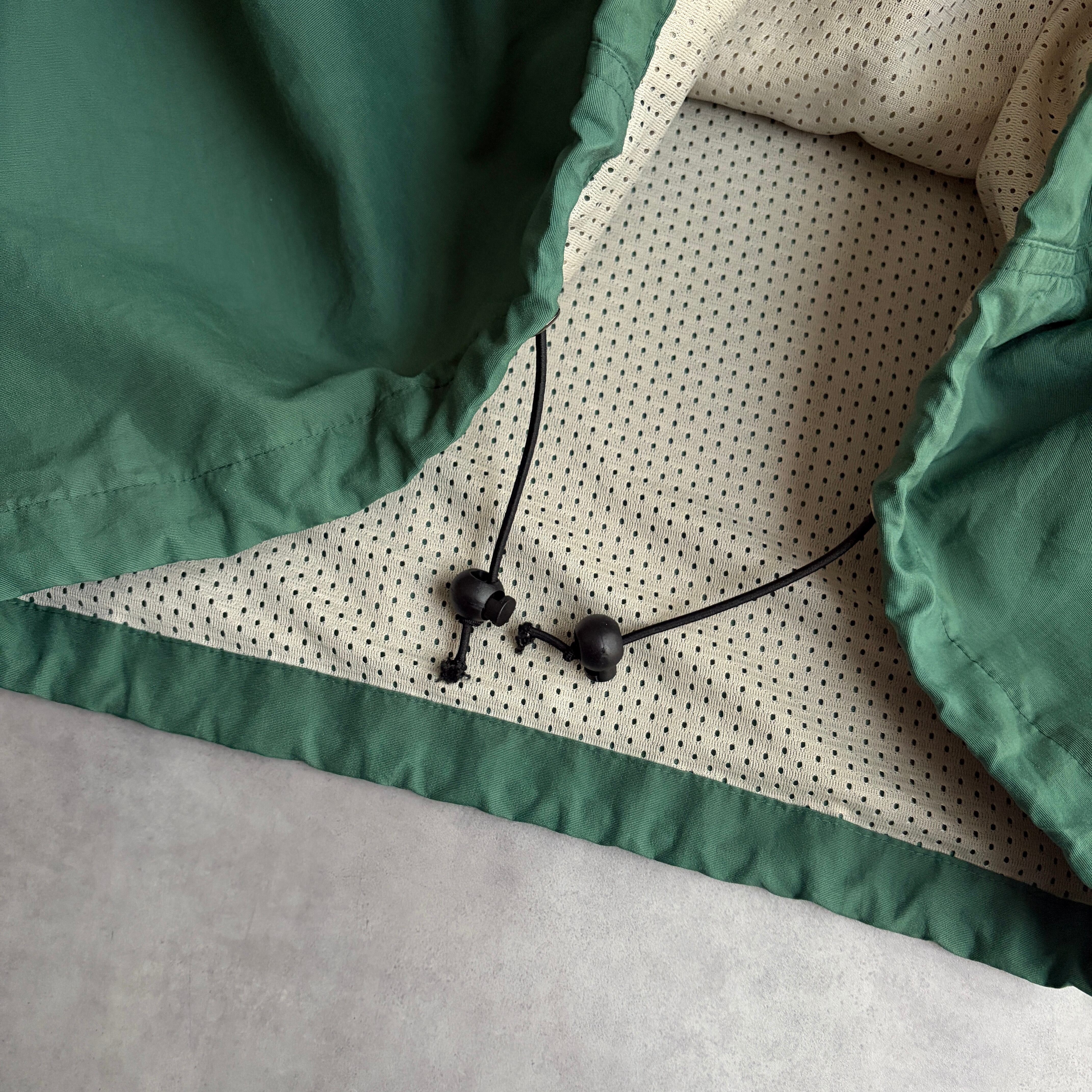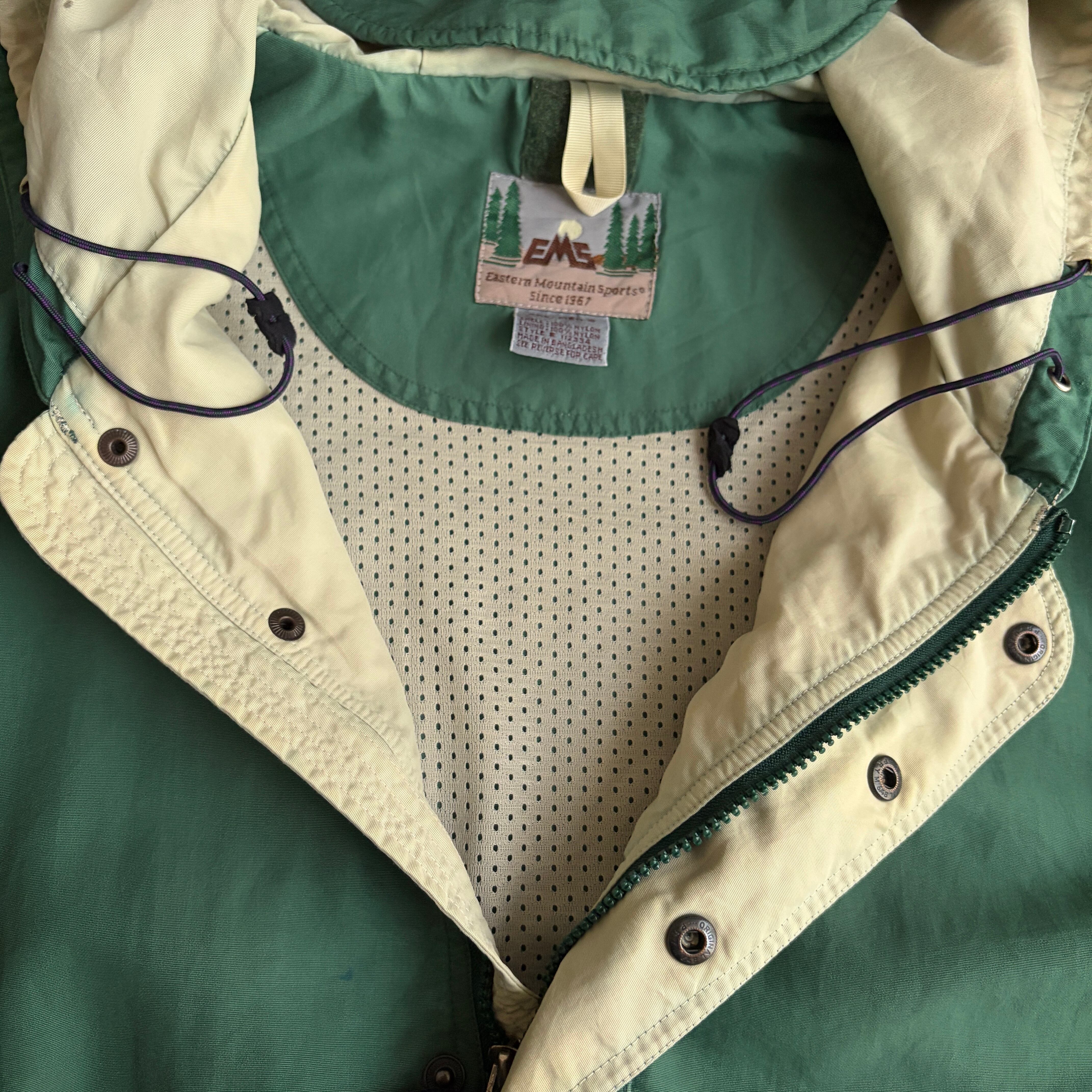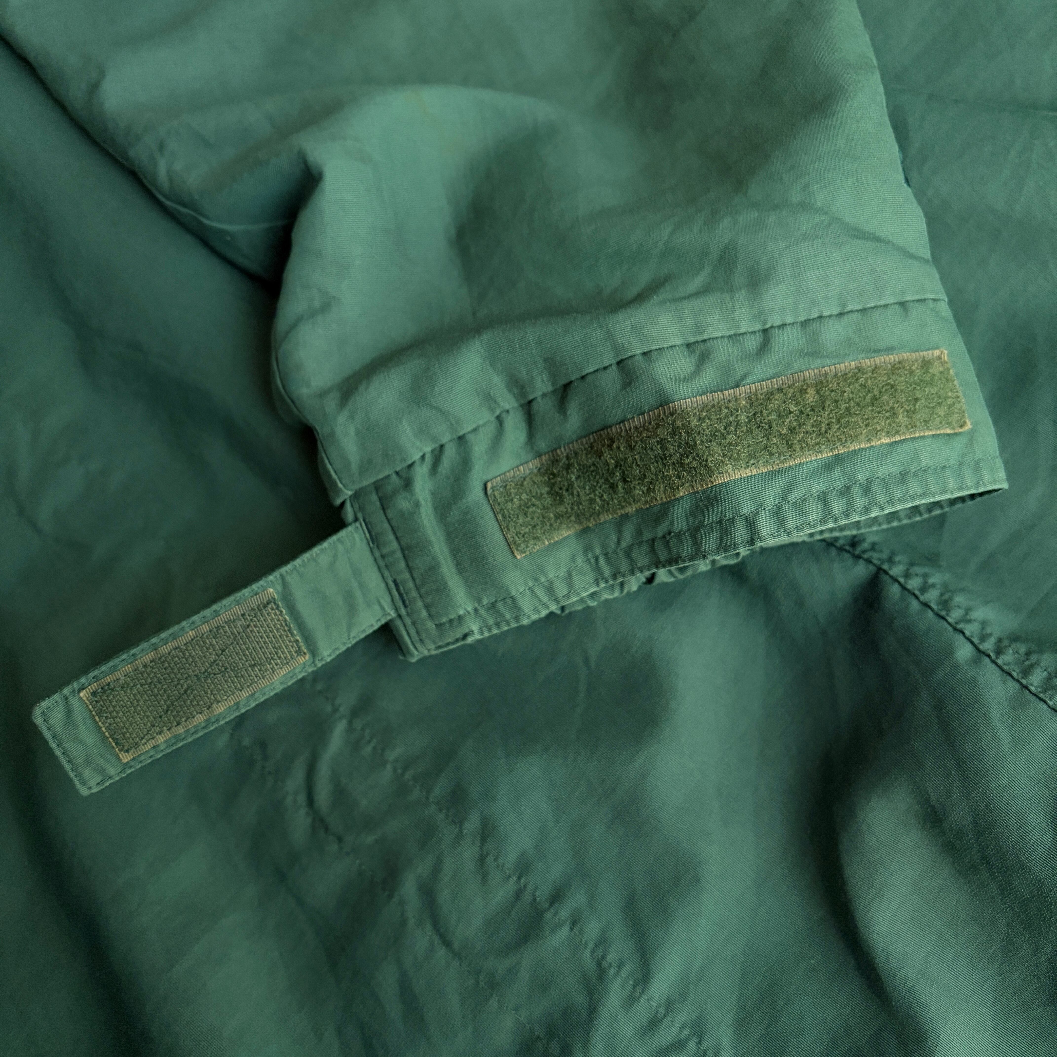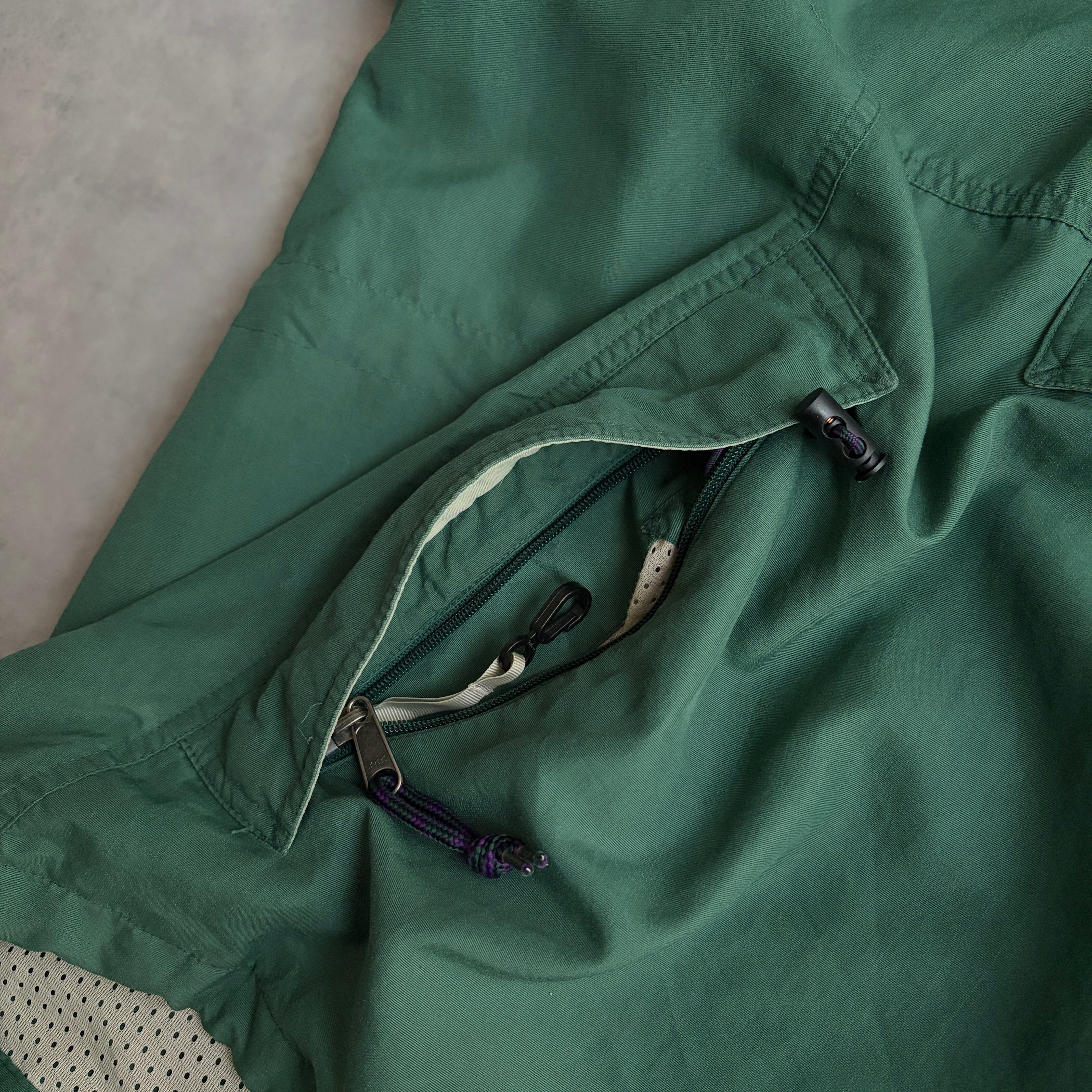 比翼フロントにスナップボタンとハーフジップ、腹部のポケットにカンガルーポケットの中にはカラビナと腰ドローコード、裾にはドローコード付き。