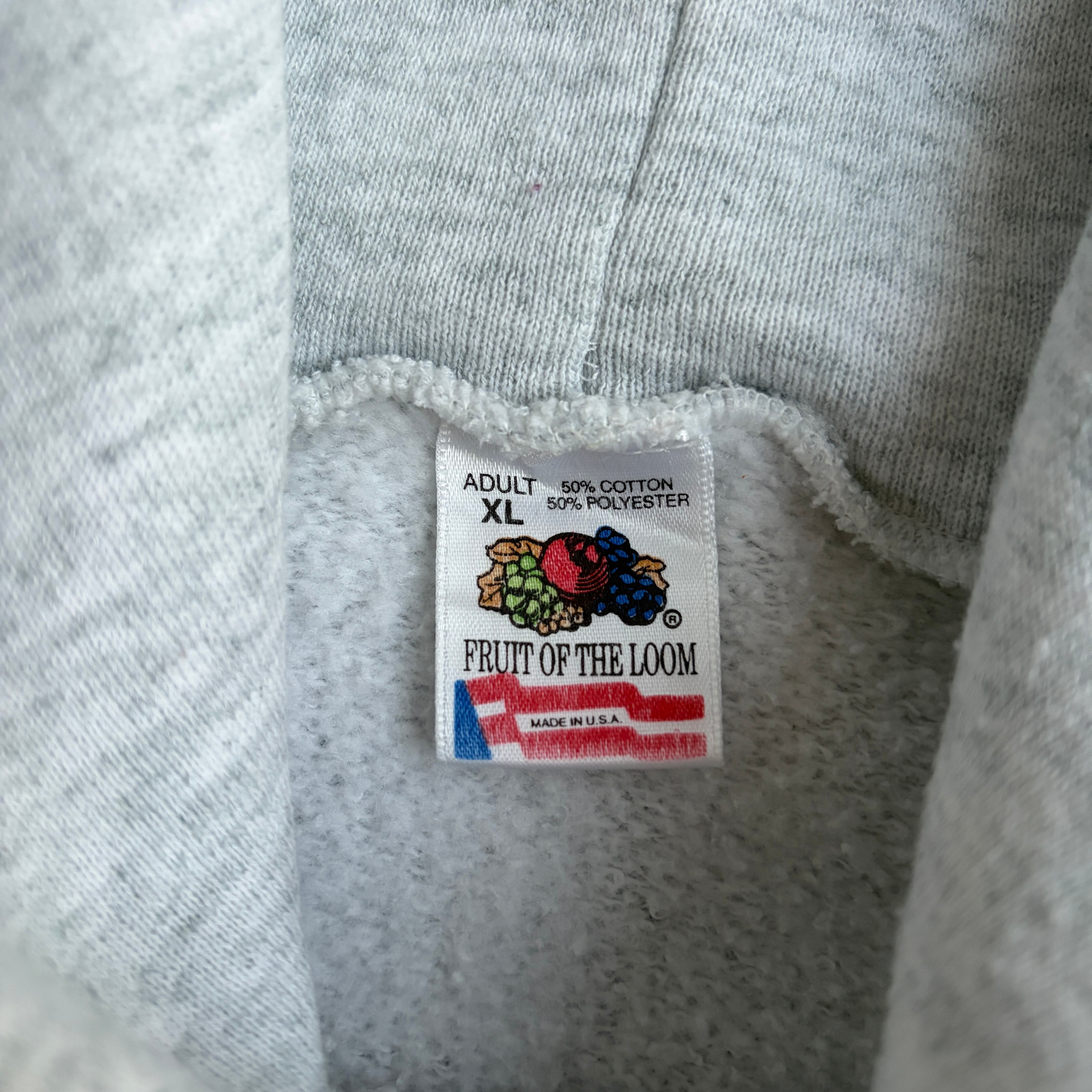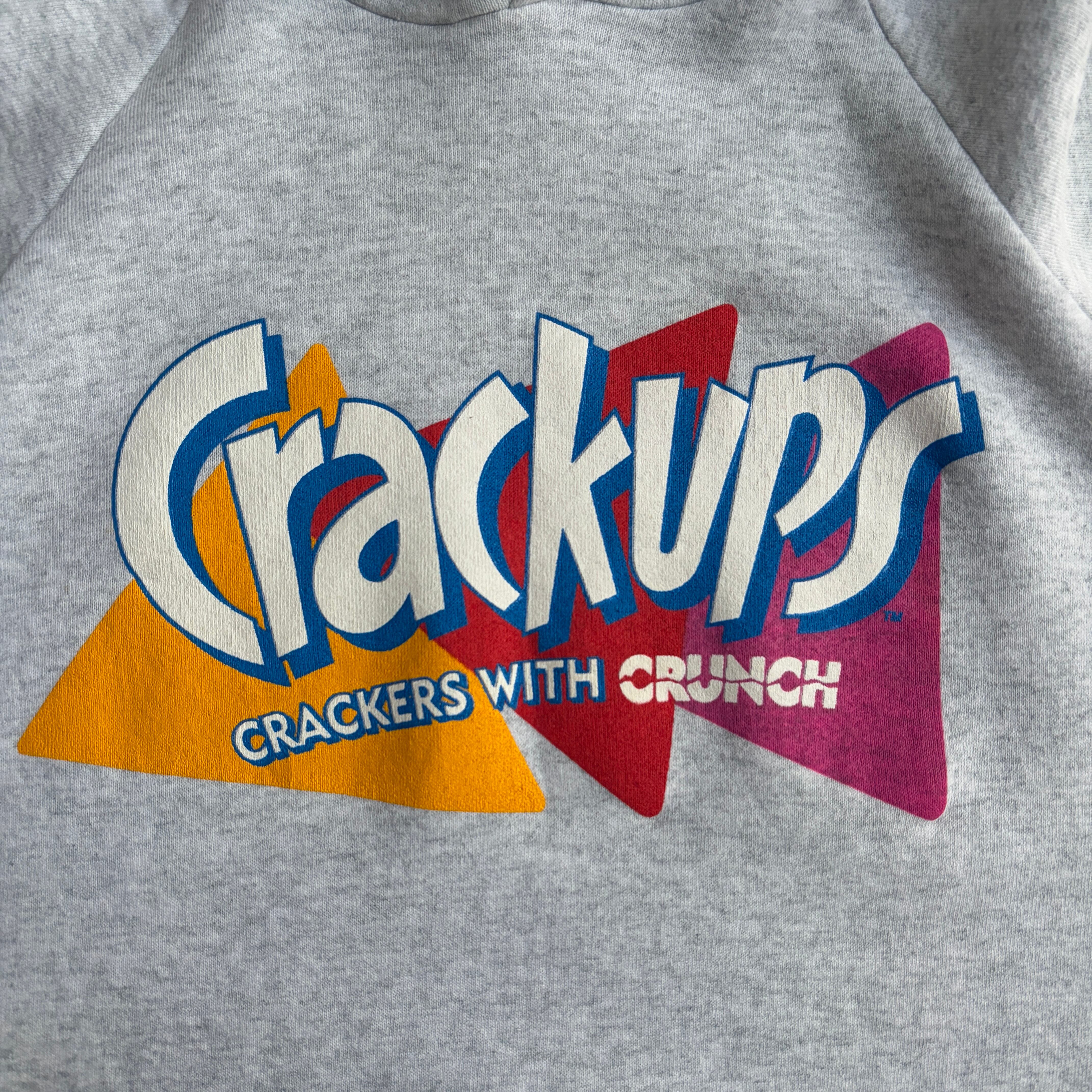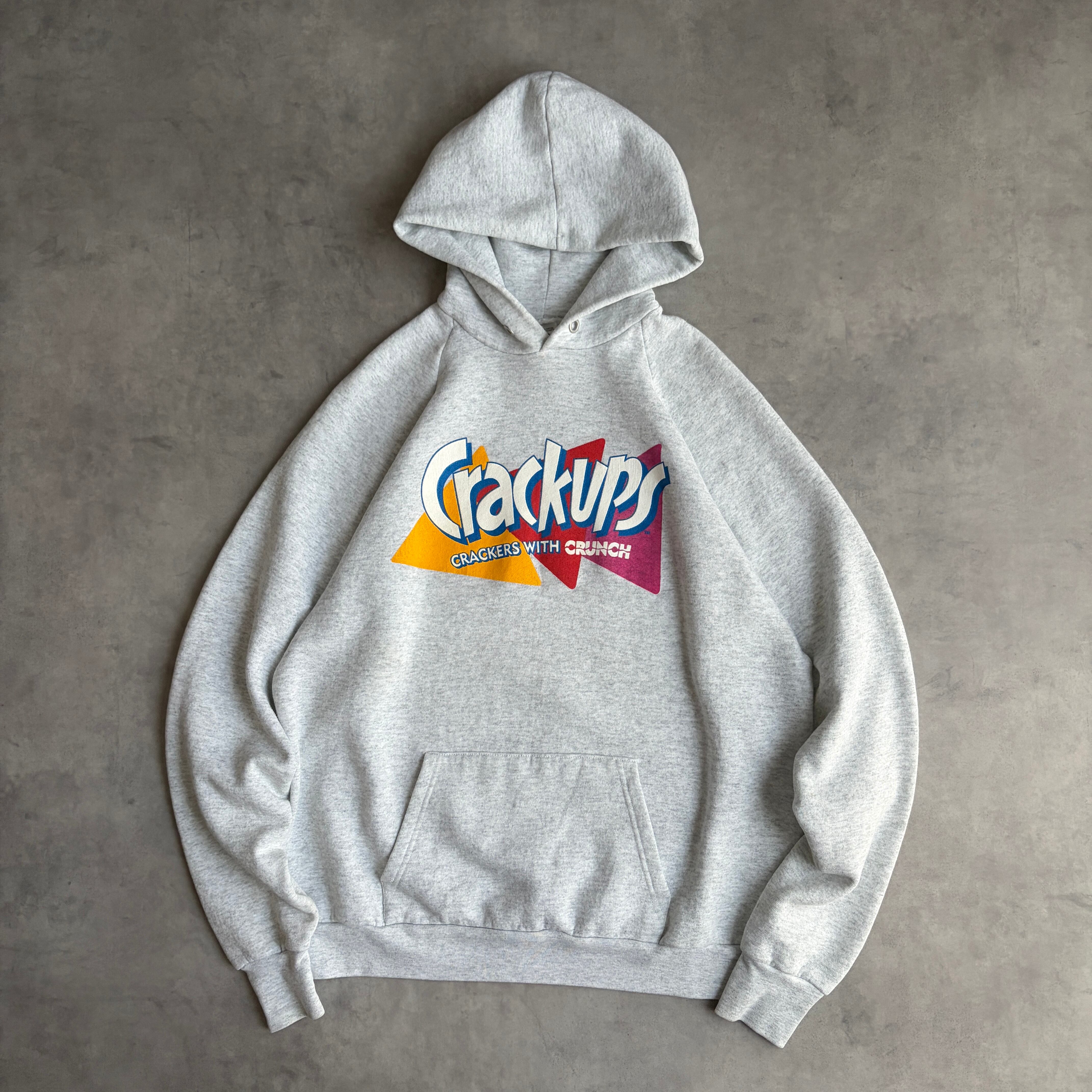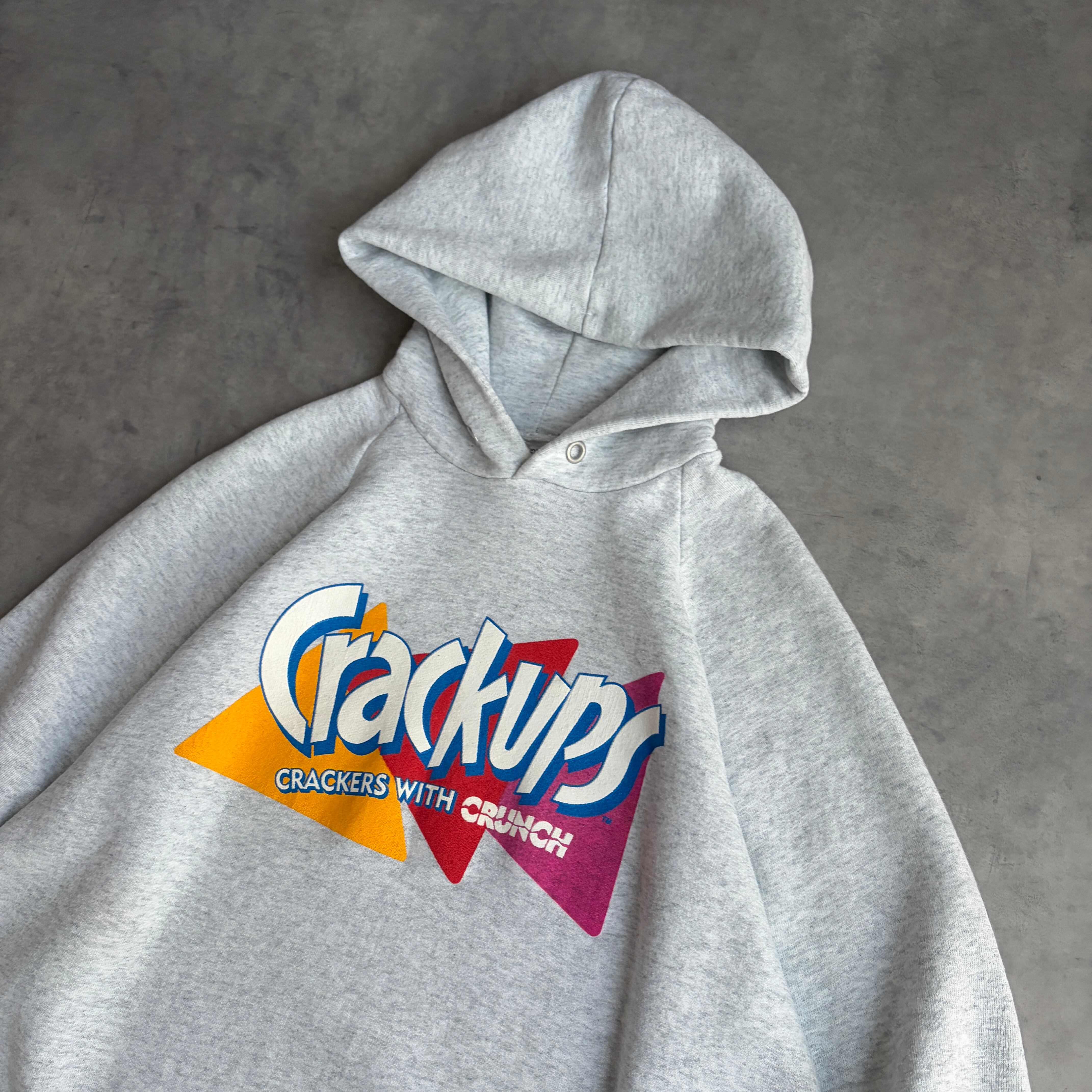 90s/FRUIT OF THE LOOM/フルーツオブザルーム/プルオーバーパーカー/USA製/アメリカ製/ポップデザインプリント/食品プロモーション/お菓子/スナック/Crackups/ラグランスリーブ/グレー