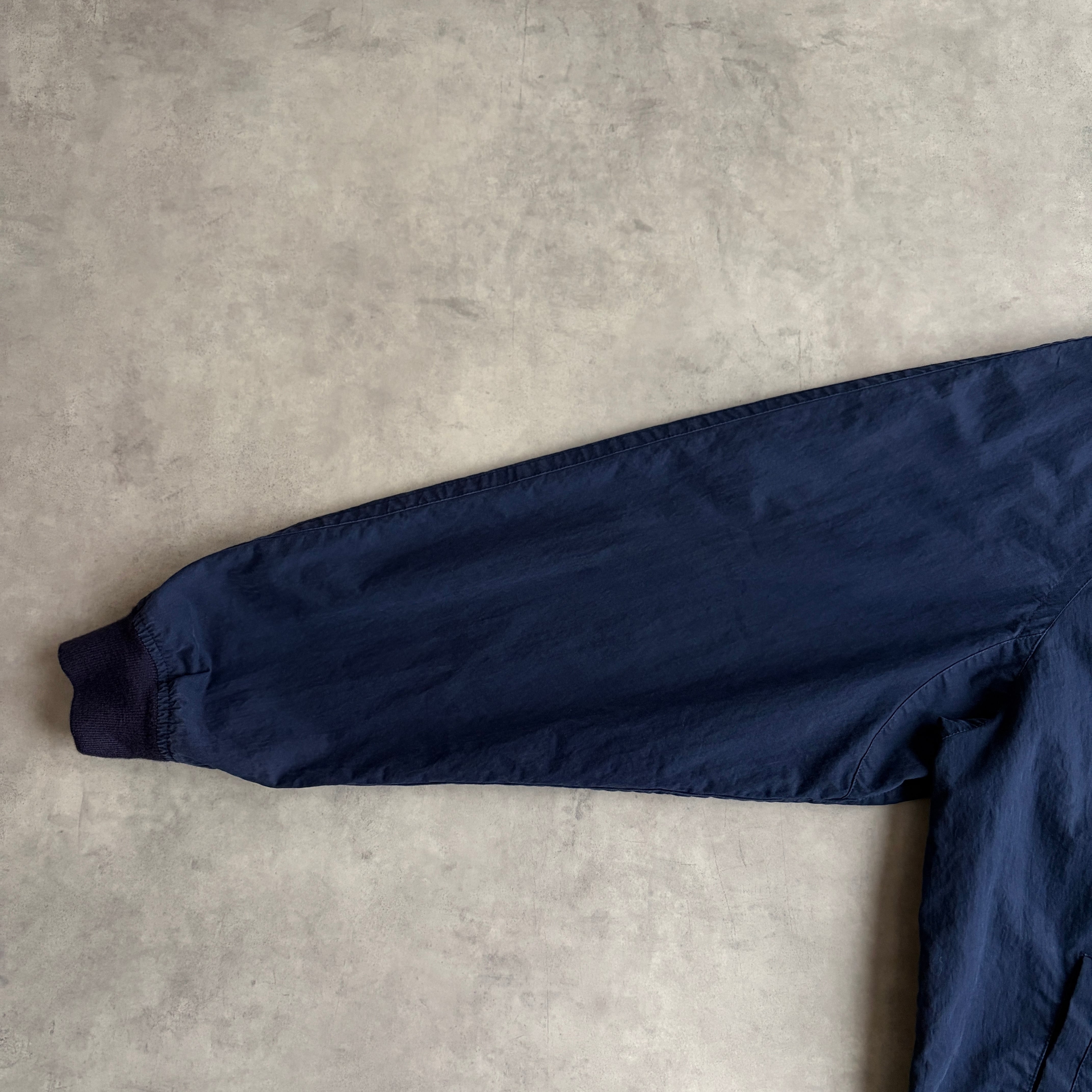 MA-1のようなデザインにコットンナイロンのマットな生地感、ロゴ刻印チャーム、胸元には筆記体ロゴの同色刺繍が入っています。