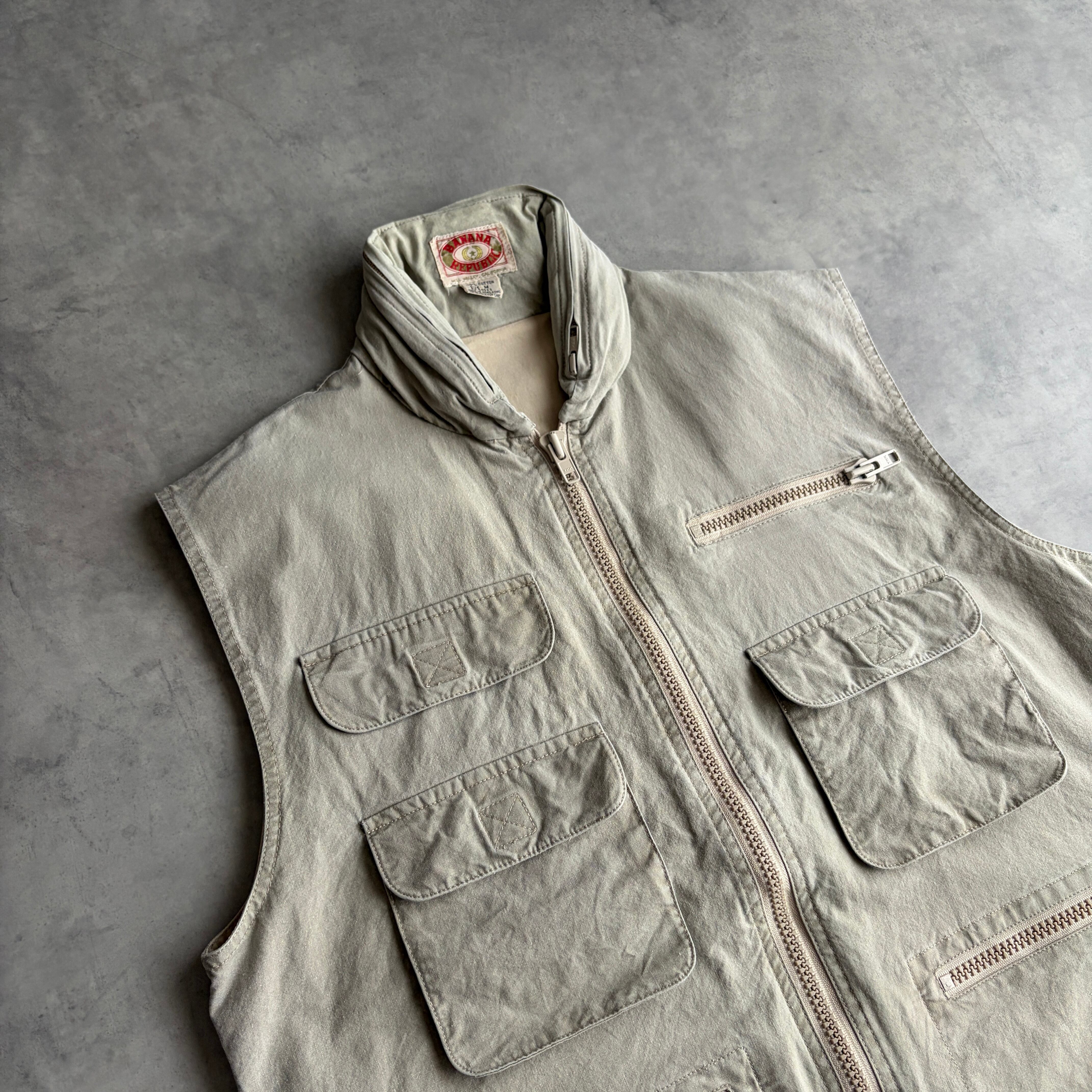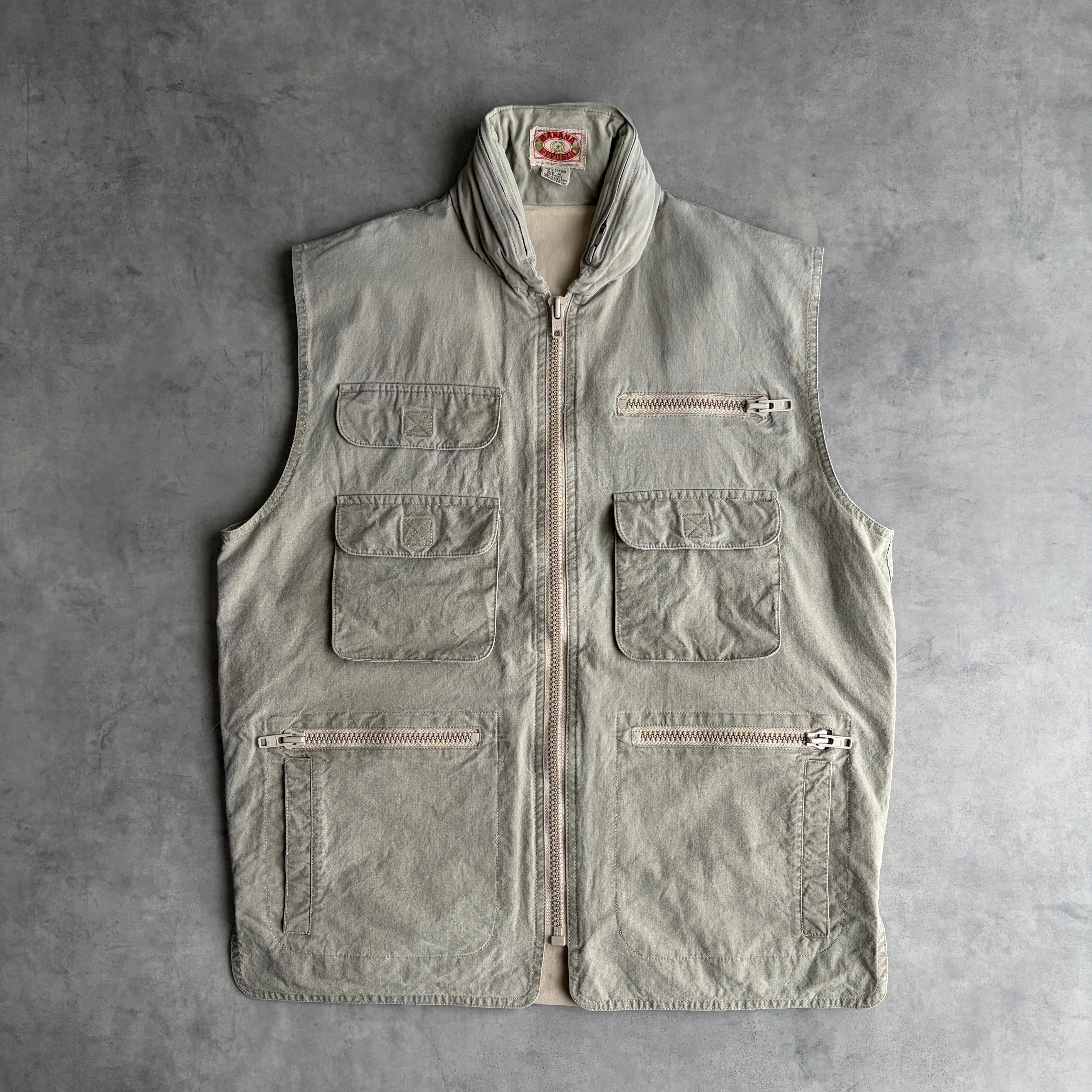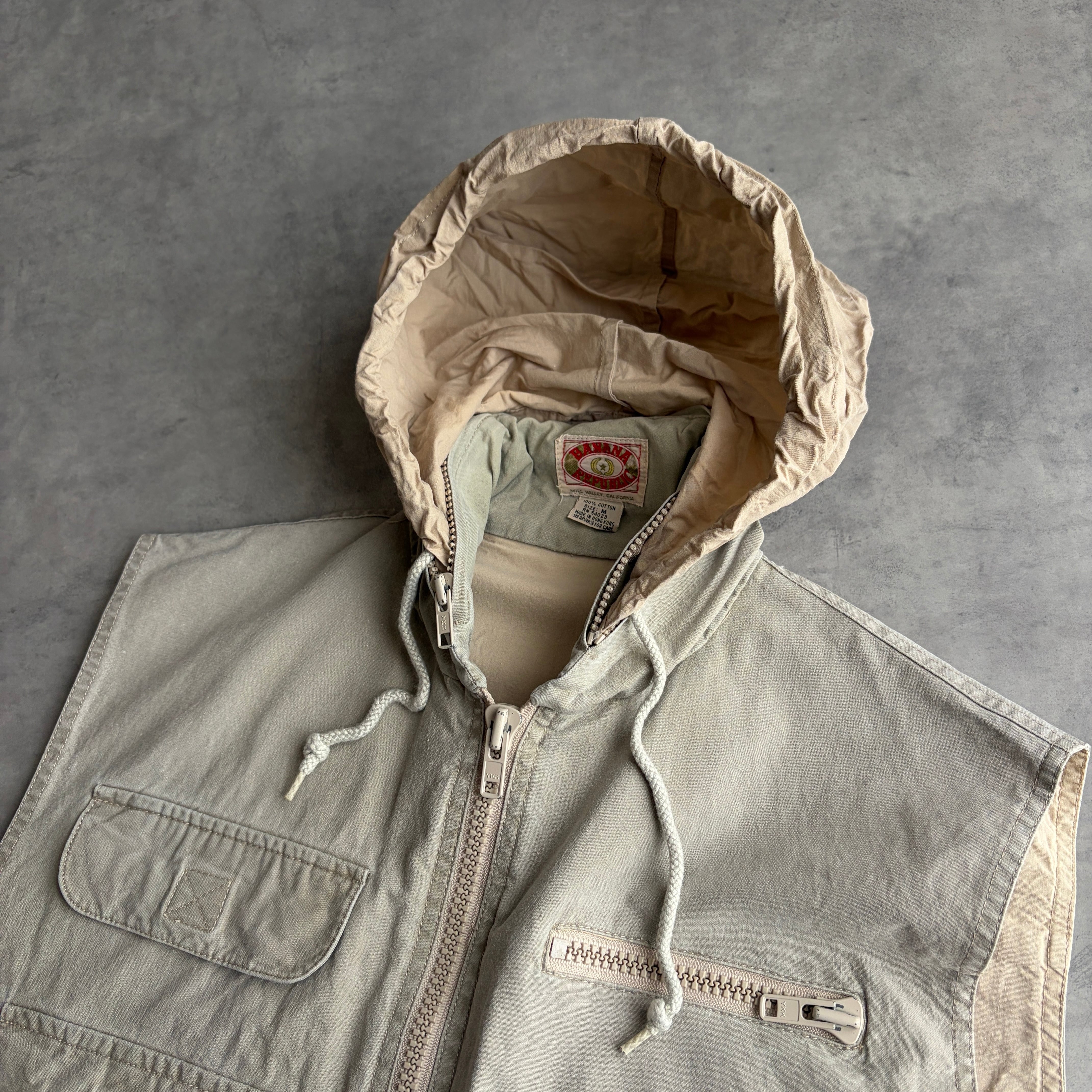 80s/BANANA REPUBLIC/バナナリパブリック/ハンティングベスト/フィッシング/マルチポケット/フード収納/初期タグ/グレーベージュ