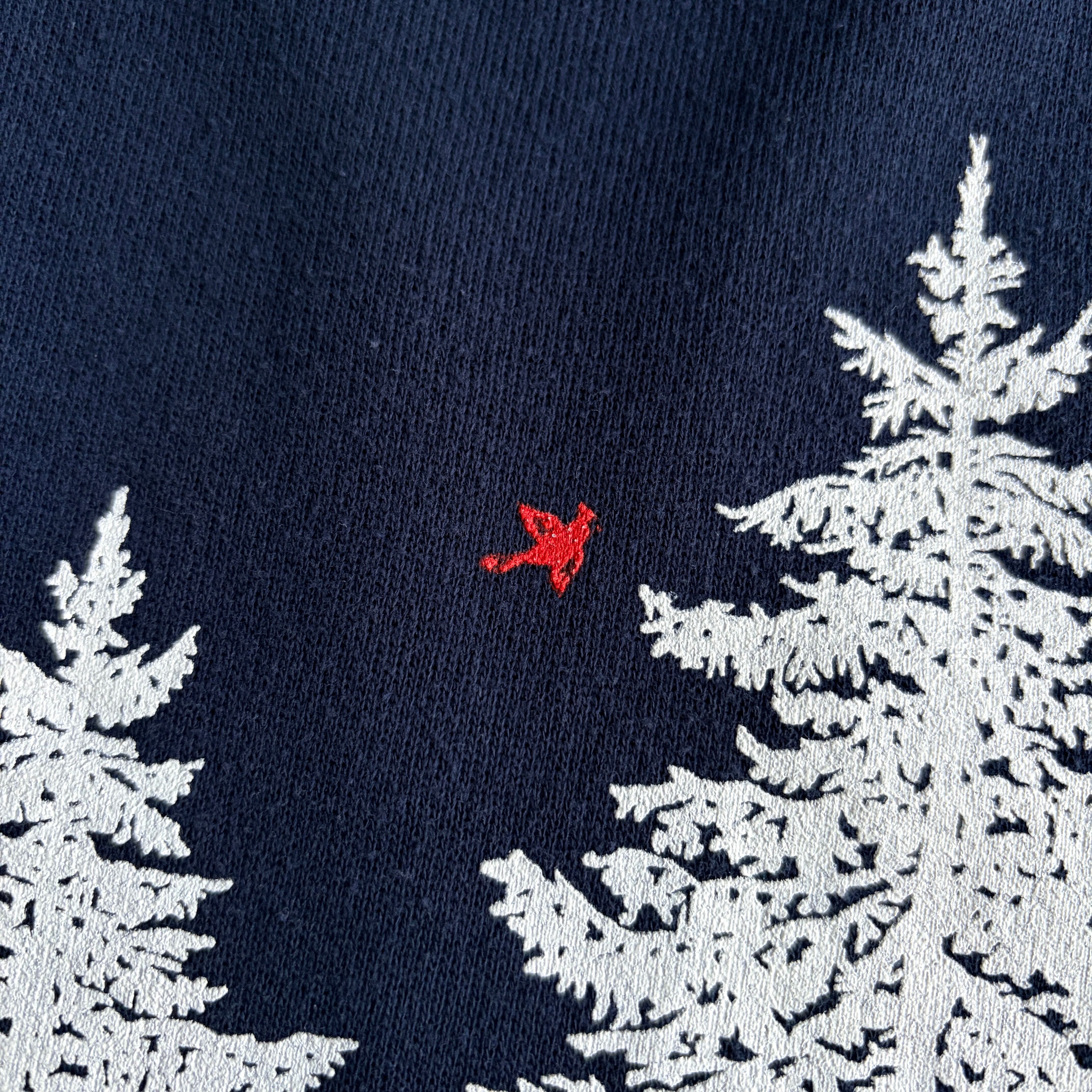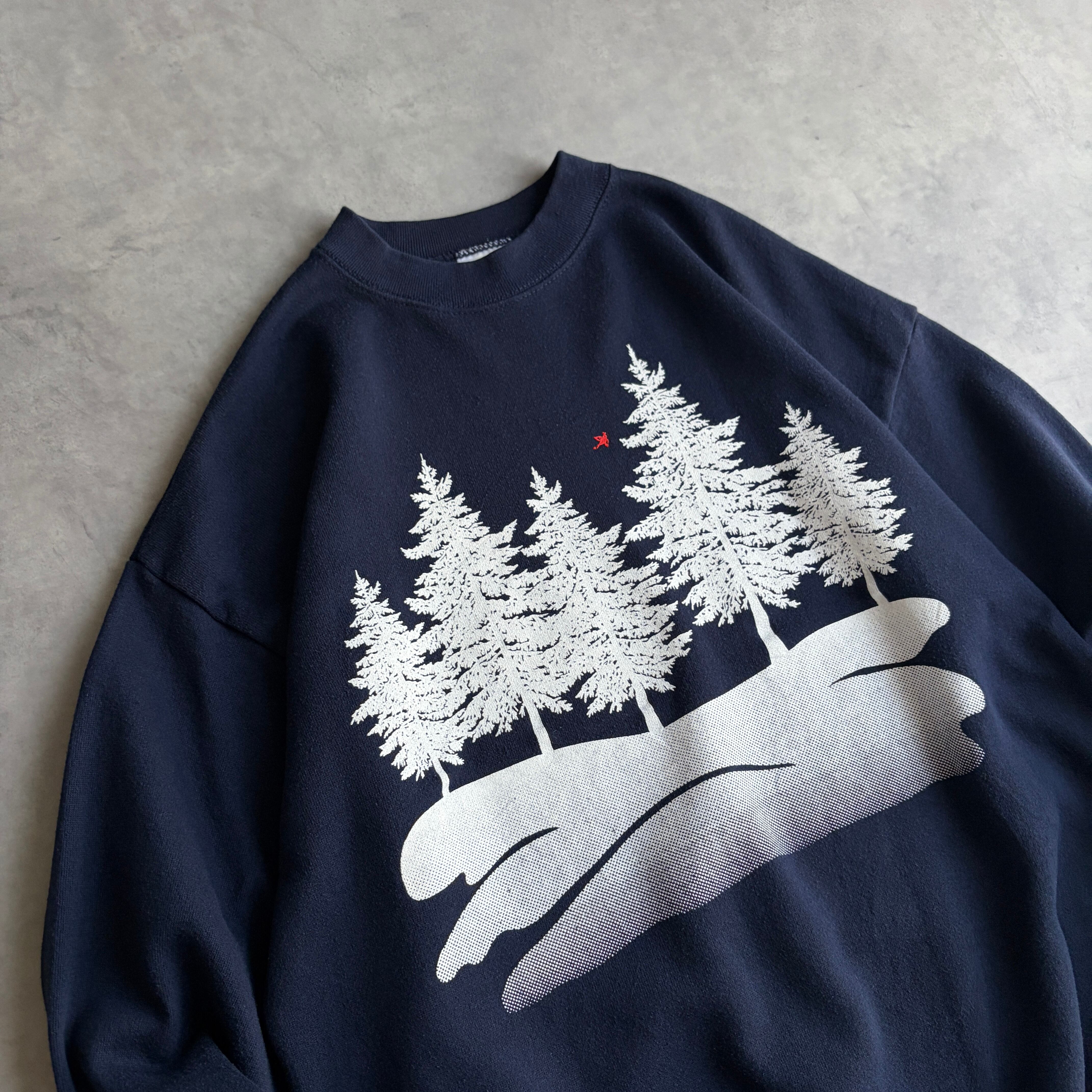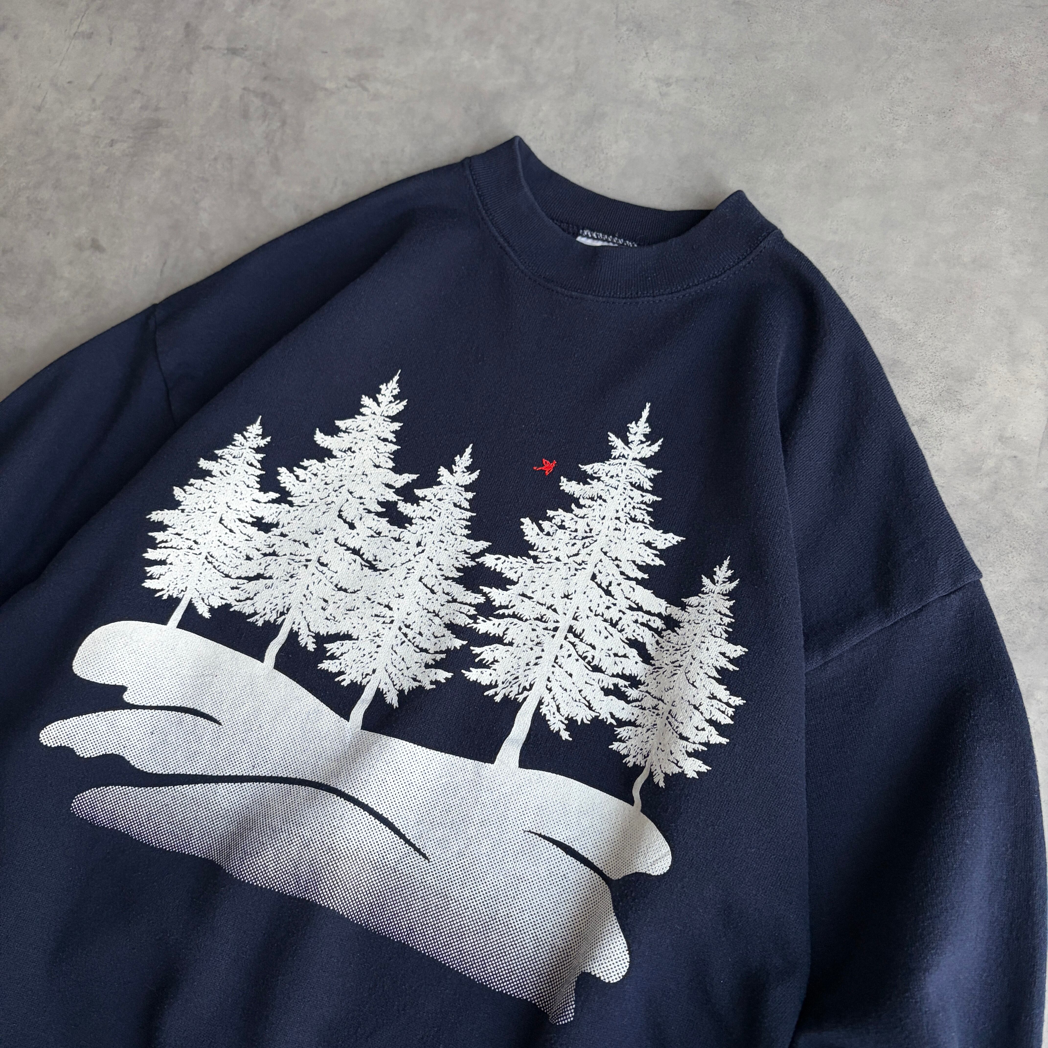 90s/TULTEX/タルテックス/プリントスウェット/USA製/アメリカ製/風景/雪景色/針葉樹林/鳥/カージナル/ネイビー/紺