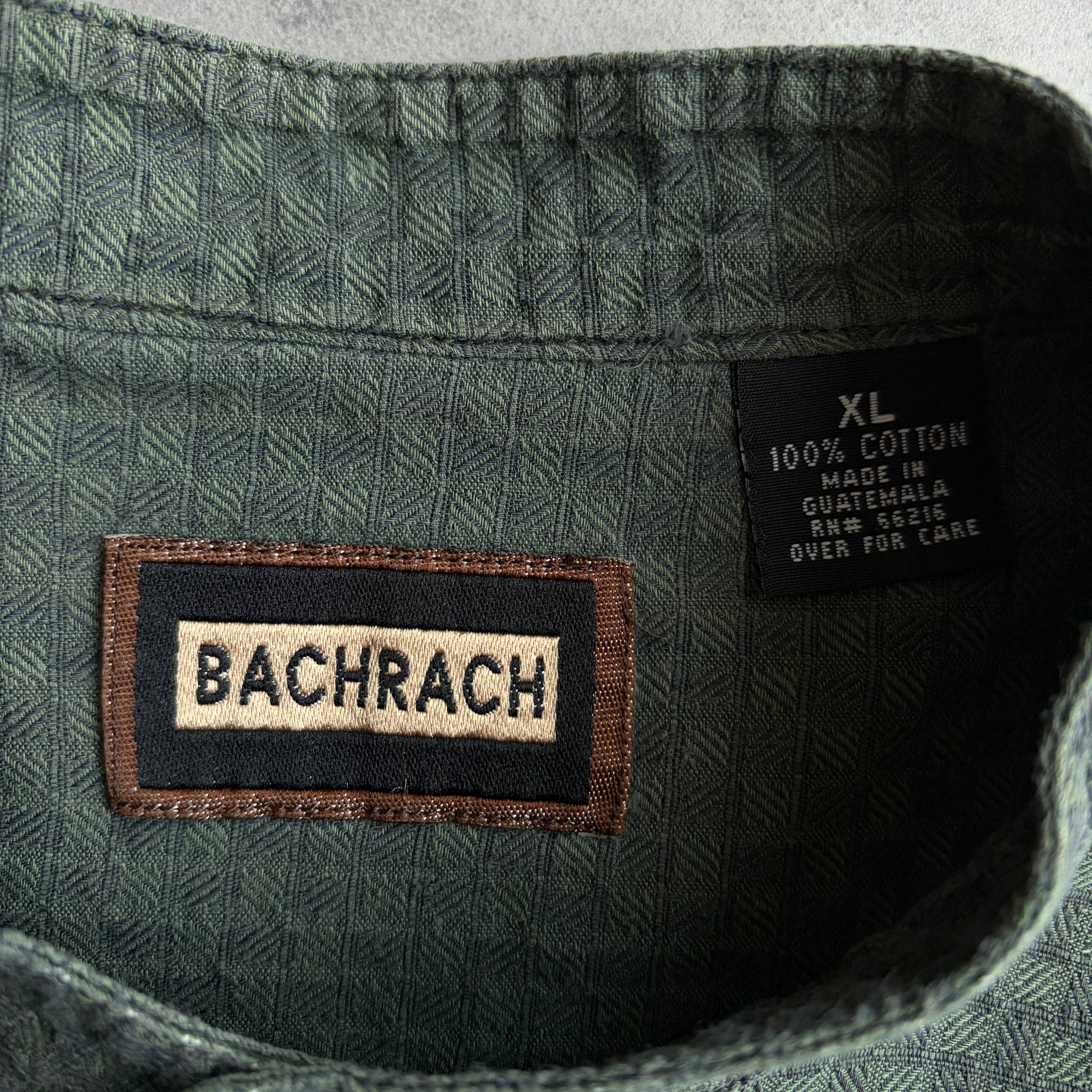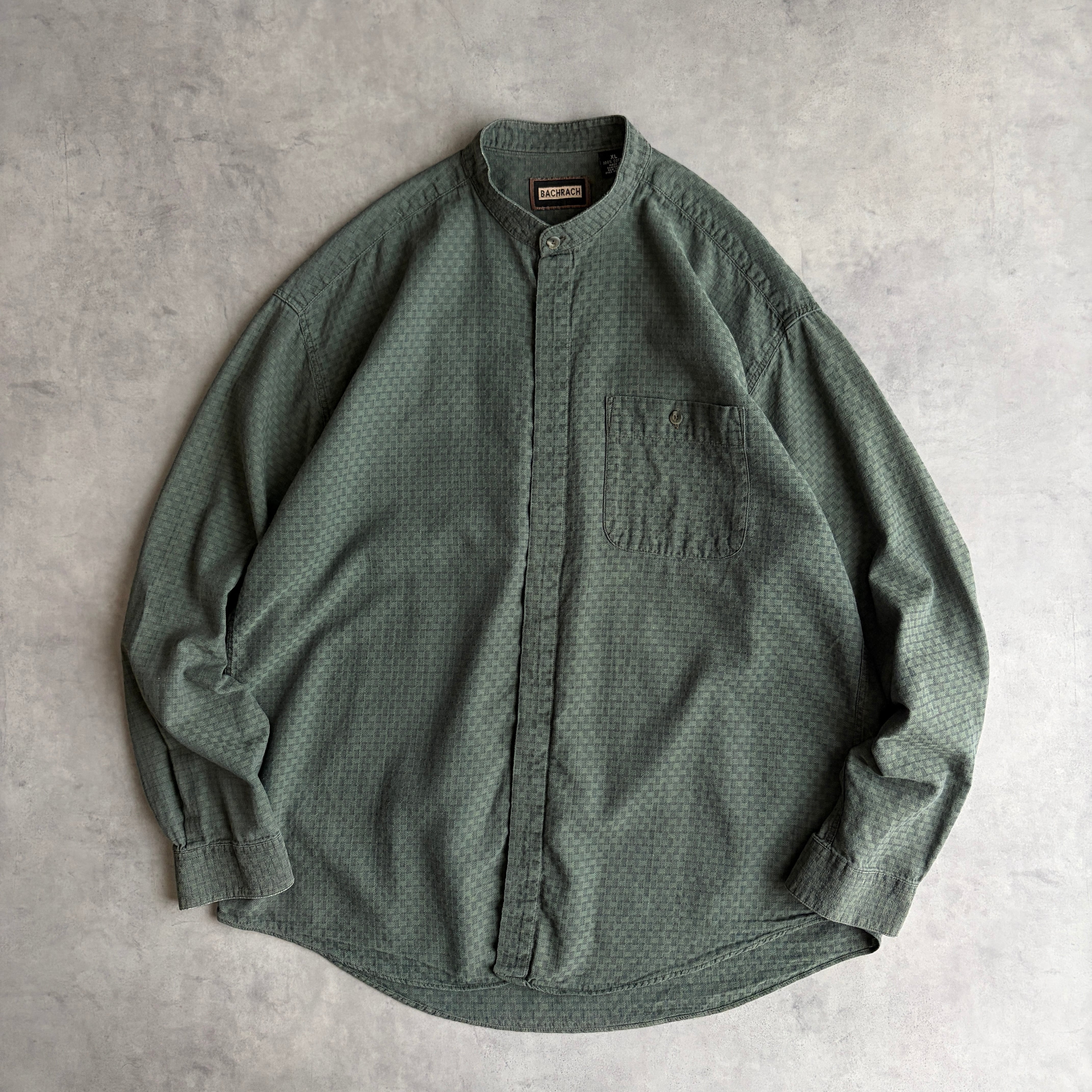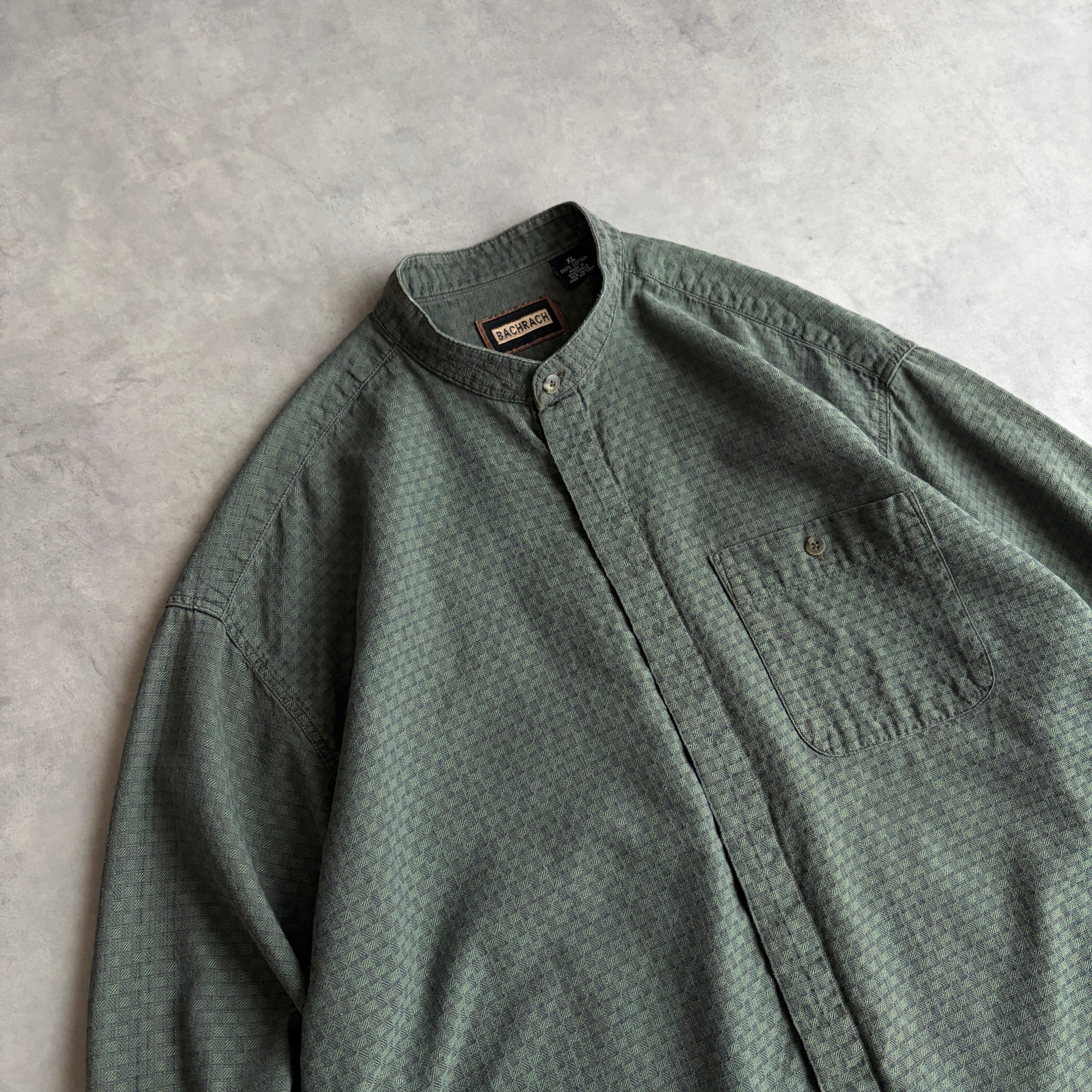 90s/BACHRACH/長袖シャツ/ジャガード生地/幾何学模様/モード系/バンドカラー/ダークグリーン