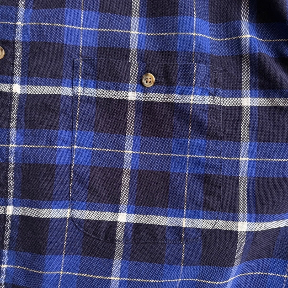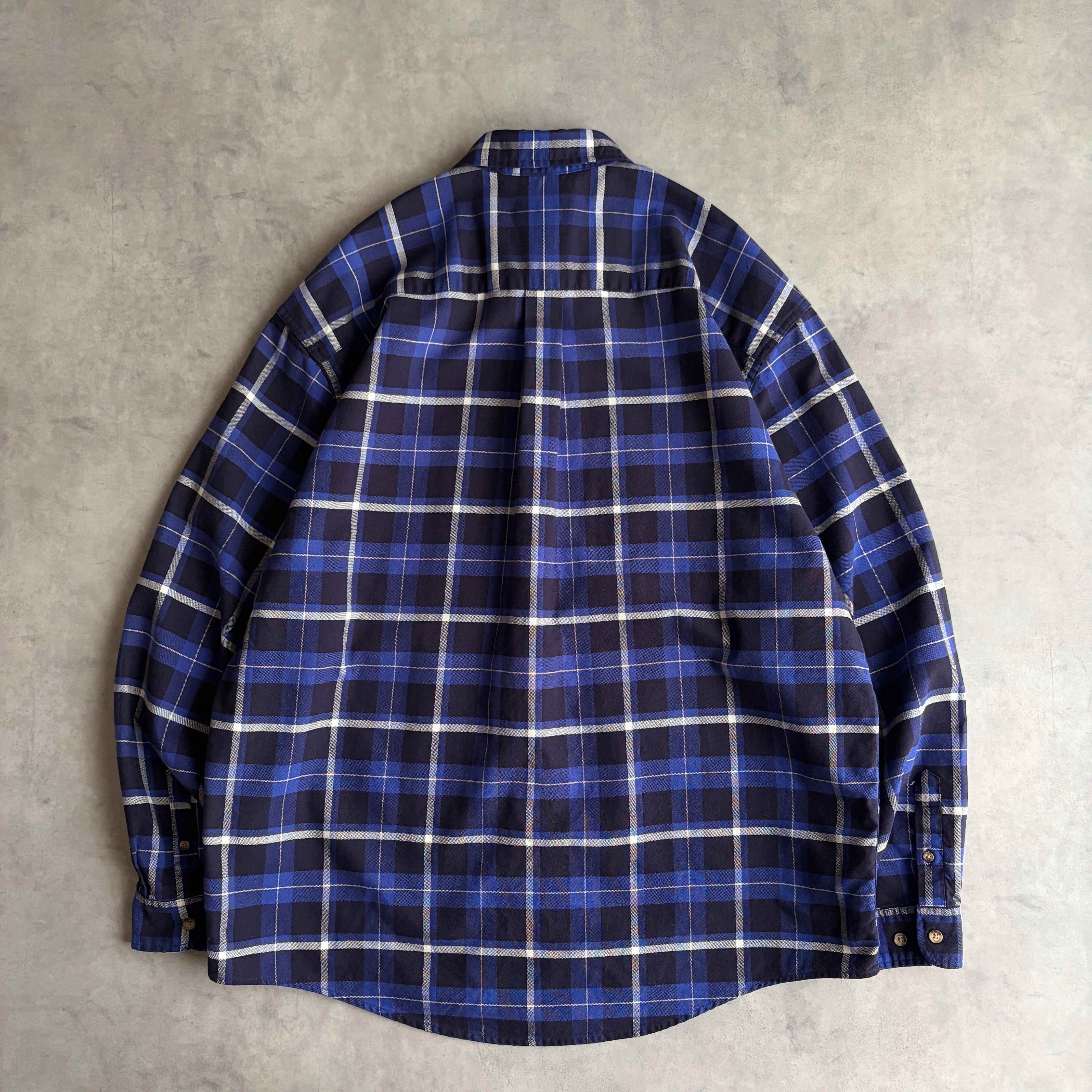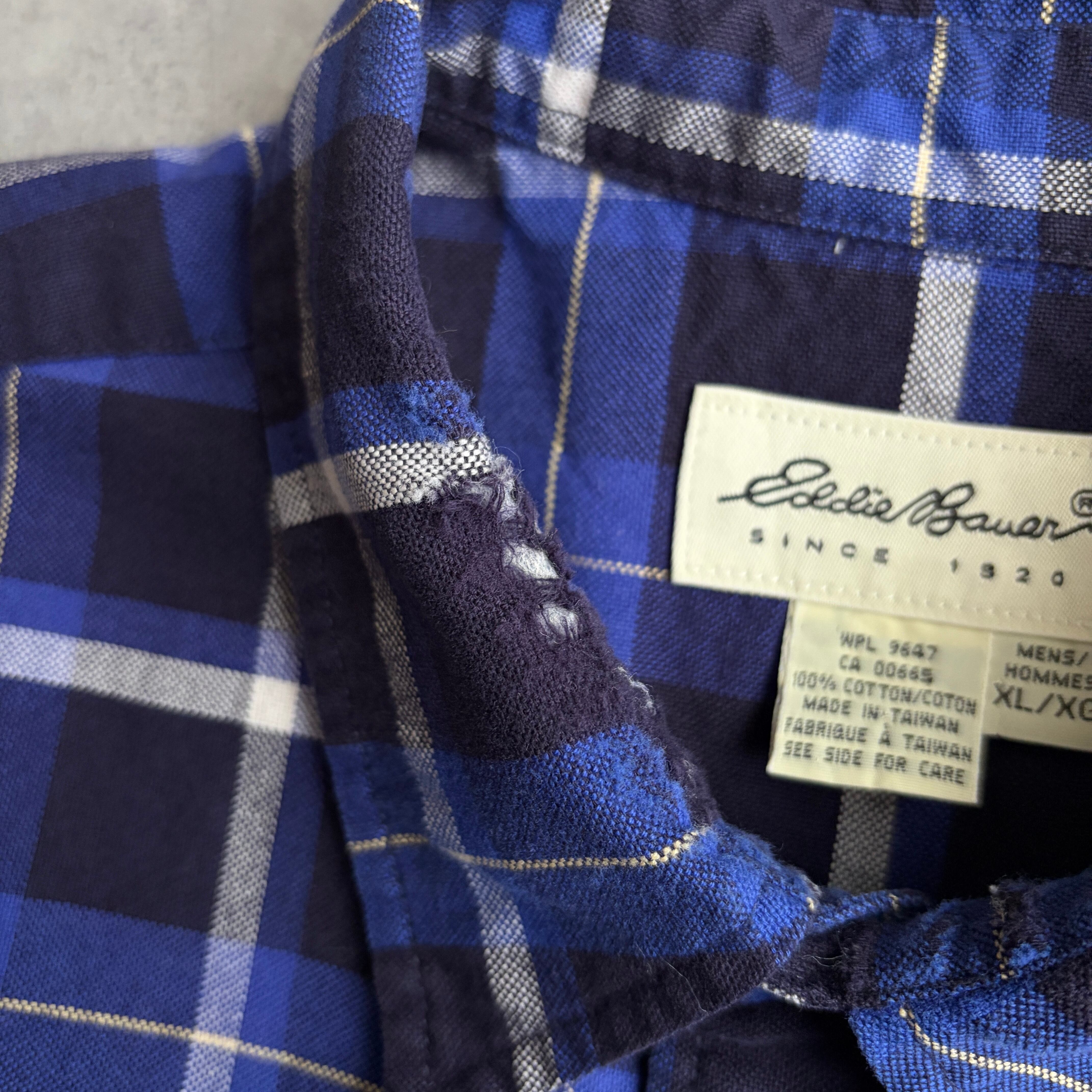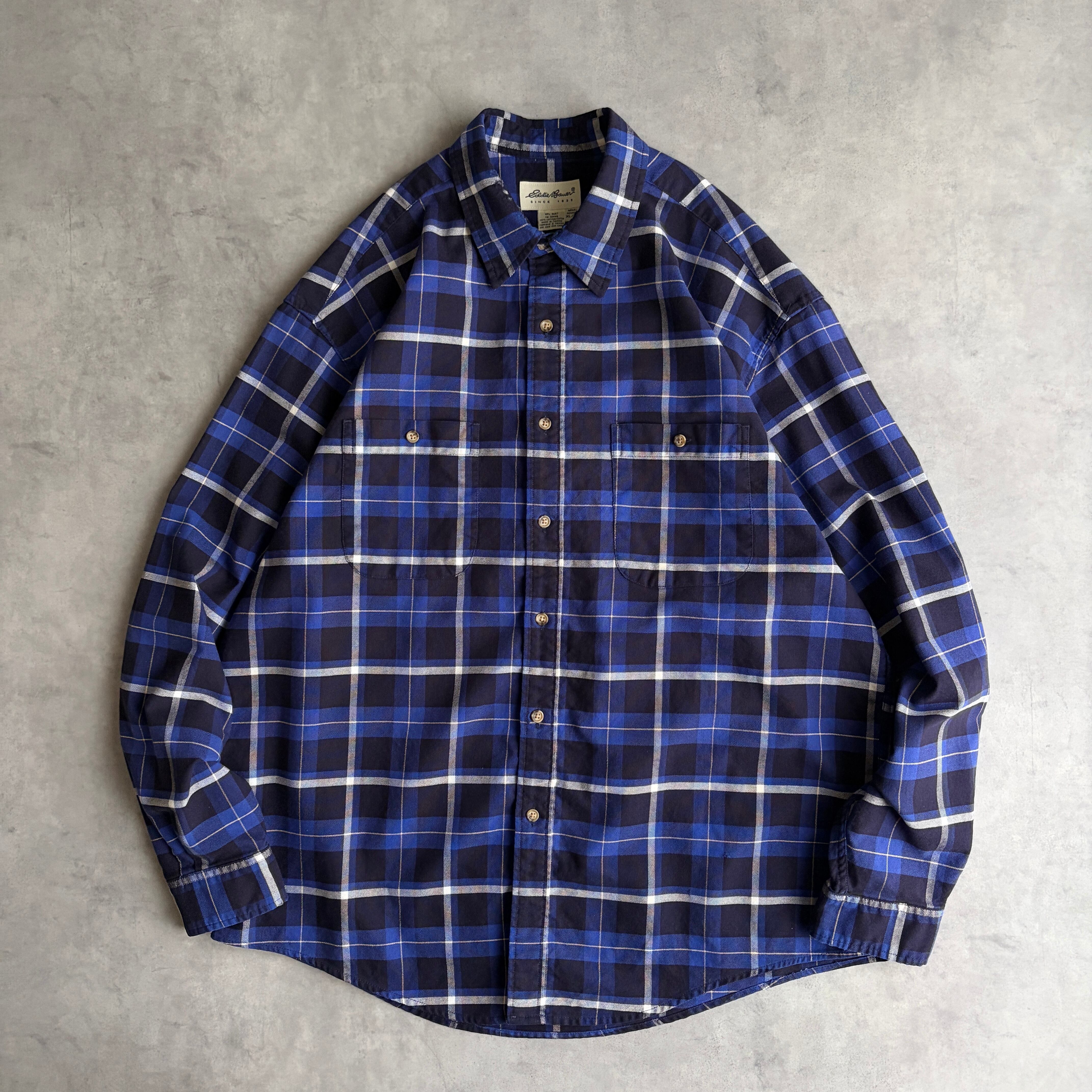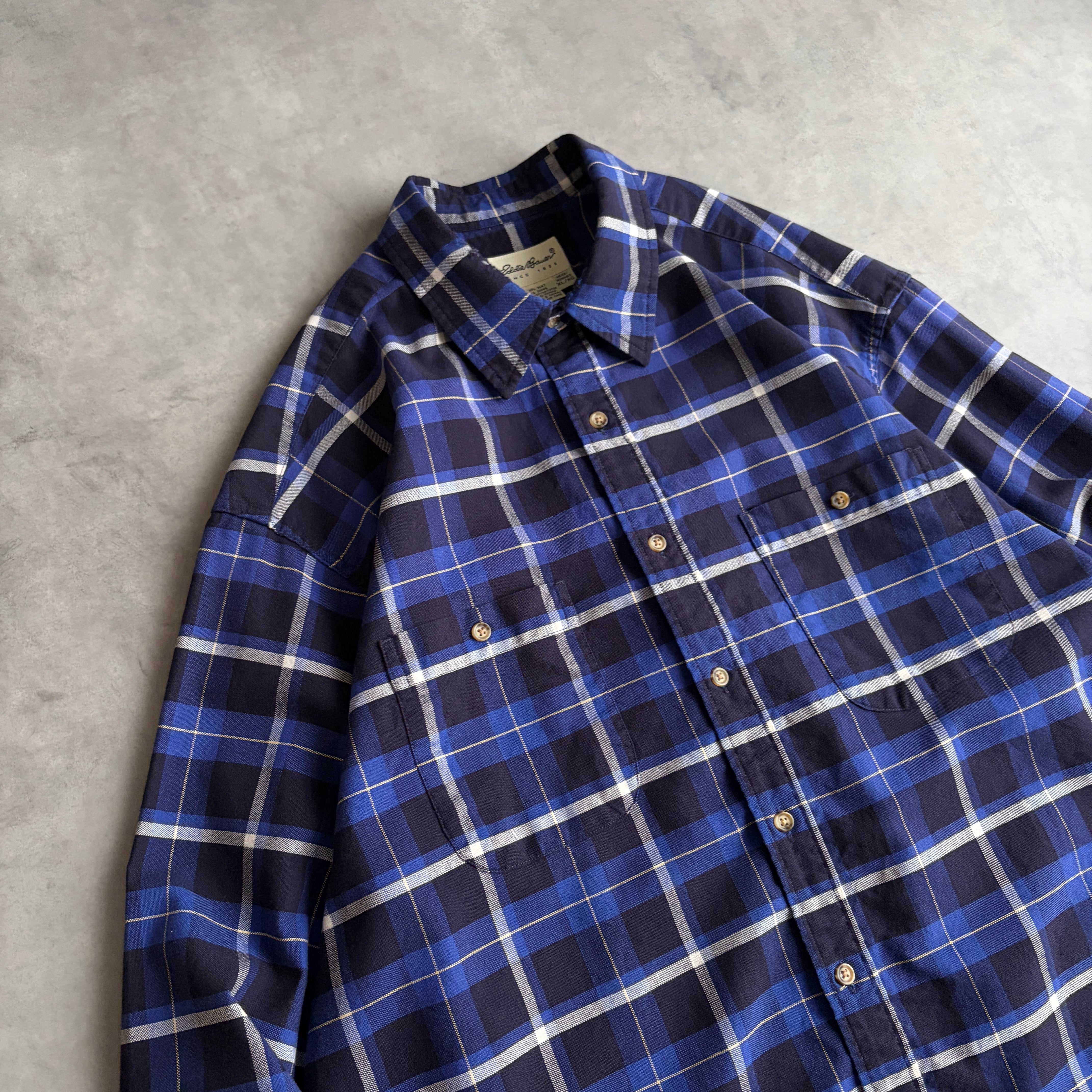 90s/Eddie Bauer/エディーバウアー/長袖シャツ/レギュラーカラー/オックスフォード生地/チェック/格子柄/ネイビー/紺