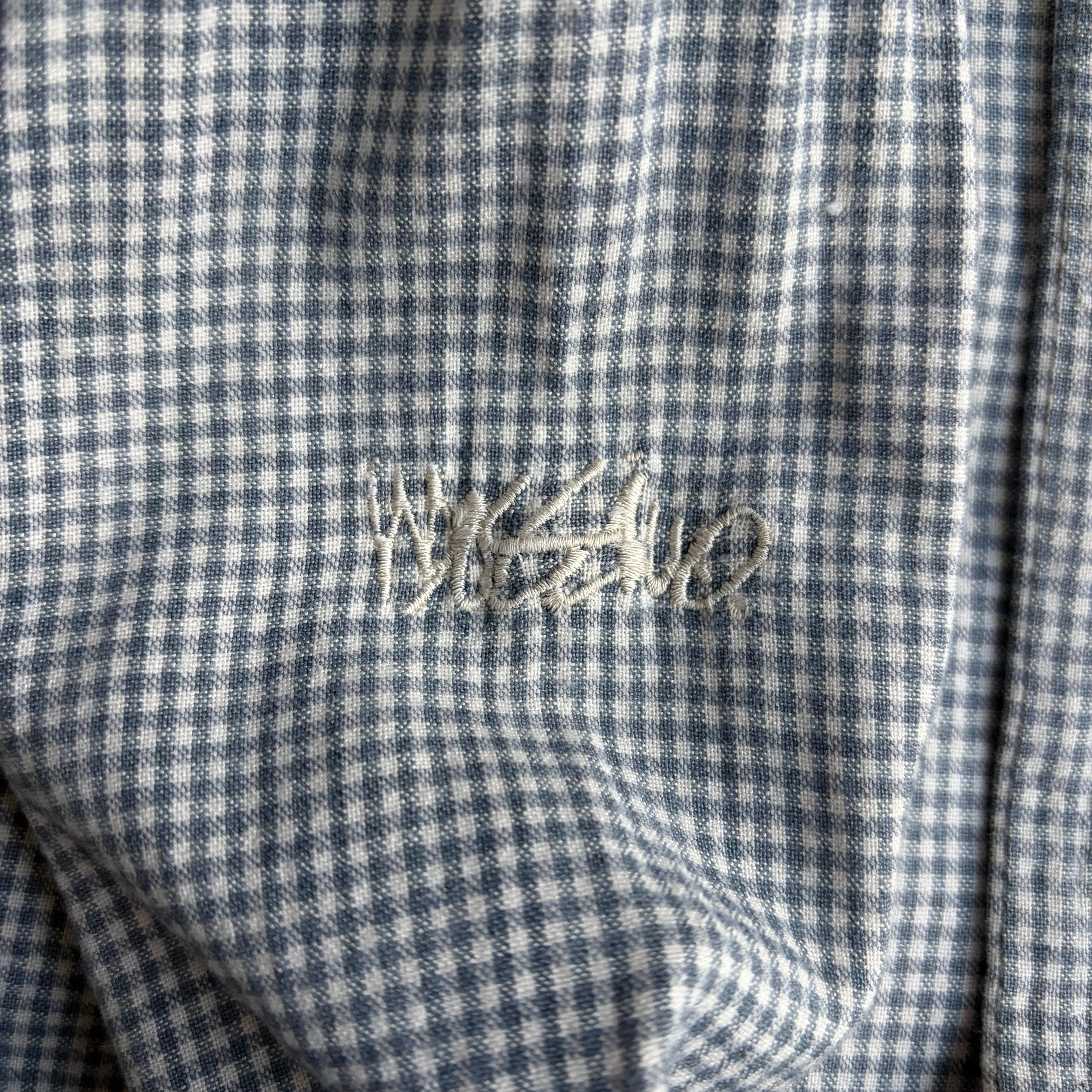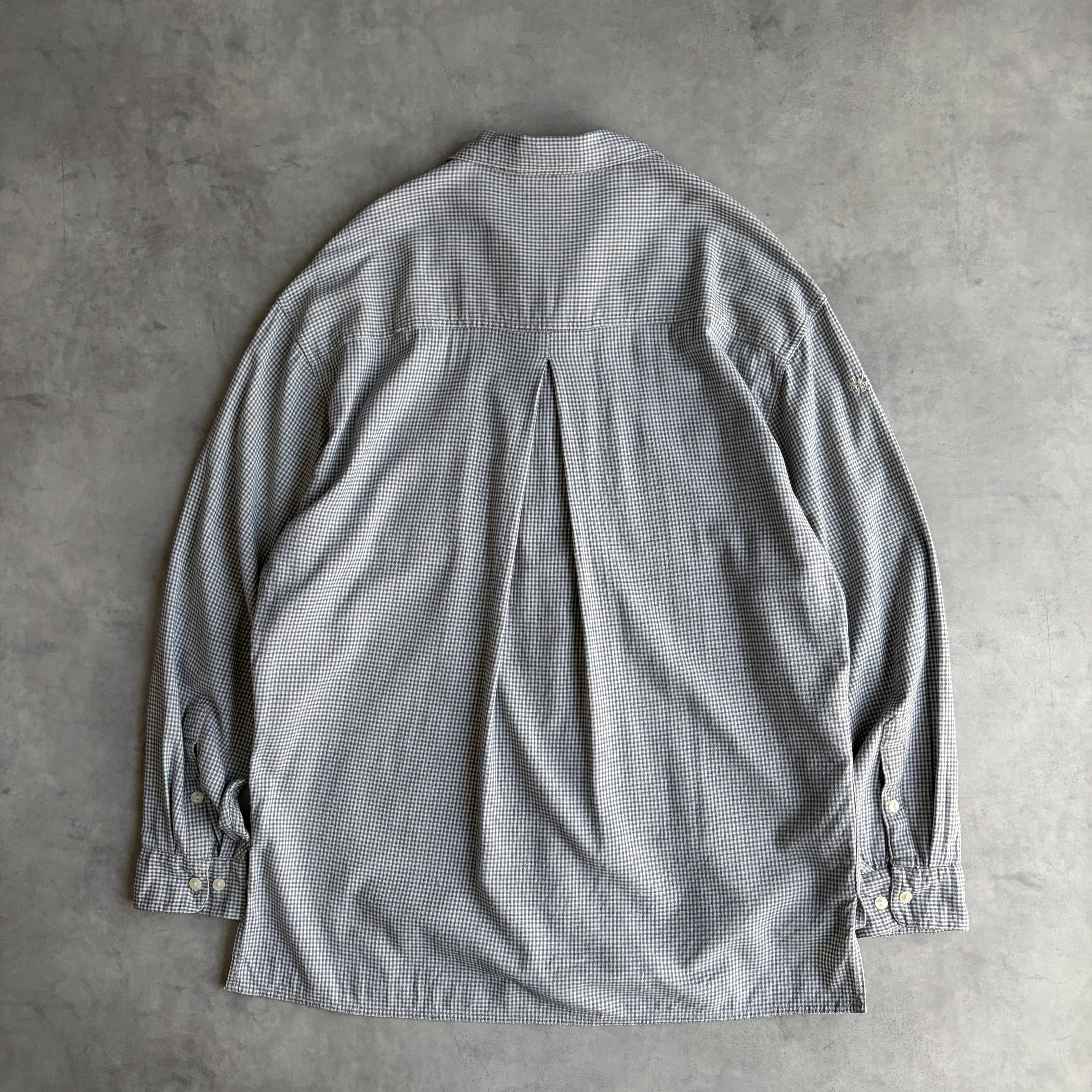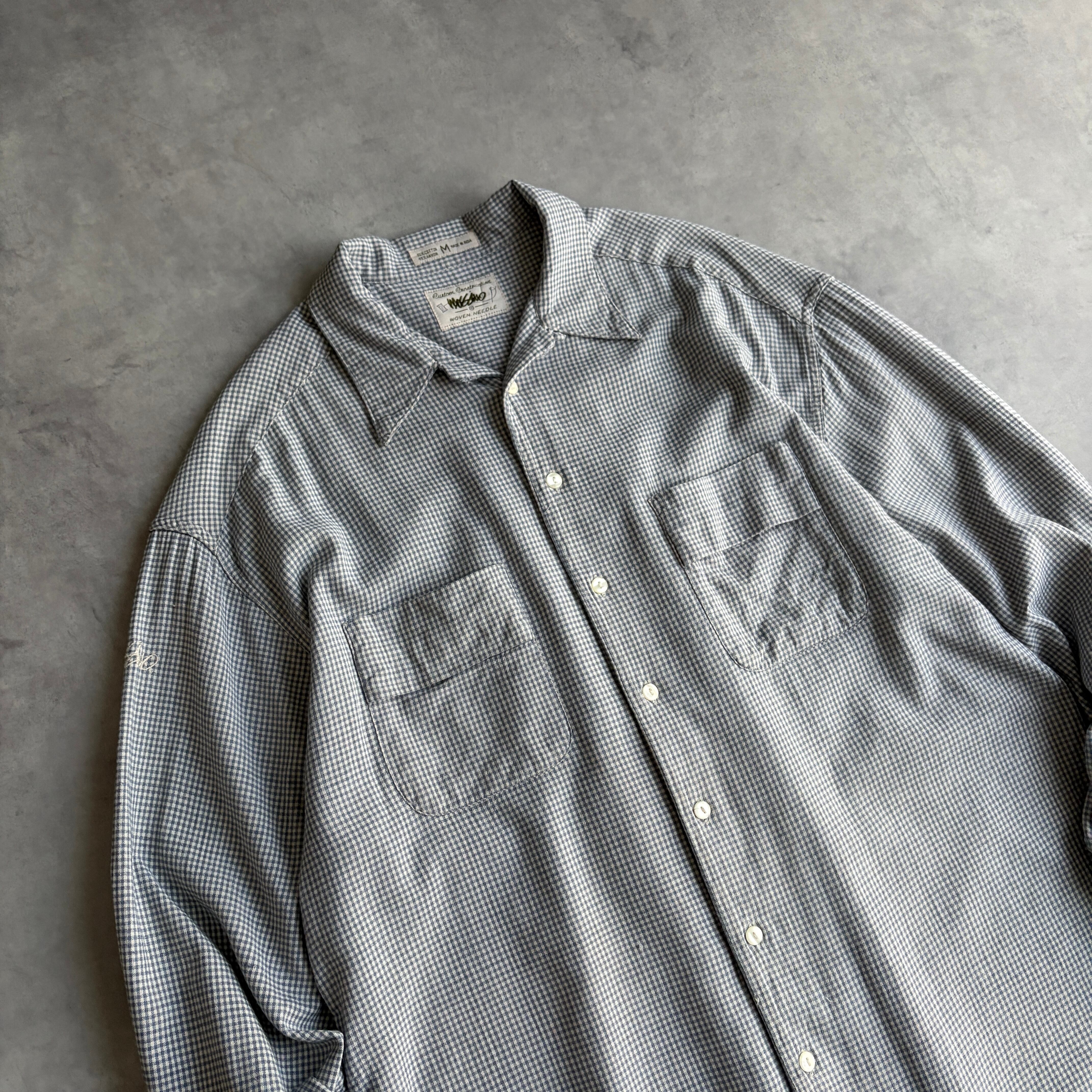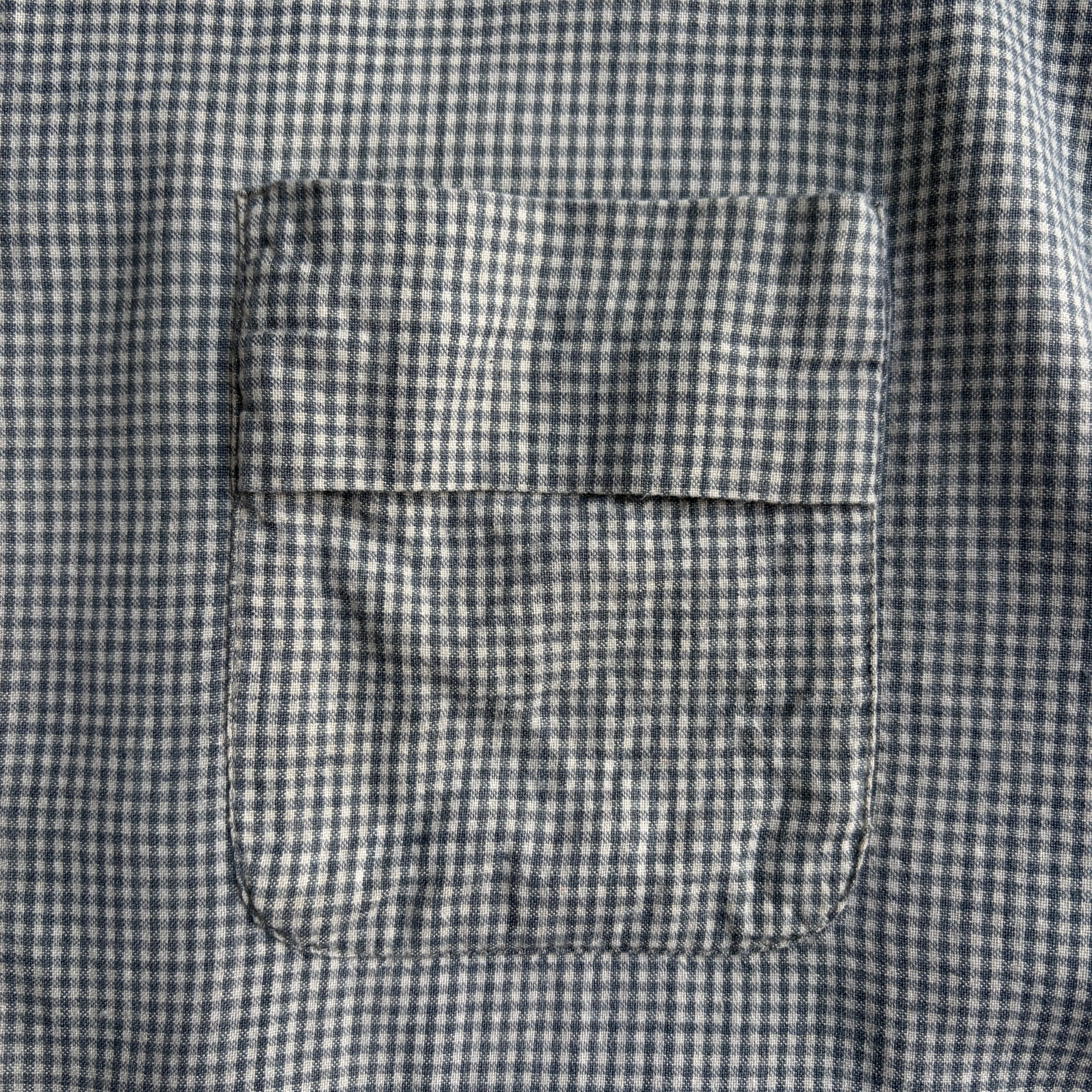 コットン×レーヨンの柔らかい生地に春夏にぴったりなブルーグレーとホワイトのギンガムチェック、オープンカラーにサイドスリット。