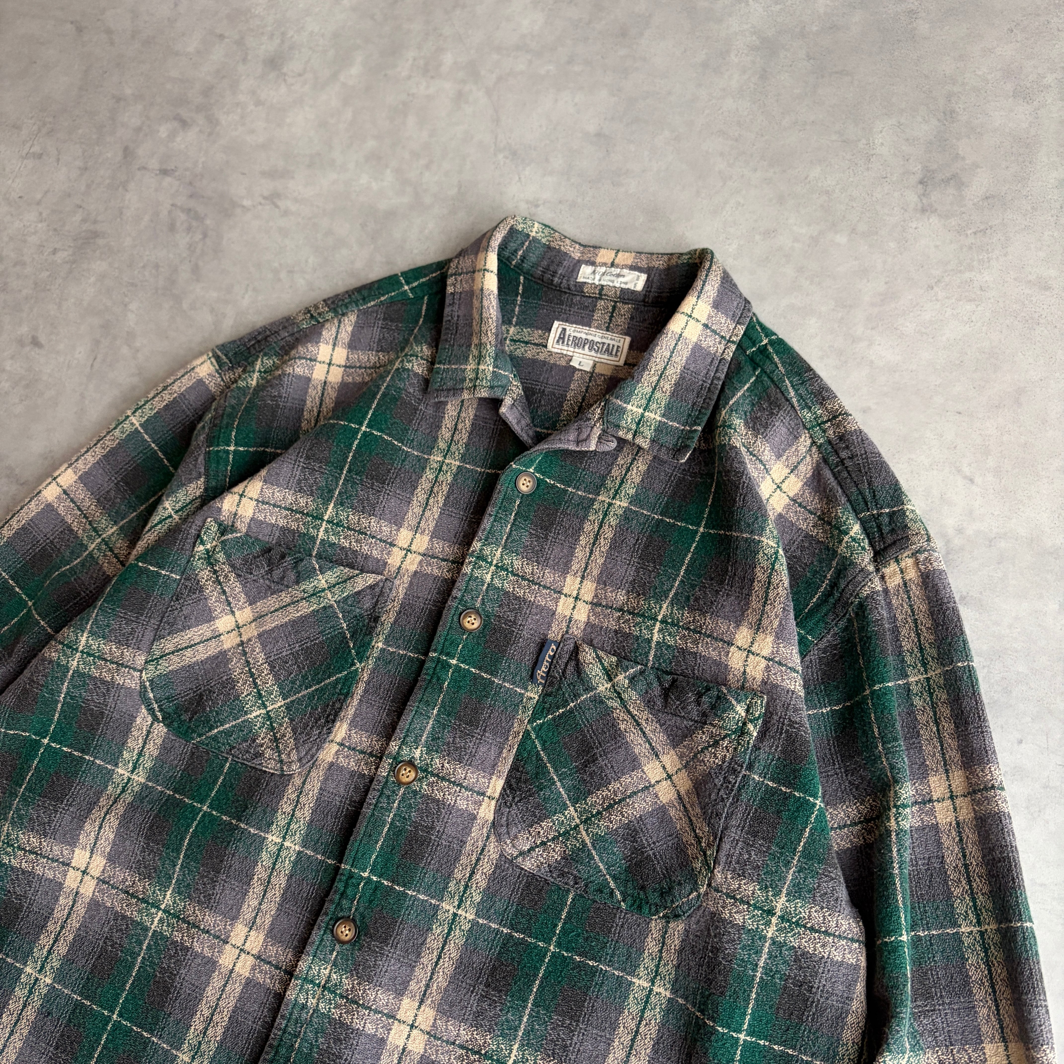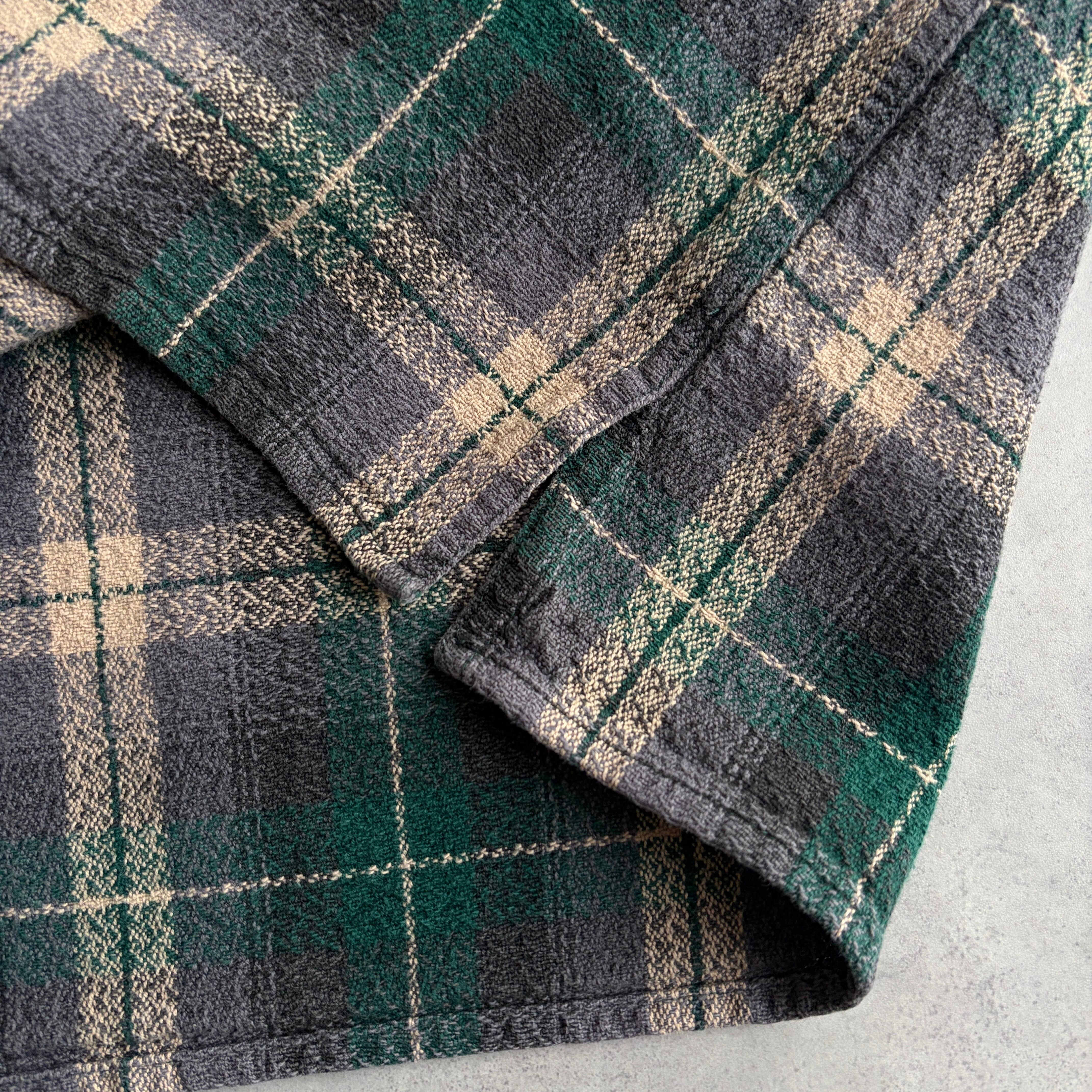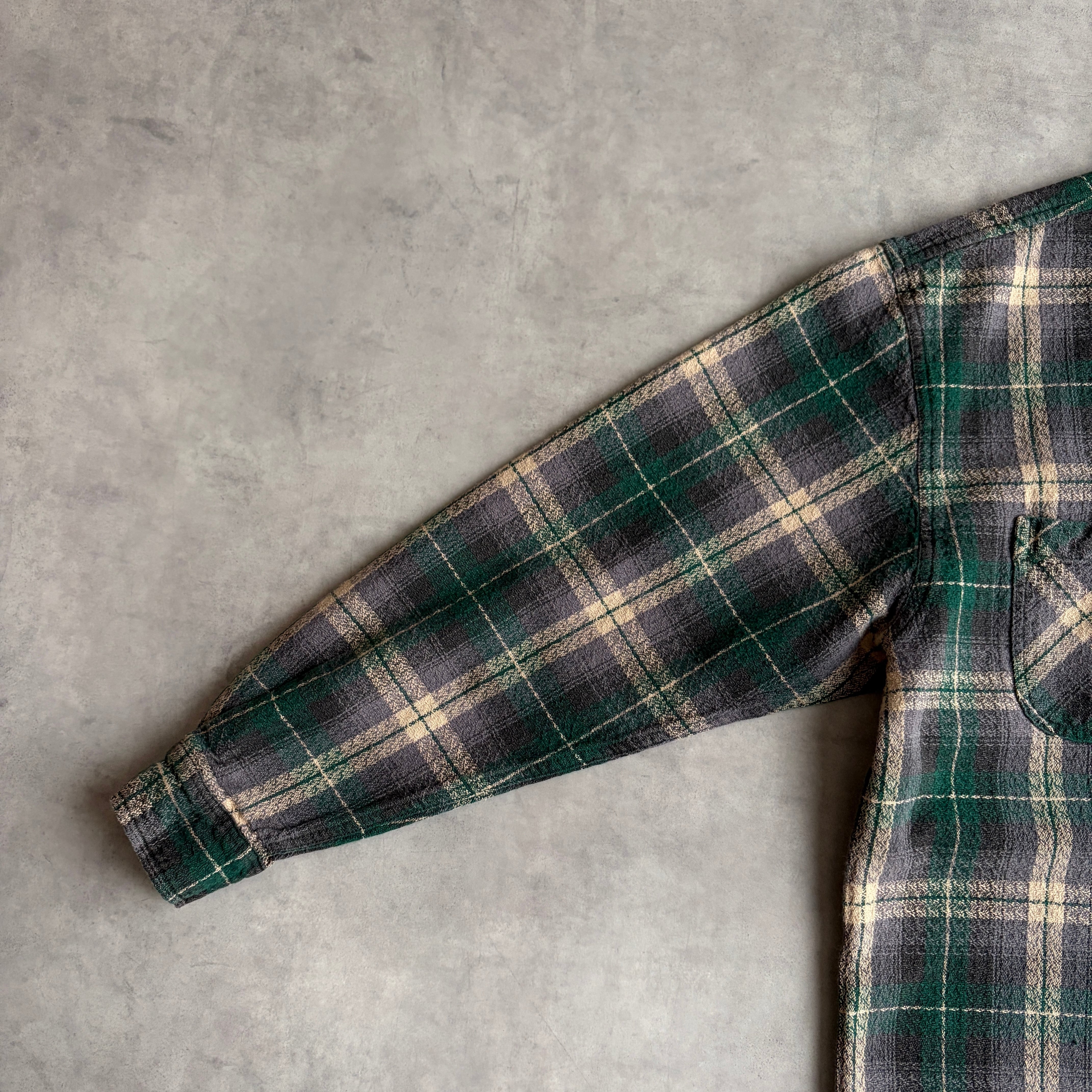 ざっくりとした生地にくすみカラーのオンブレチェック、ボックスシルエットにサイドスリット。