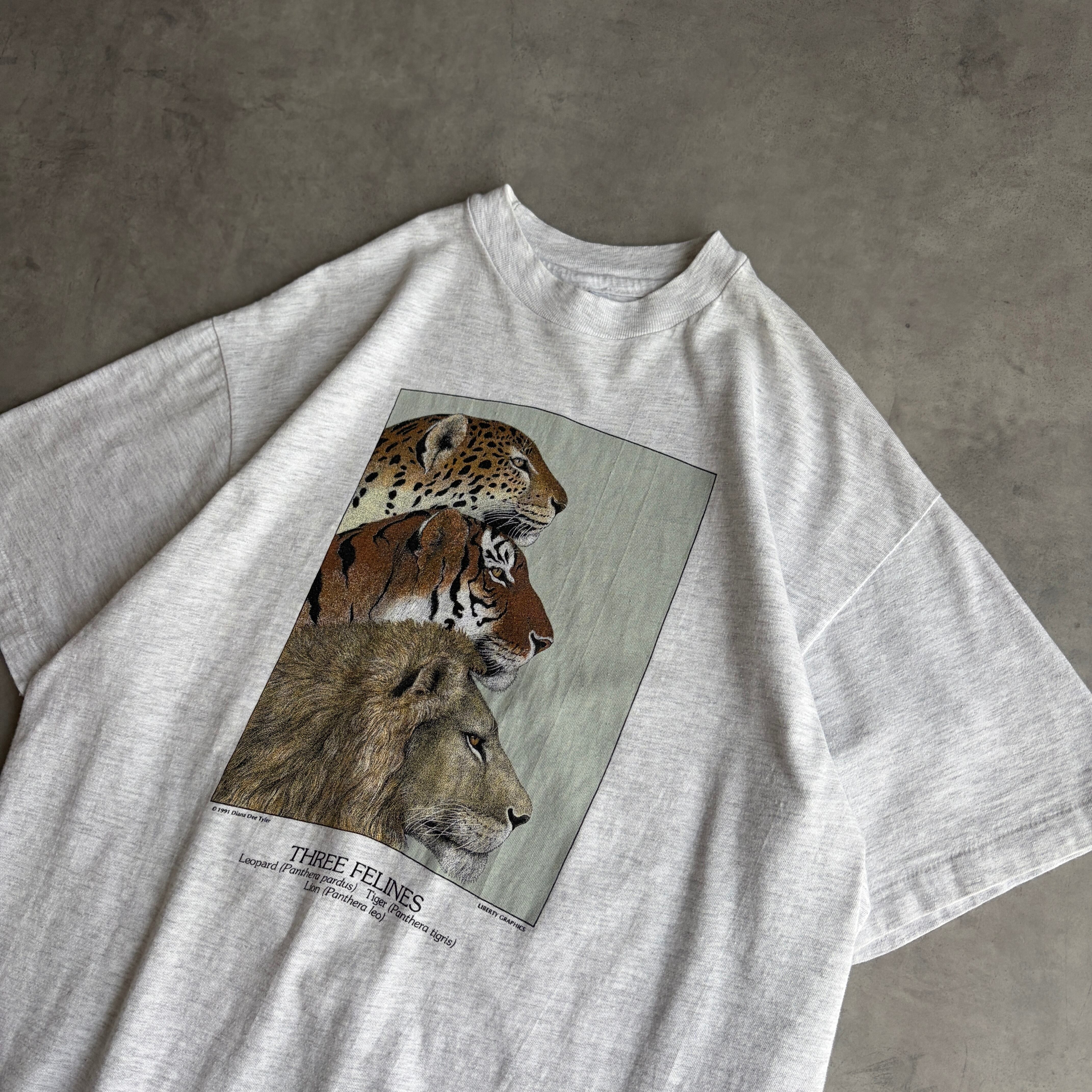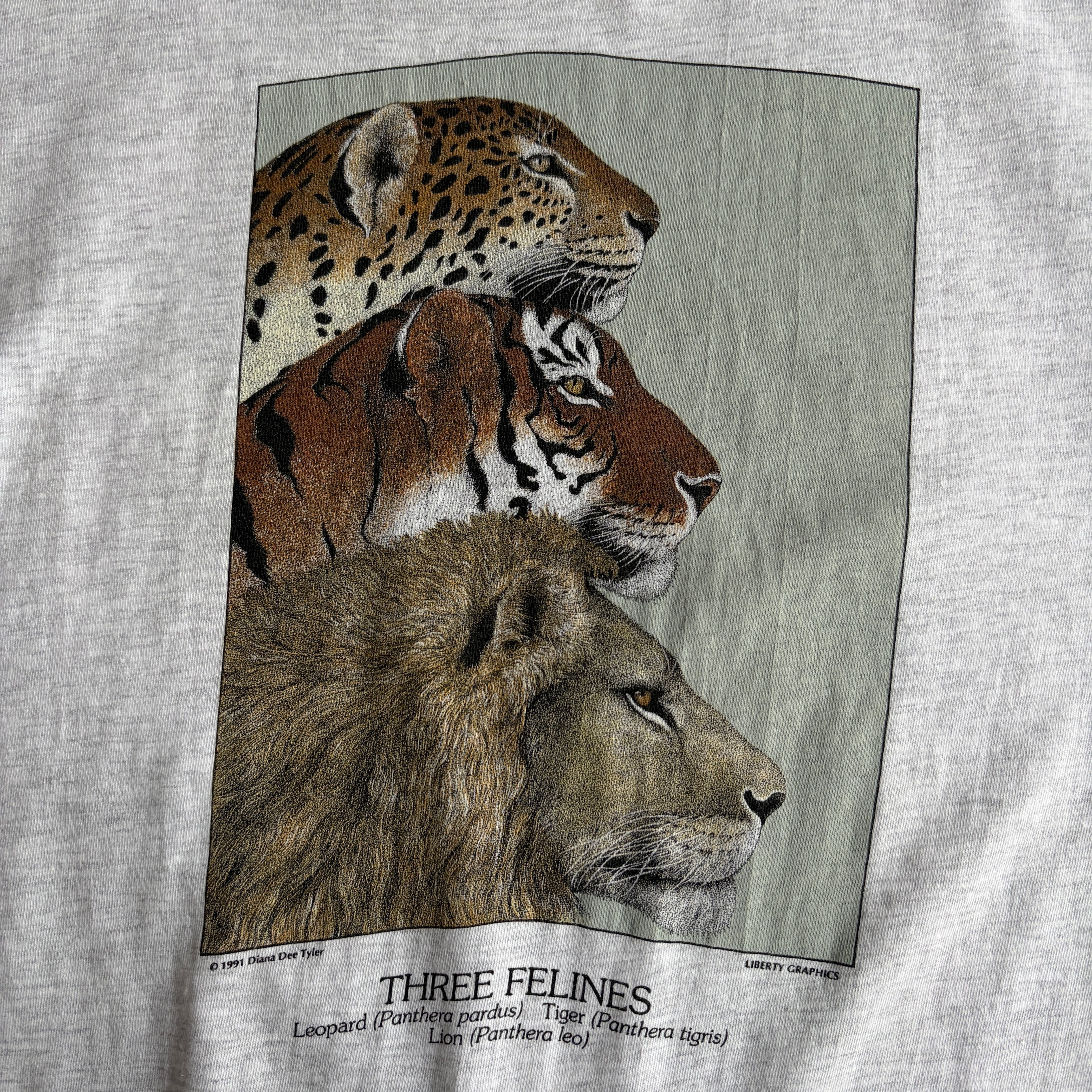 ヒョウ・トラ・ライオンが横顔で並んだ構図、学名入りで図鑑のようなリアリティのあるイラスト、プリントデザインは"Liberty Graphics"。