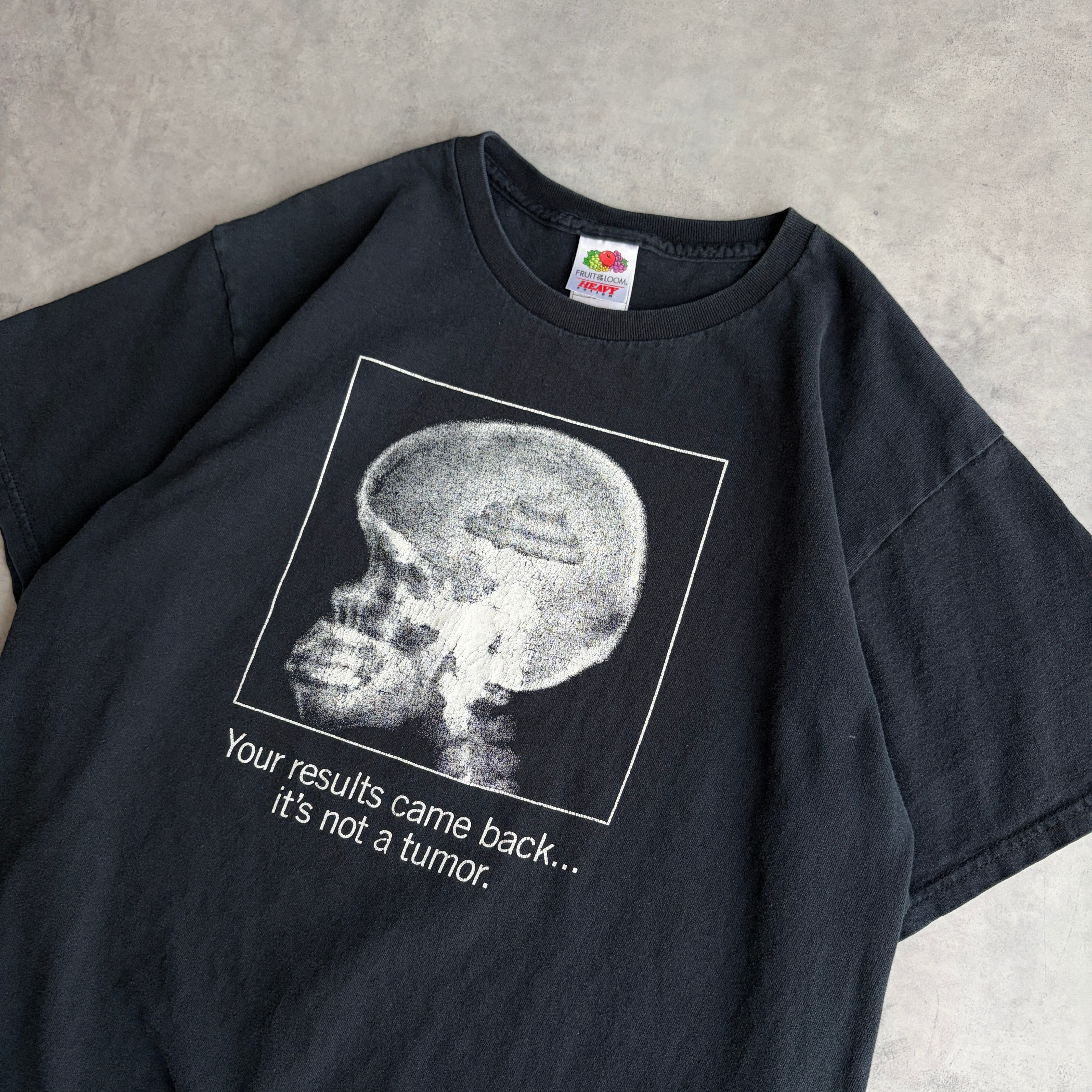 頭部のレントゲンに“Your results came back… it’s not a tumor.”(検査結果としては、腫瘍ではありません)というメッセージのプリント。