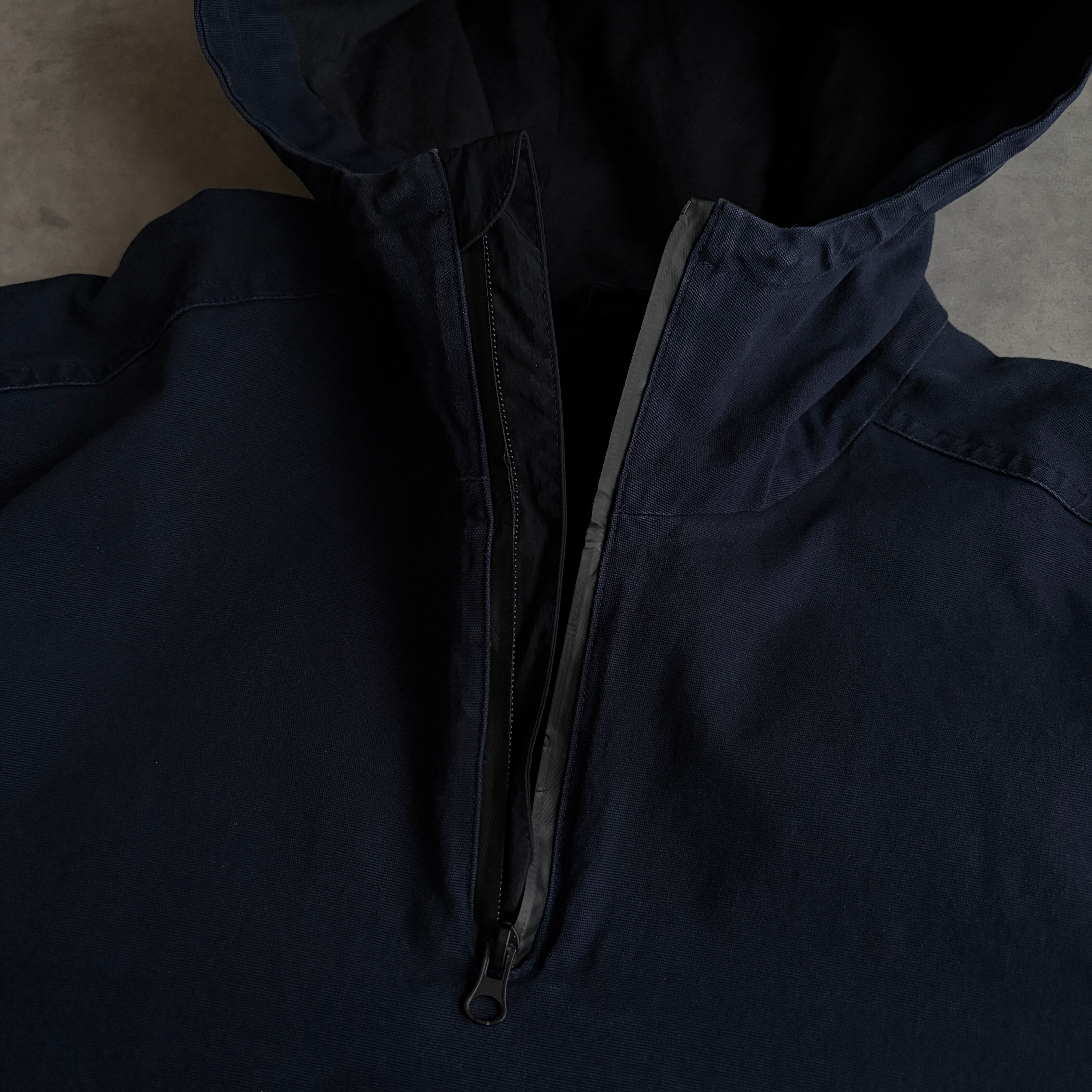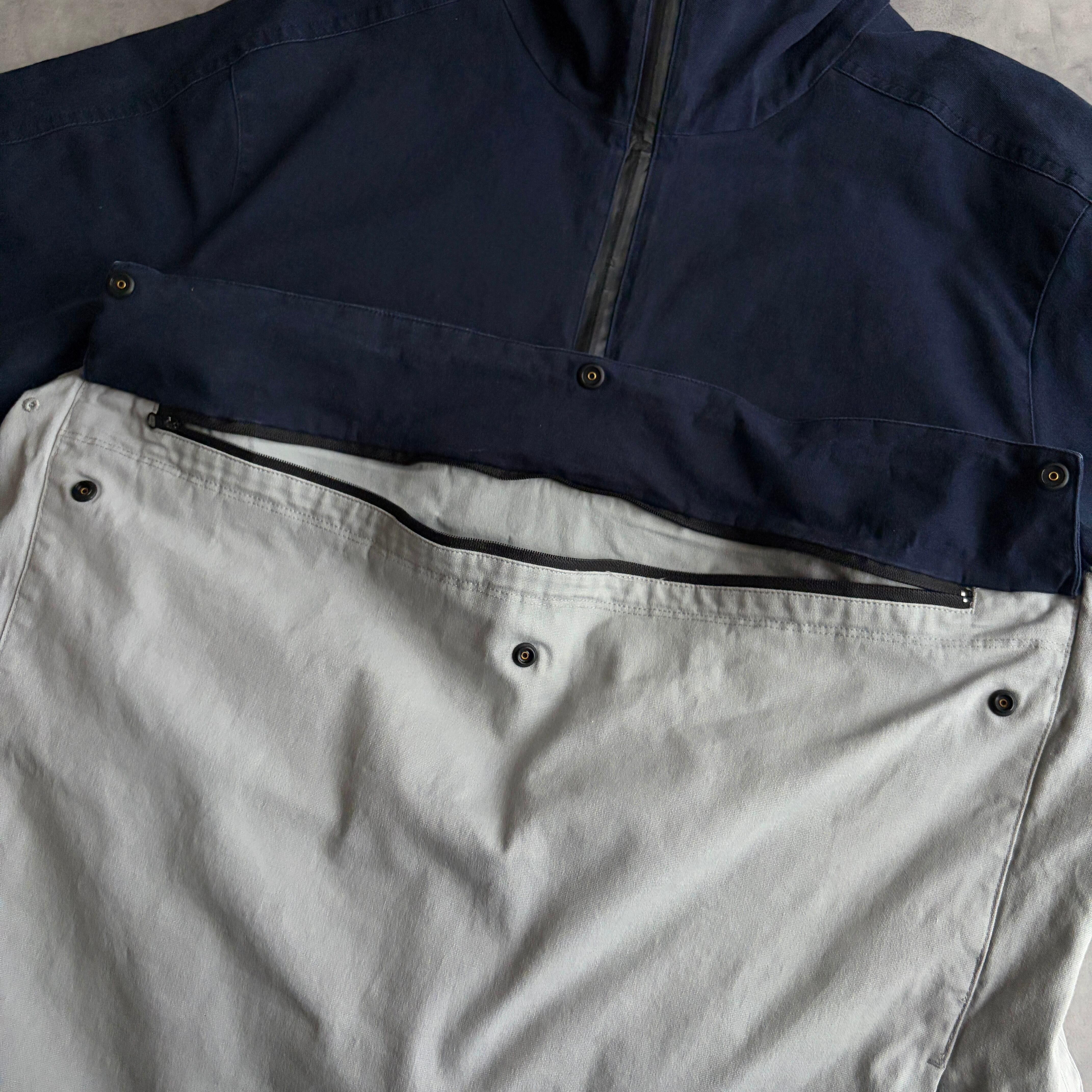 フロントには大きなポケット、左サイドには大きなジップスリット、裾ドローコード付き。