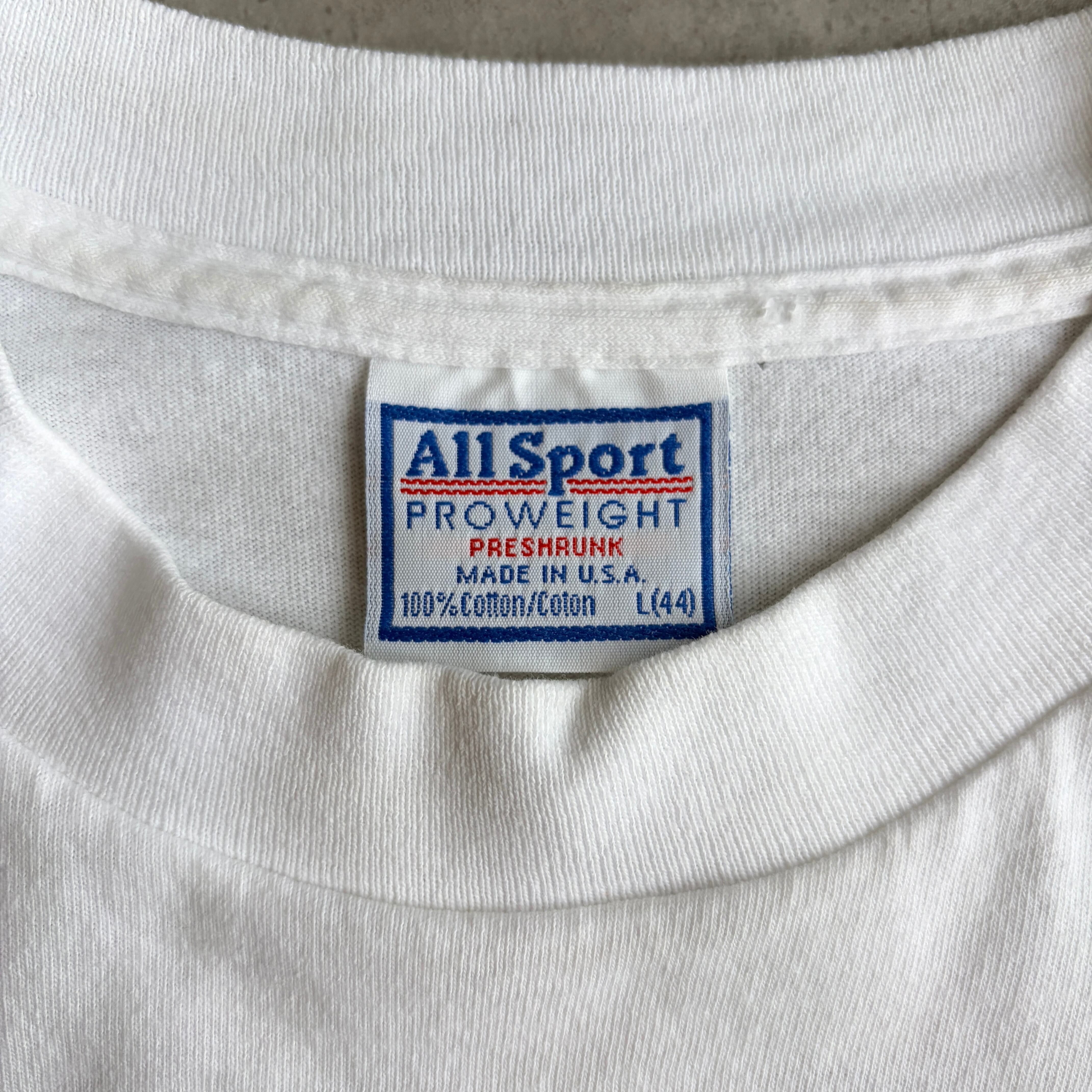 90s/All Sport/半袖Tシャツ/USA製/アメリカ製/シングルステッチ/イベントプロモーション/ローカル/スポンサー/バックプリント/アメコミ風/ホワイト/白/jmaple