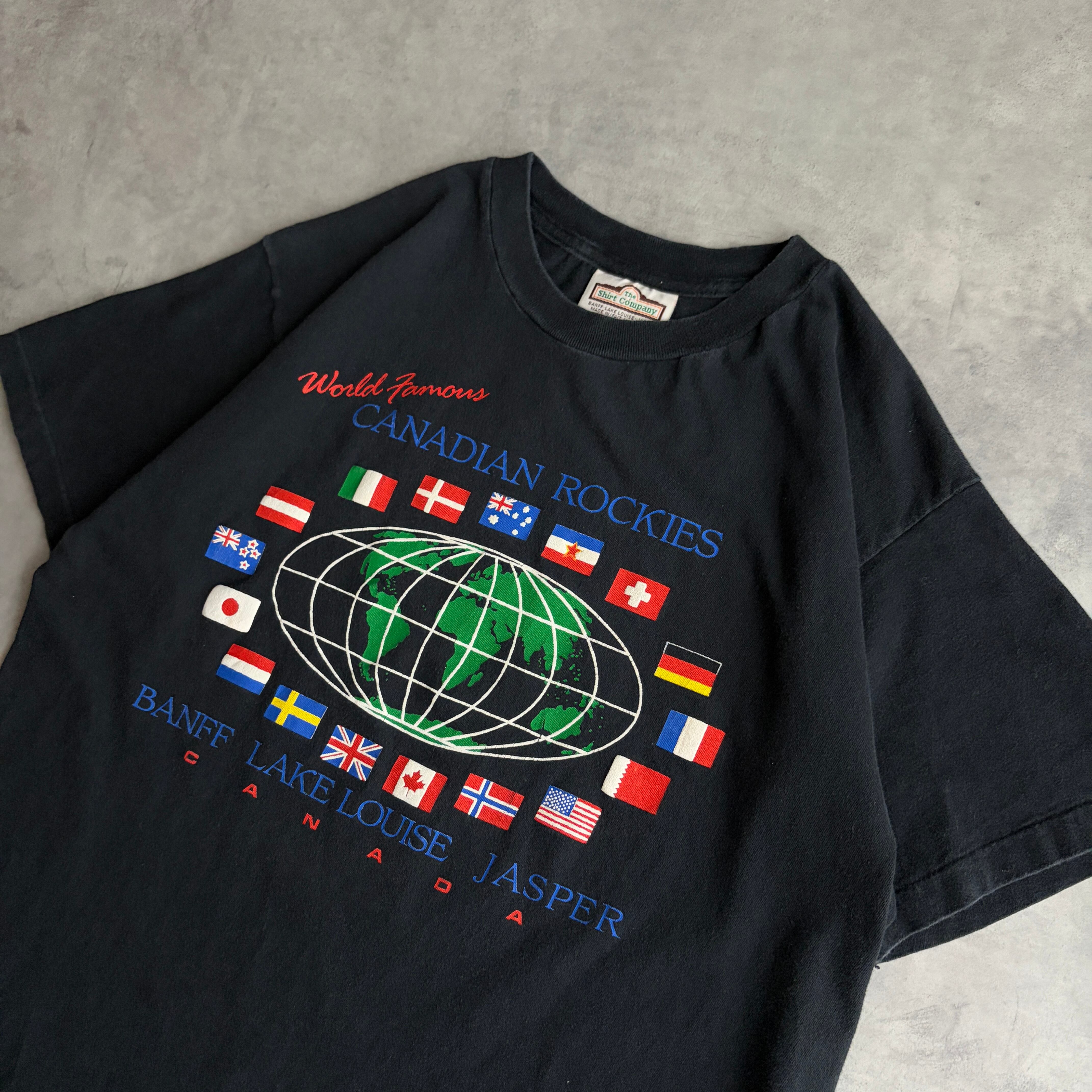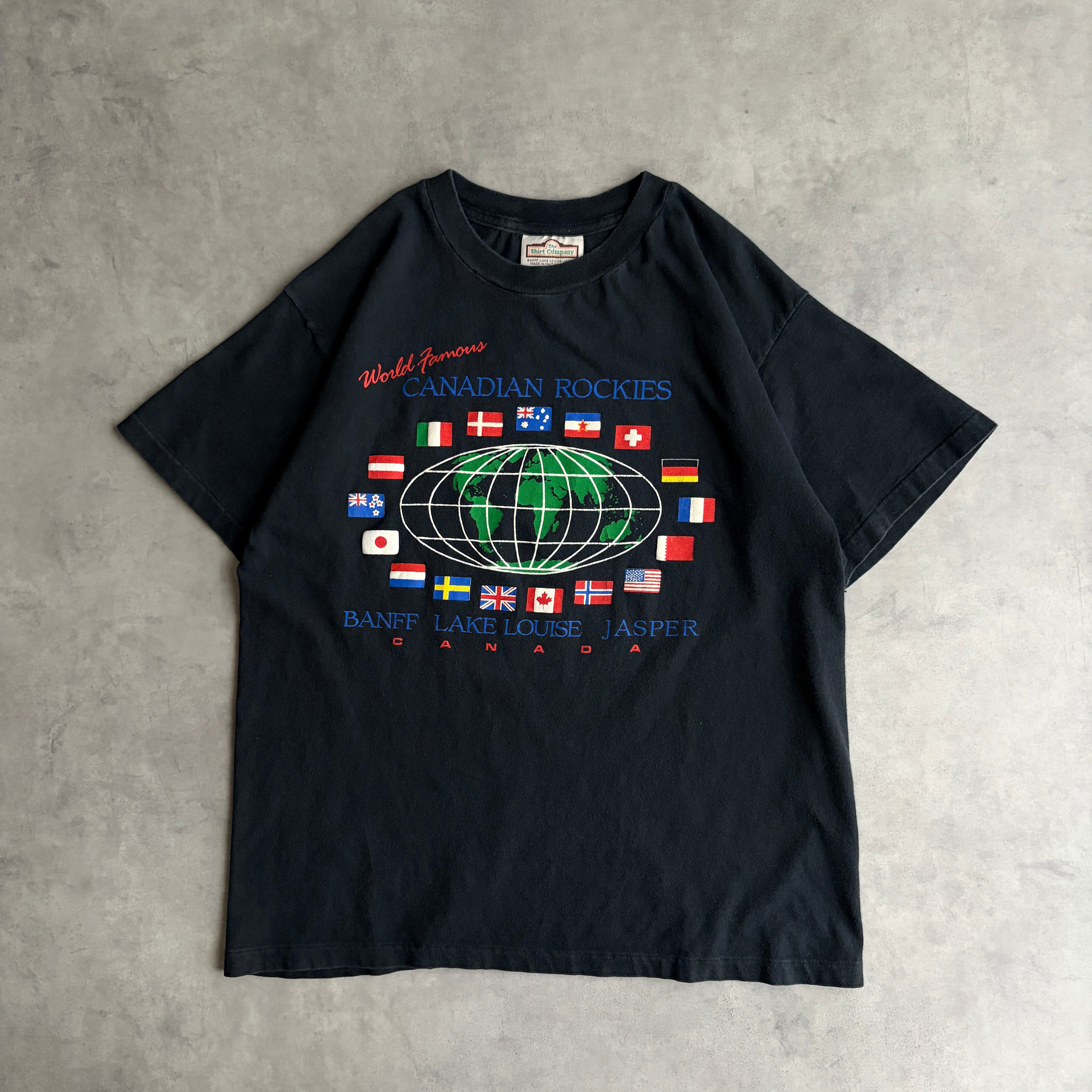 90s/The Shirt Company/プリント半袖Tシャツ/カナダ製/シングルステッチ/地球儀/スーベニア/観光/万国旗/ブラック/黒/jmaple