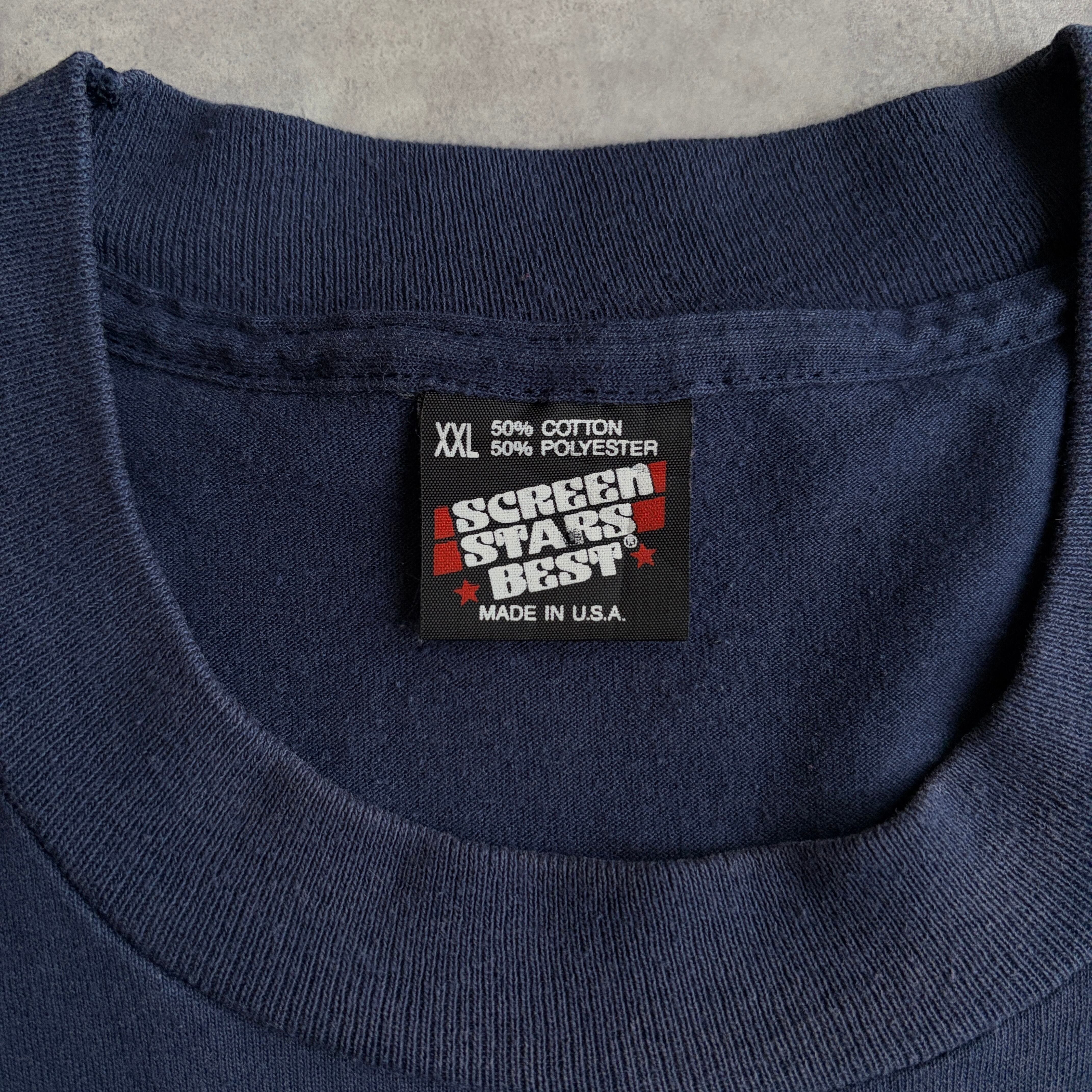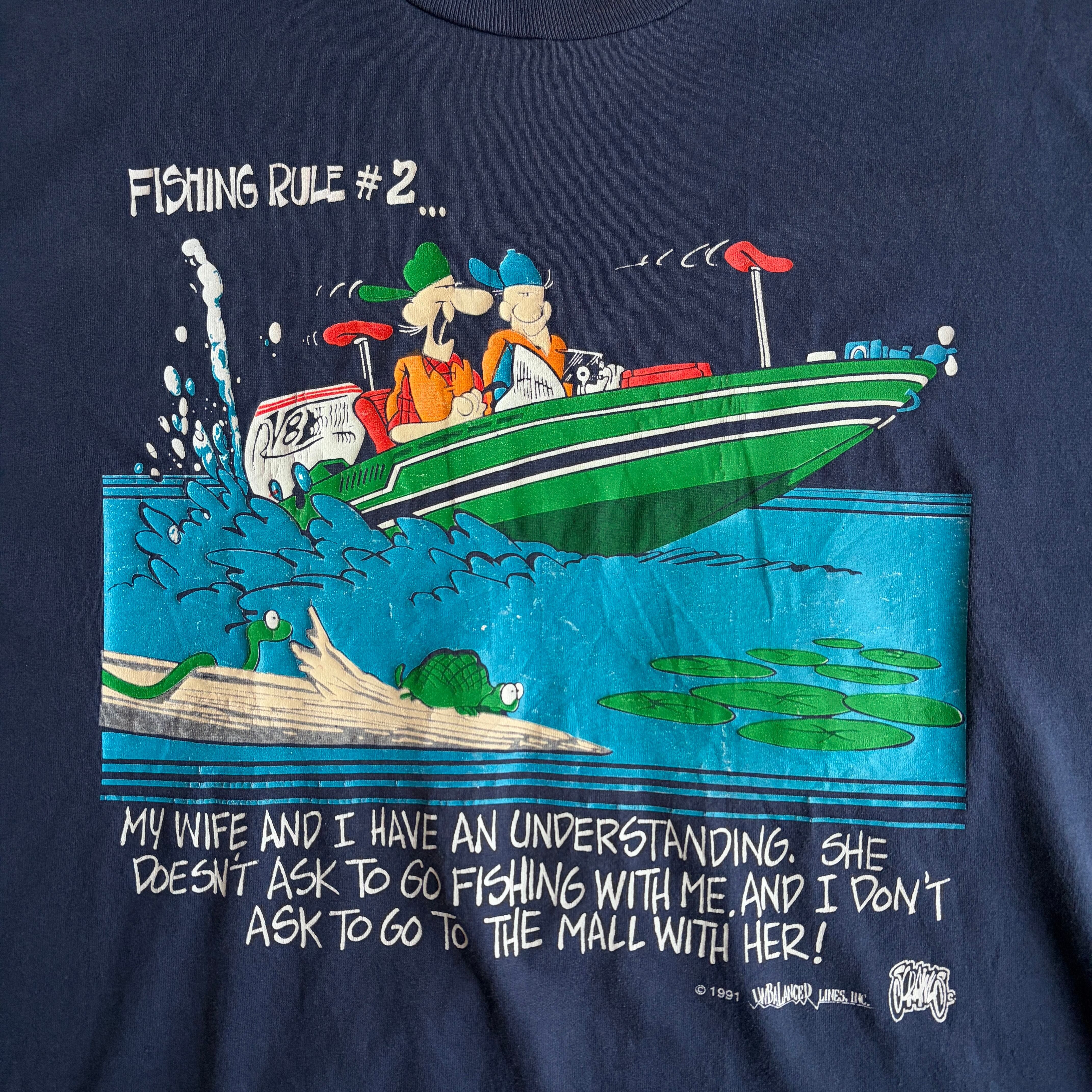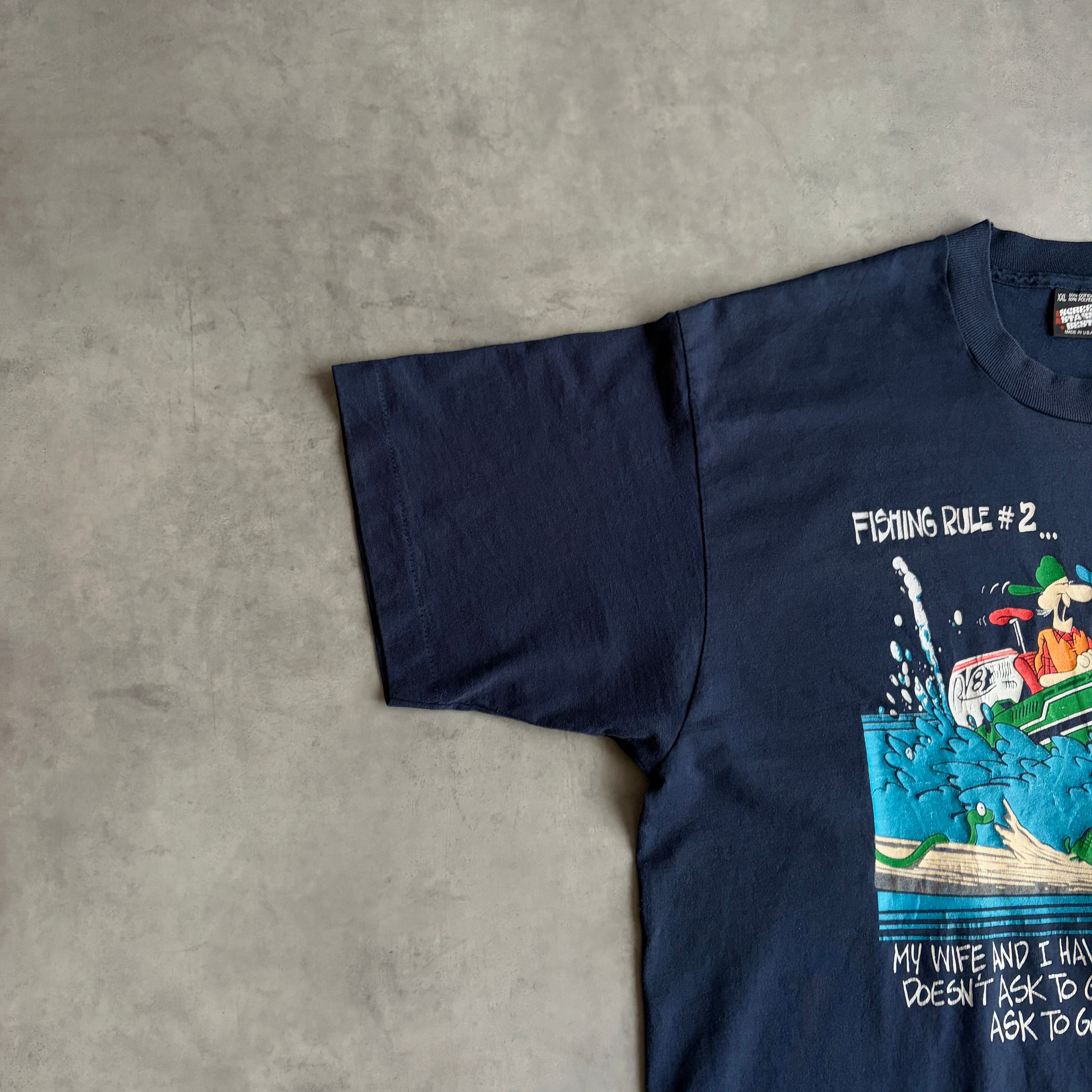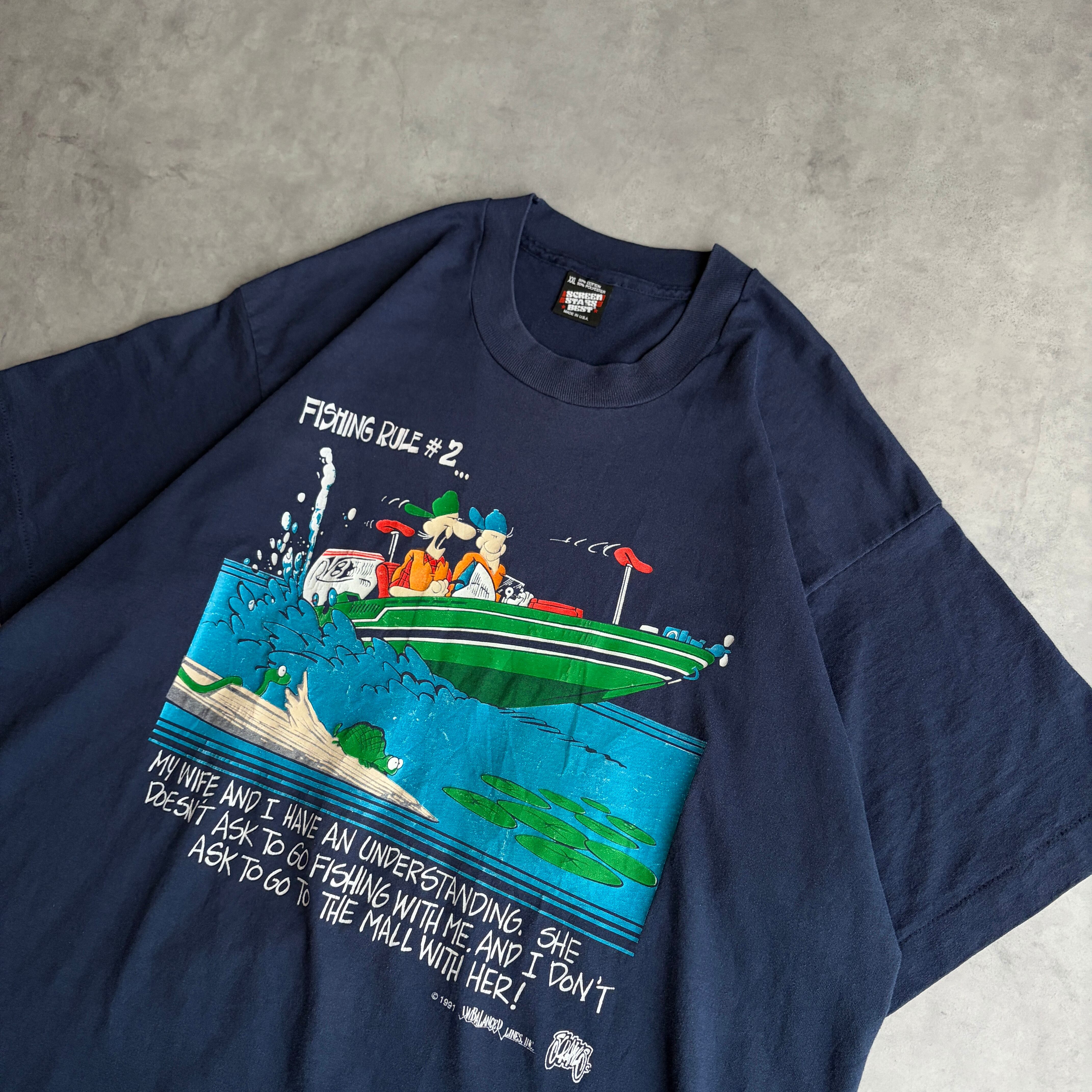 90s/FRUIT OF THE LOOM/フルーツオブザルーム/半袖Tシャツ/USA製/アメリカ製/シングルステッチ/ユーモア/ジョーク/船/釣り/趣味/ネイビー/紺/jmaple