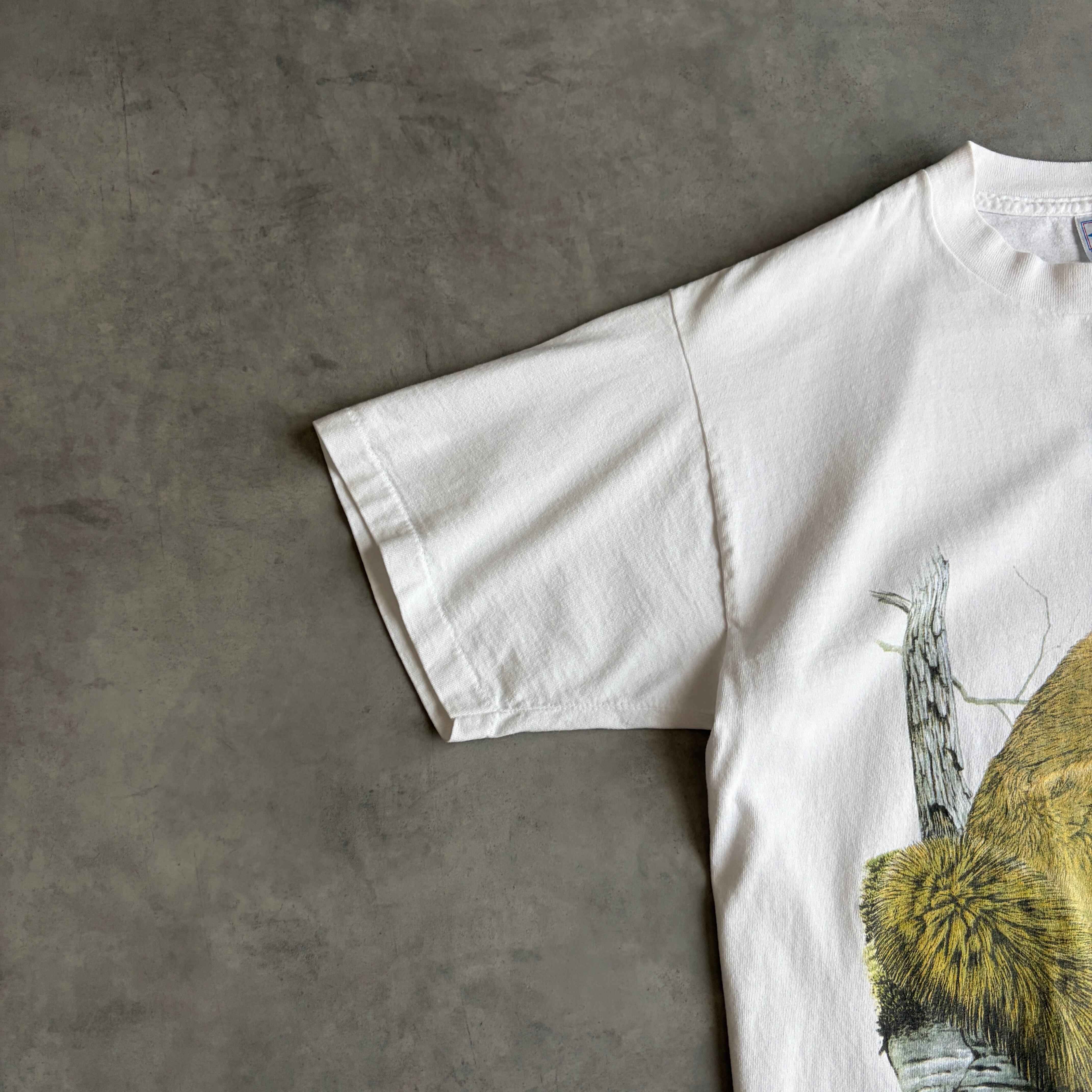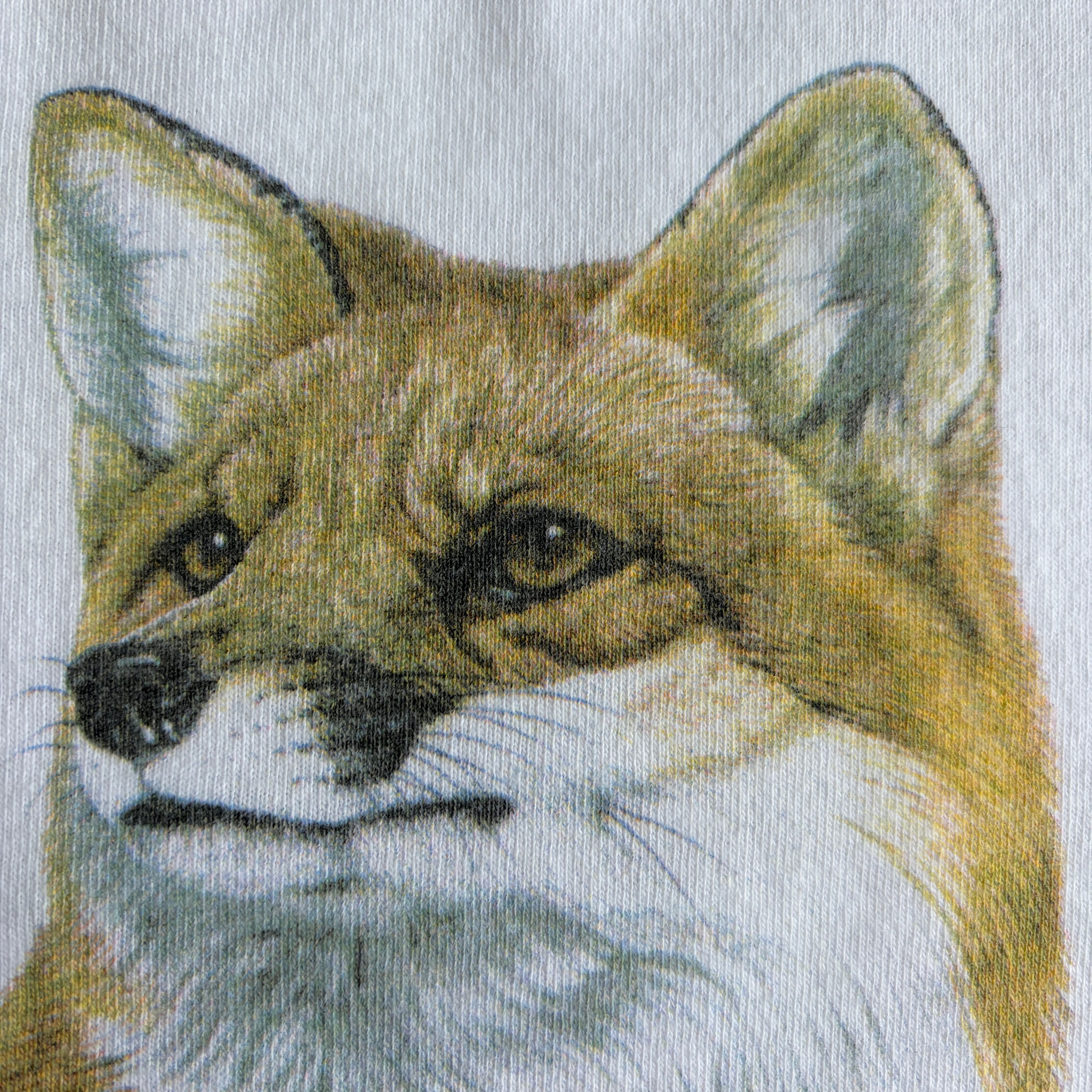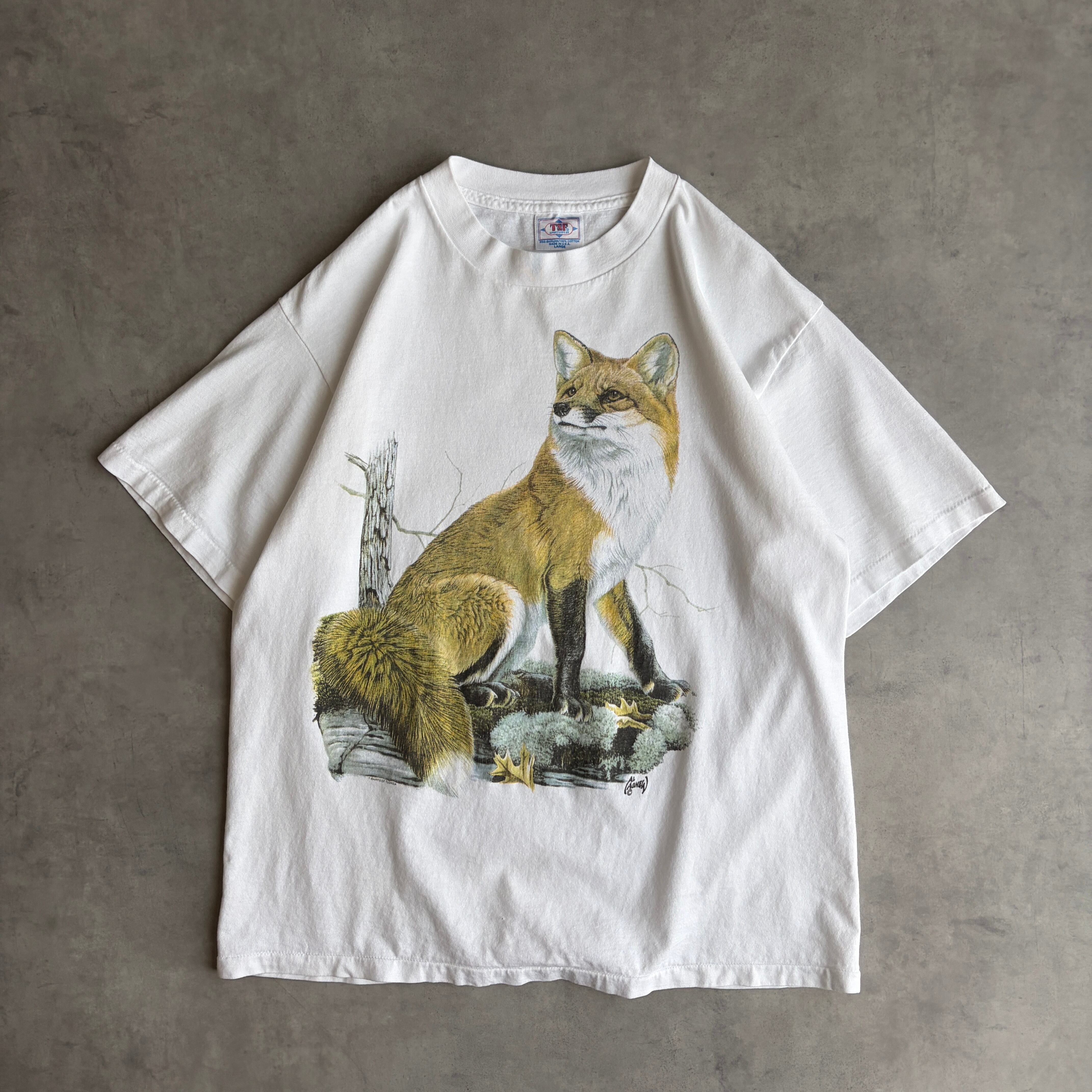 90s/TSF/半袖Tシャツ/USA製/アメリカ製/シングルステッチ/アカギツネ/狐/アニマルプリント/動物/図鑑系/アート/ネイチャー/ホワイト/jmaple