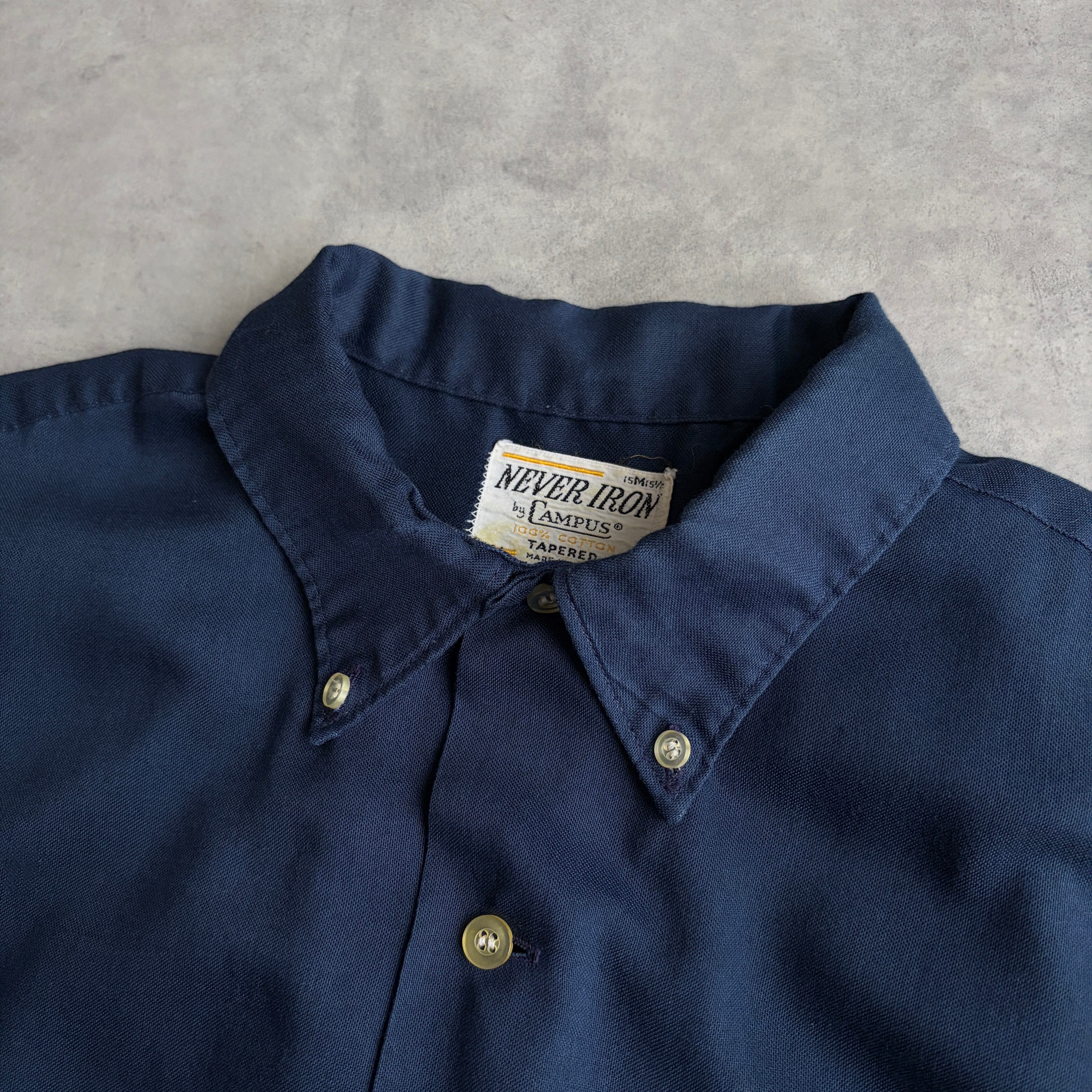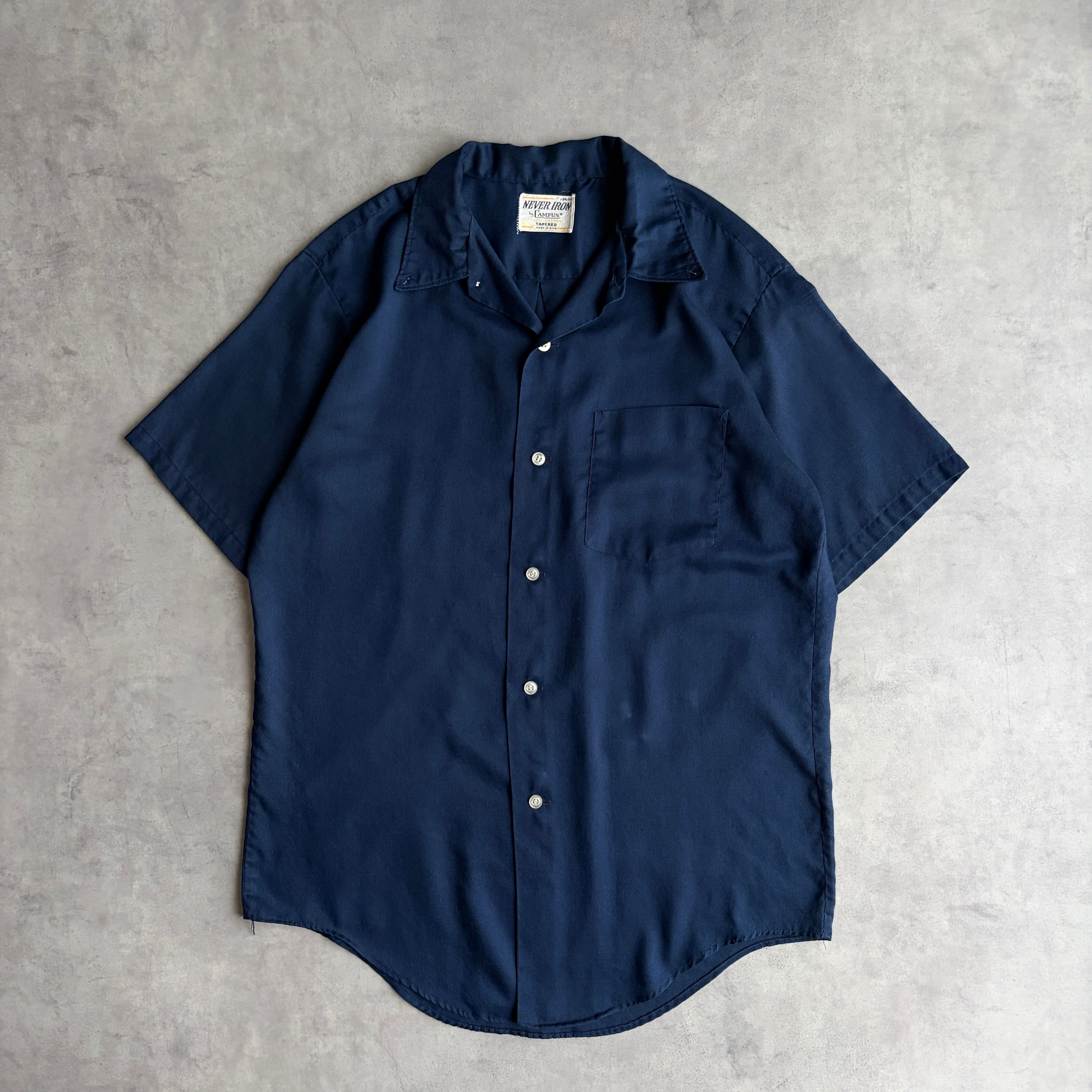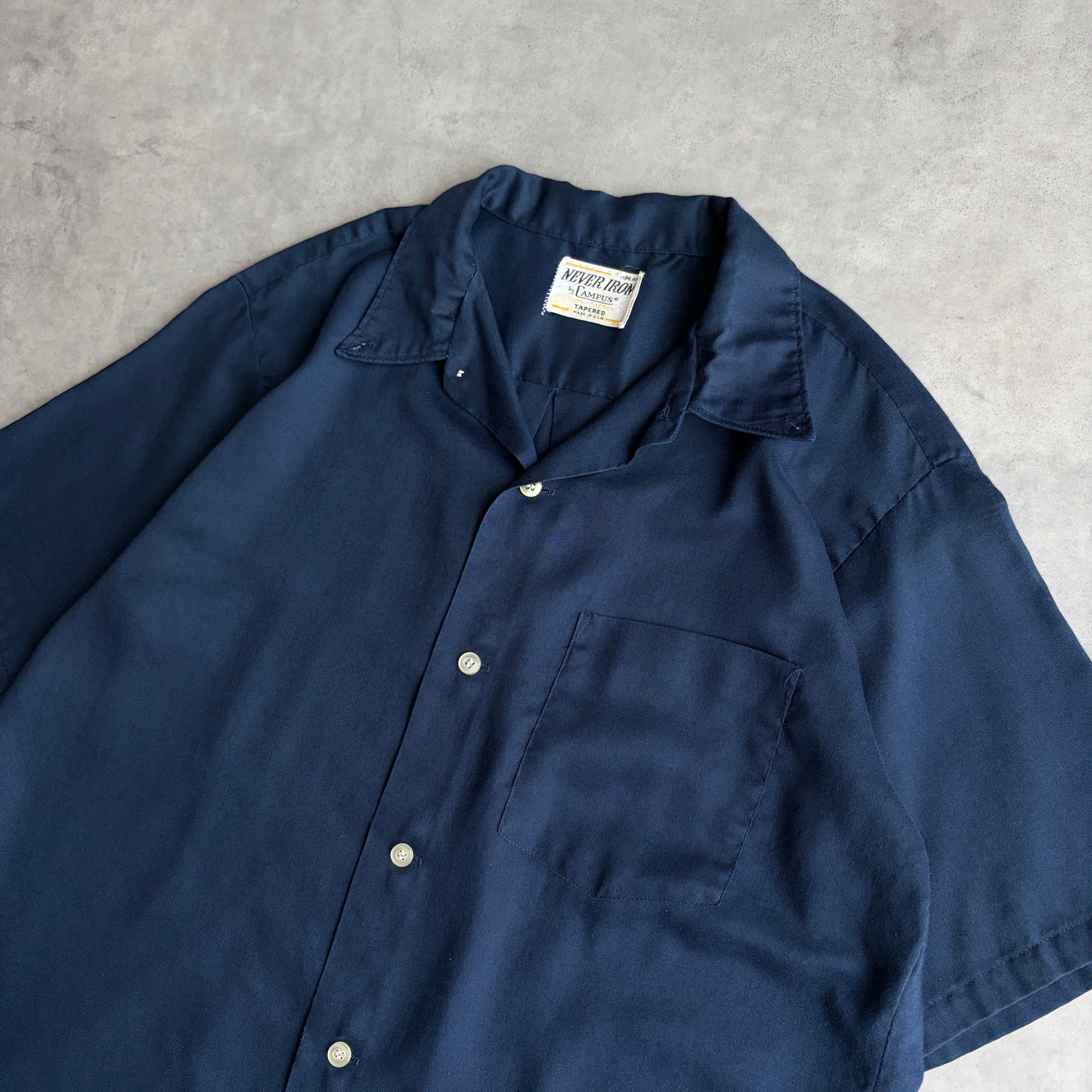 60s〜70s/CAMPUS/キャンパス/半袖シャツ/USA製/アメリカ製/ブロード生地/オープンカラー/開襟/BD/ボタンダウン/三点留め/無地/ネイビー/紺/jmaple