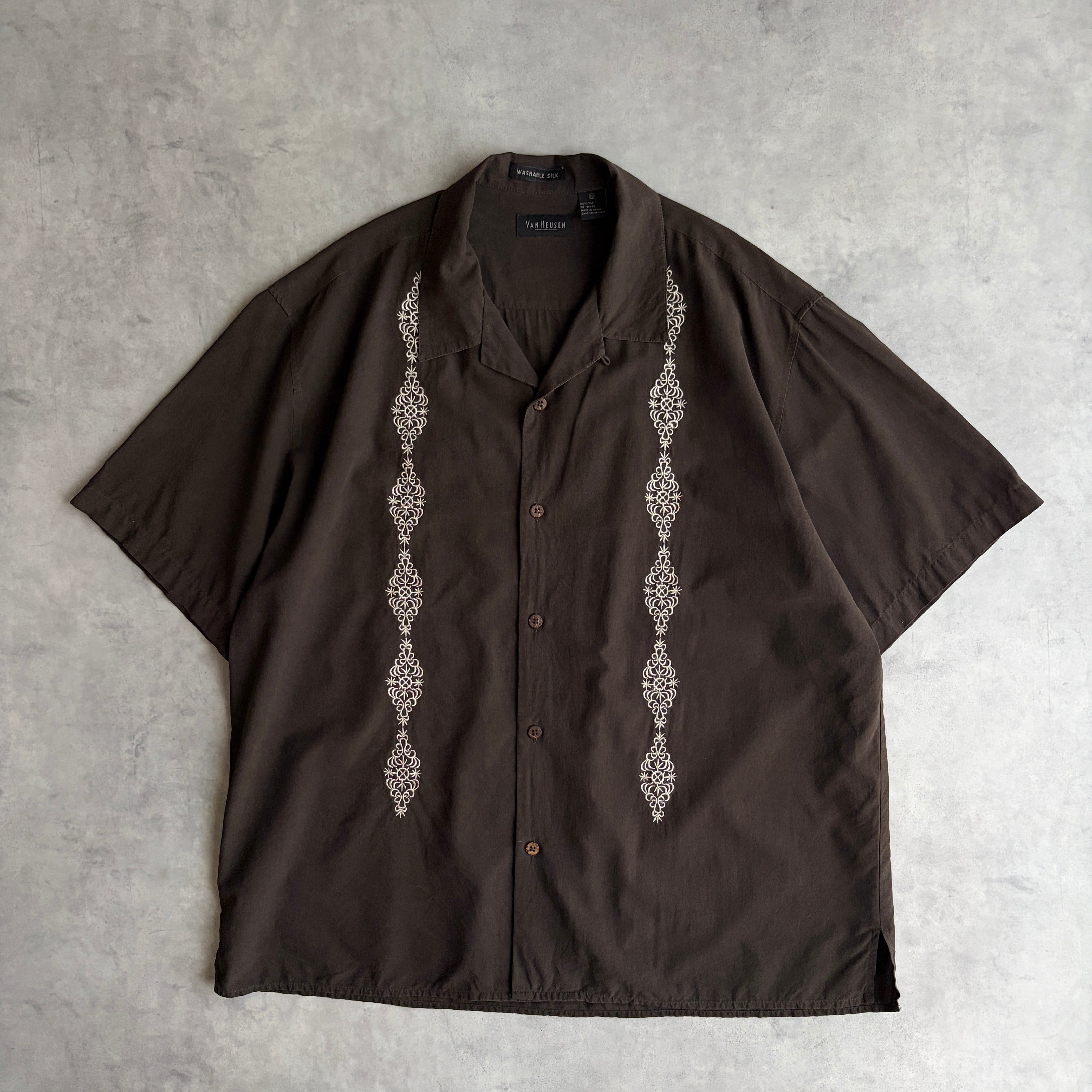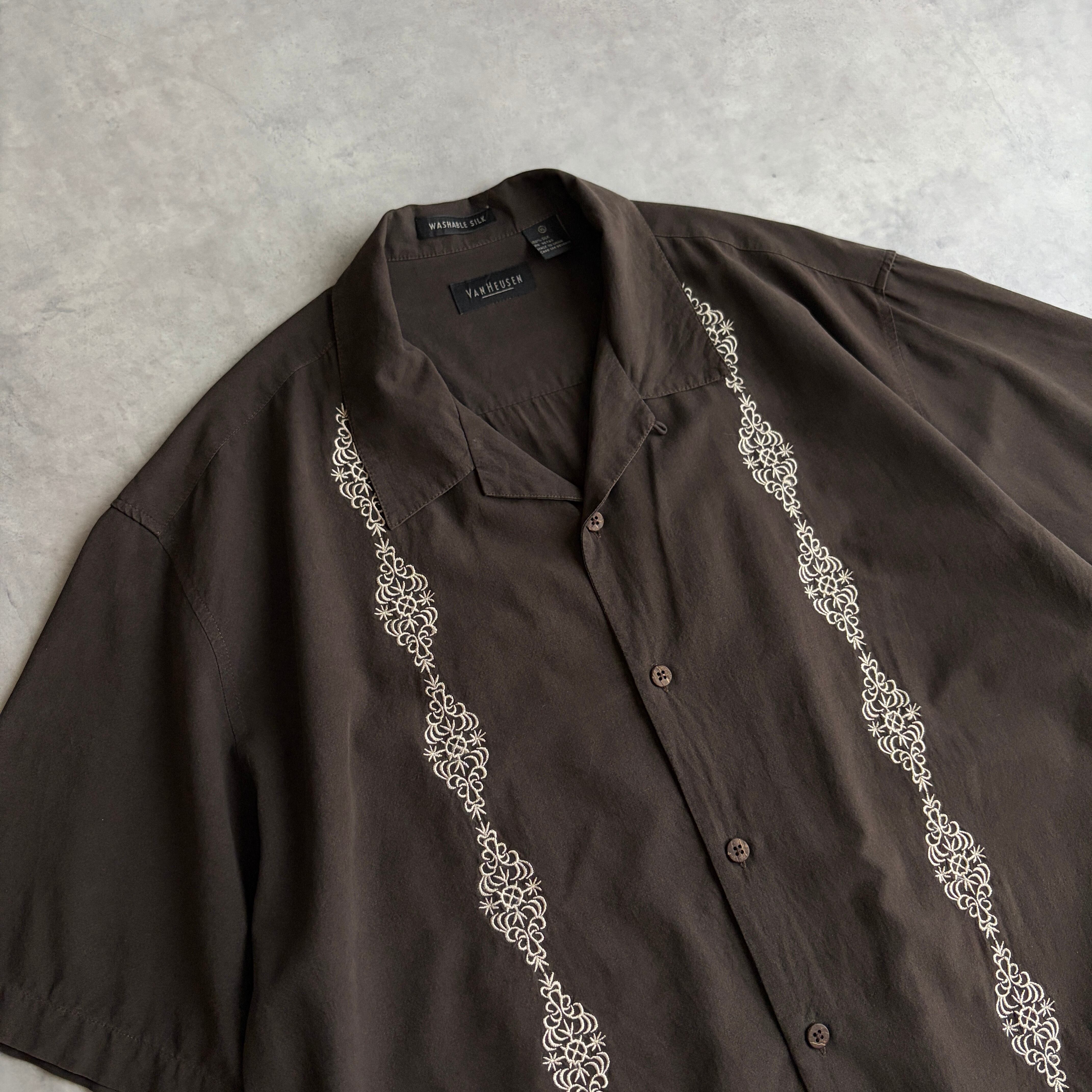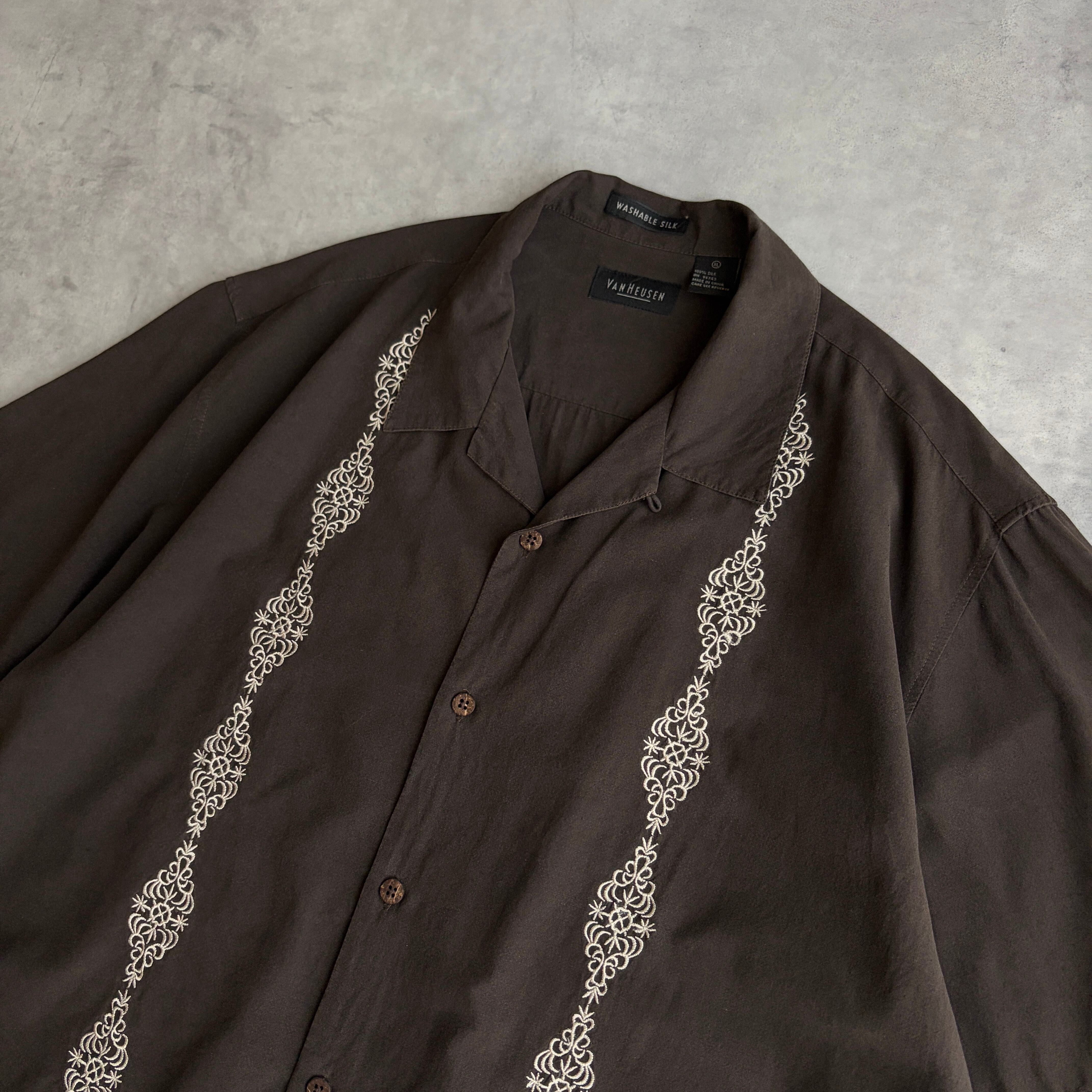 老舗シャツブランドの安心品質のシルク生地、ブラウンカラーで落ち着きがありつつホワイトの刺繍柄が夏の雰囲気も出してくれるアイテム。