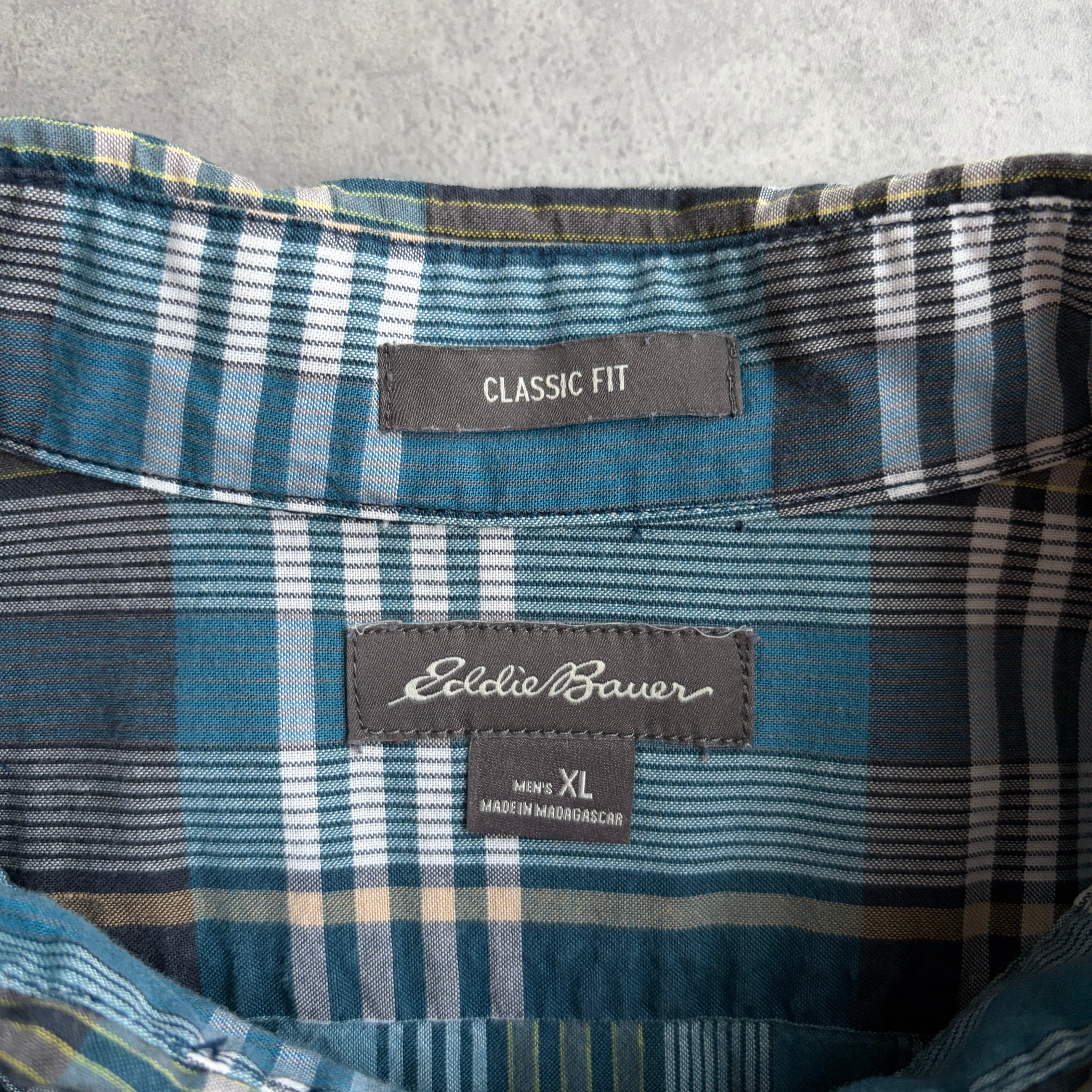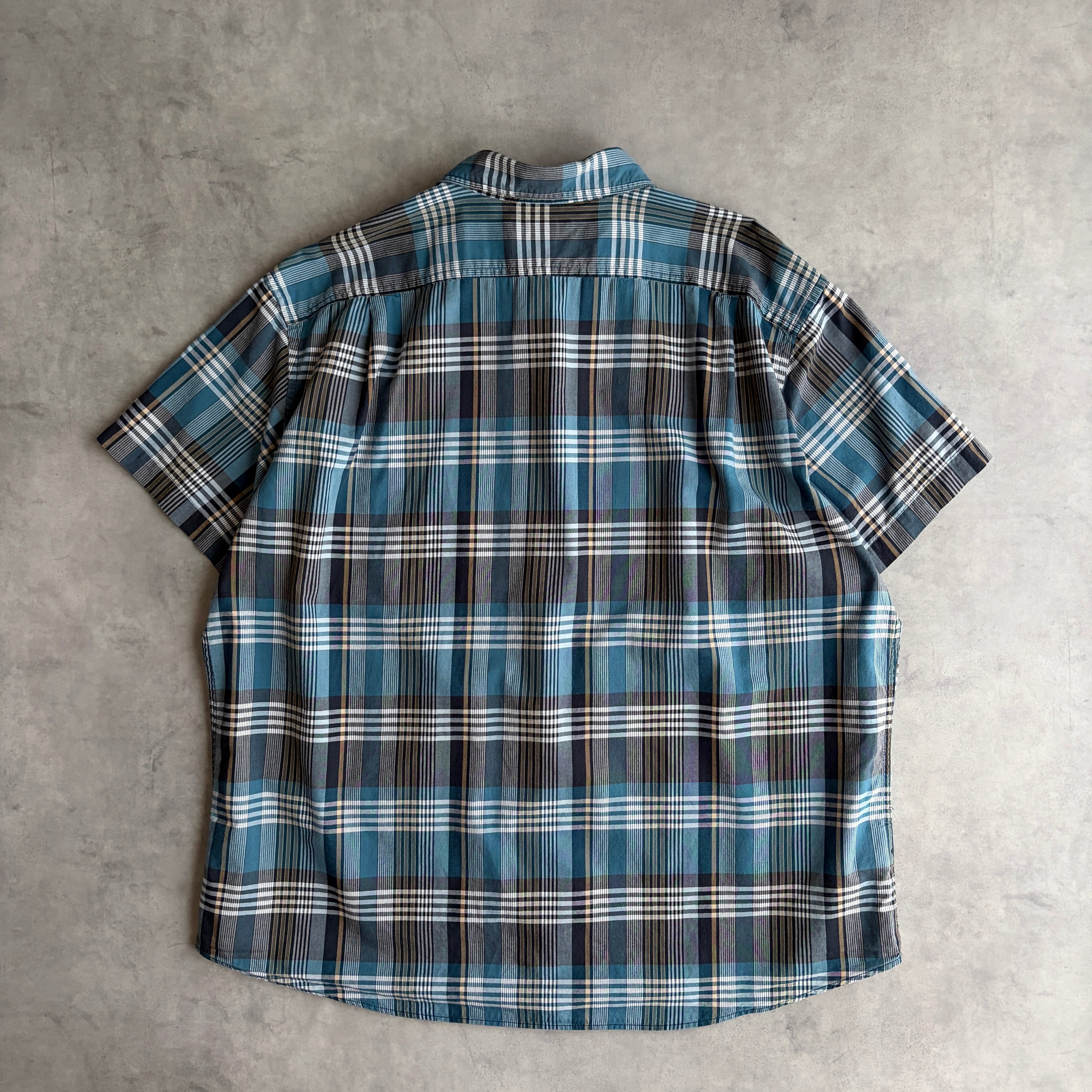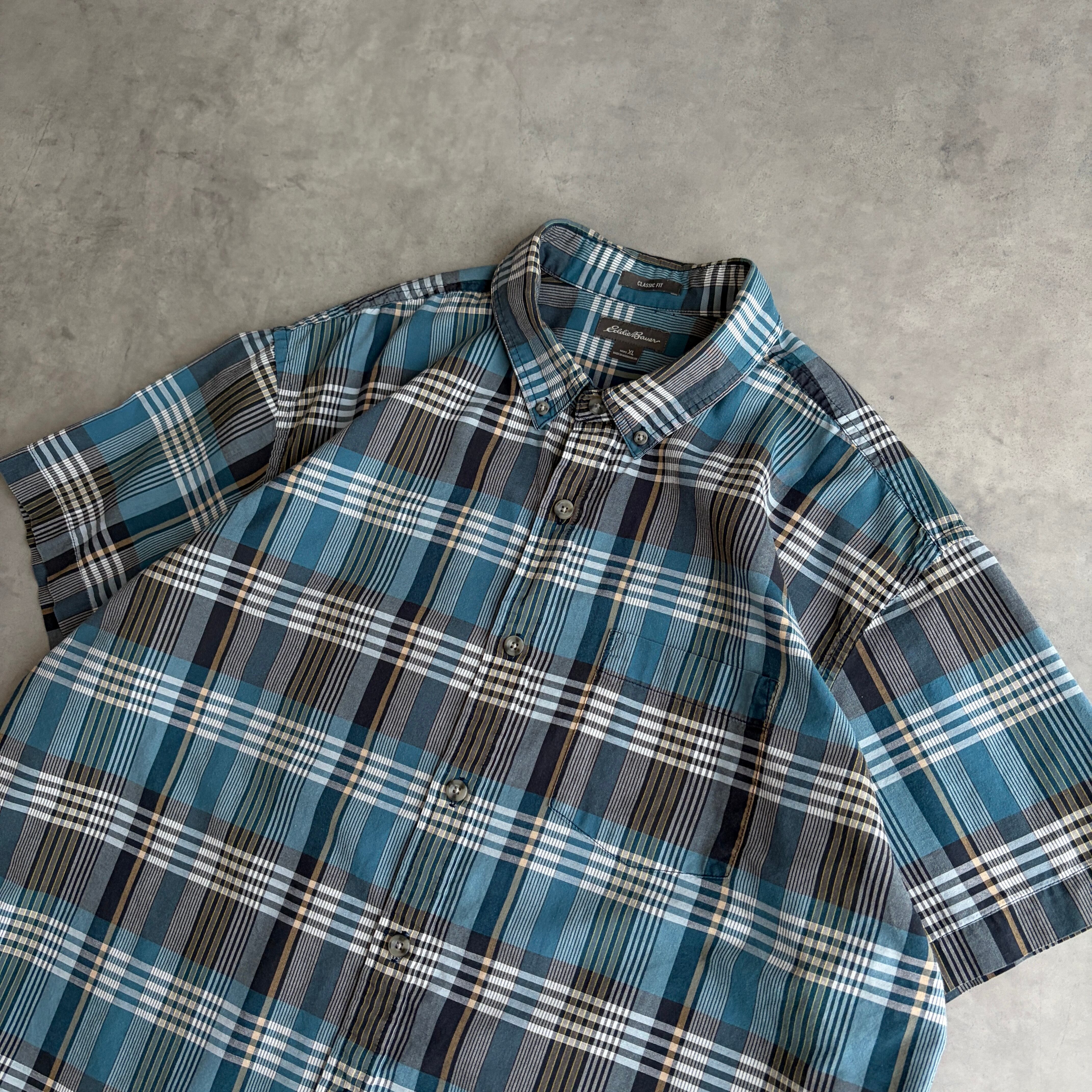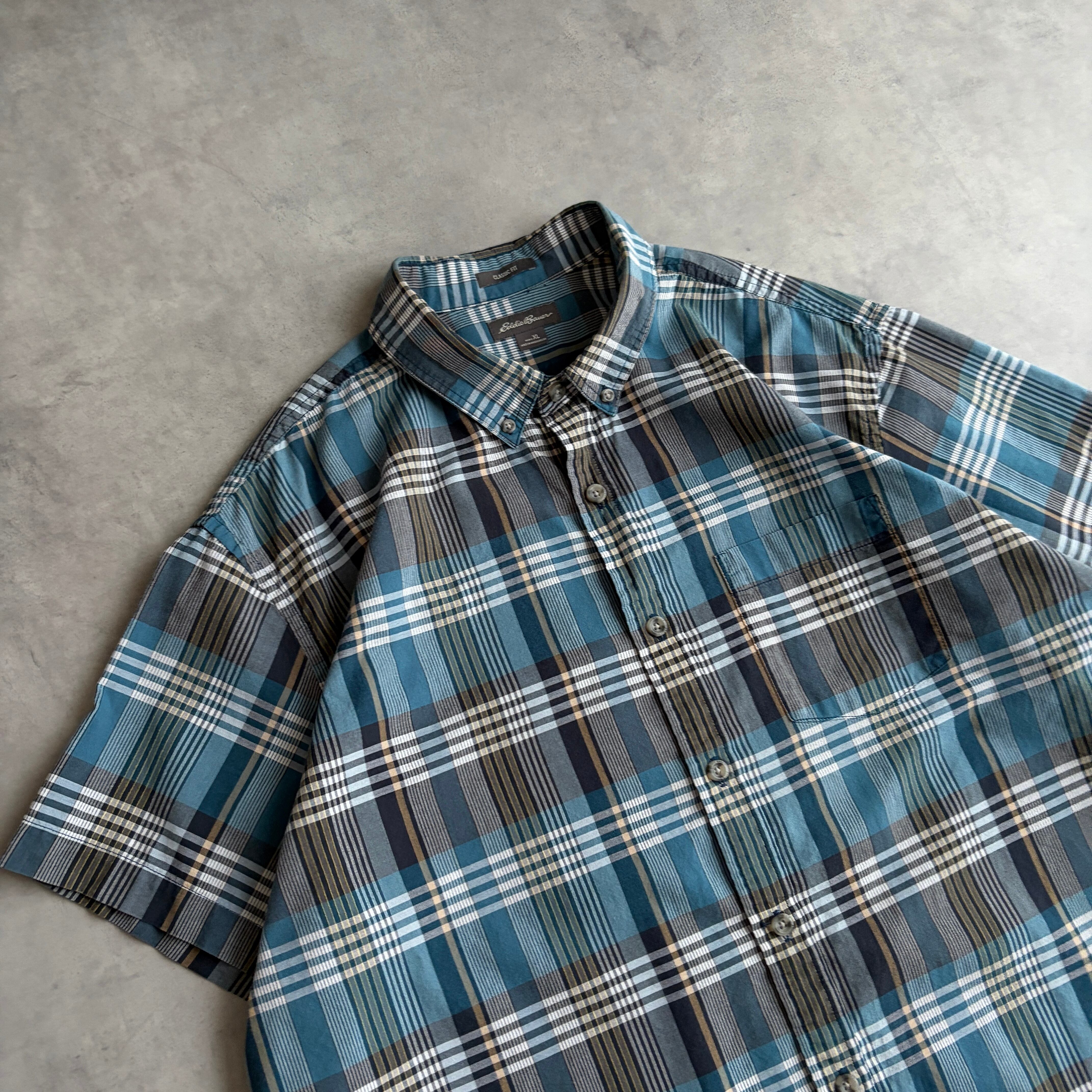 Eddie Bauer/エディーバウアー/半袖シャツ/BD/ボタンダウン/ブロード生地/マドラスチェック/格子柄/グリーンブルー/jmaple