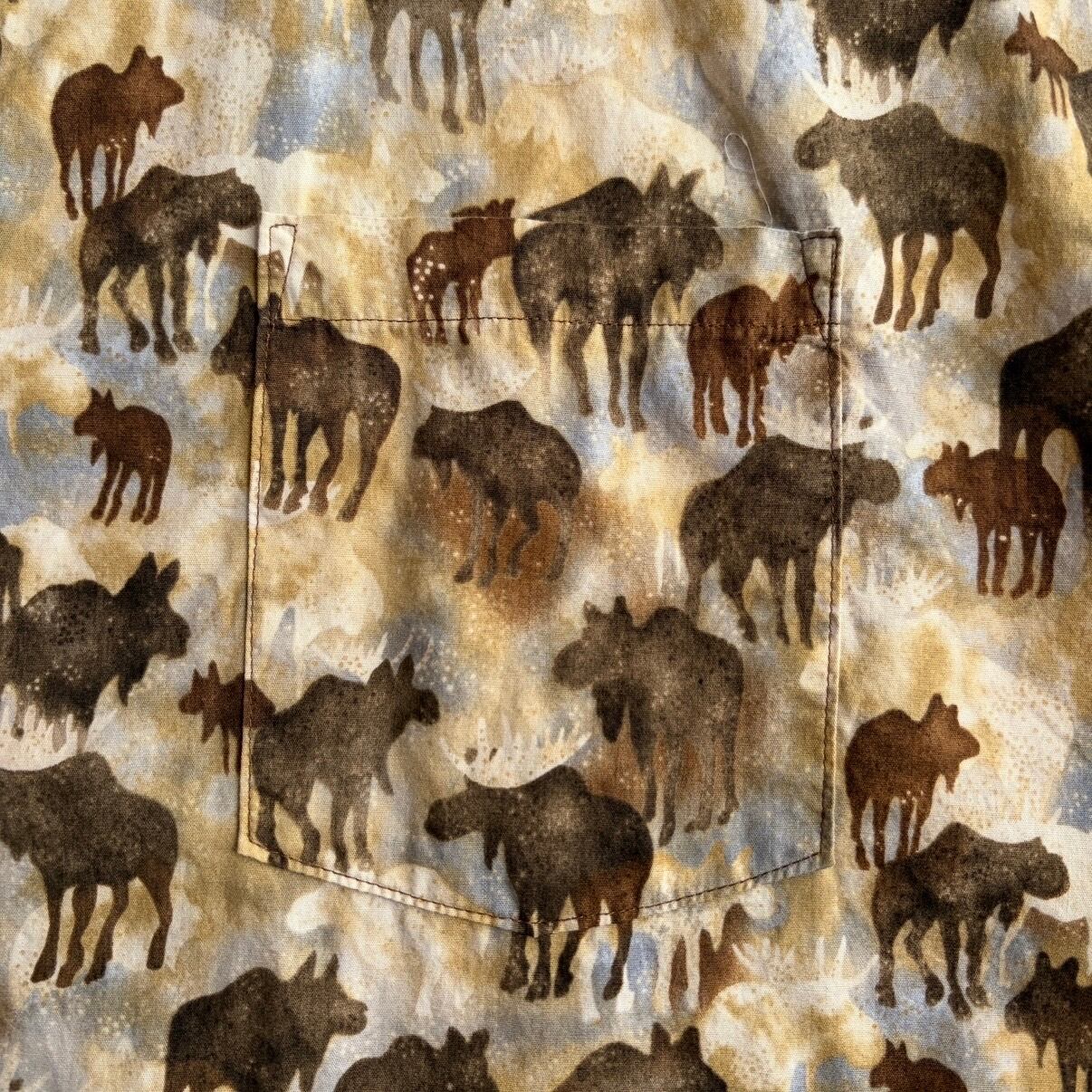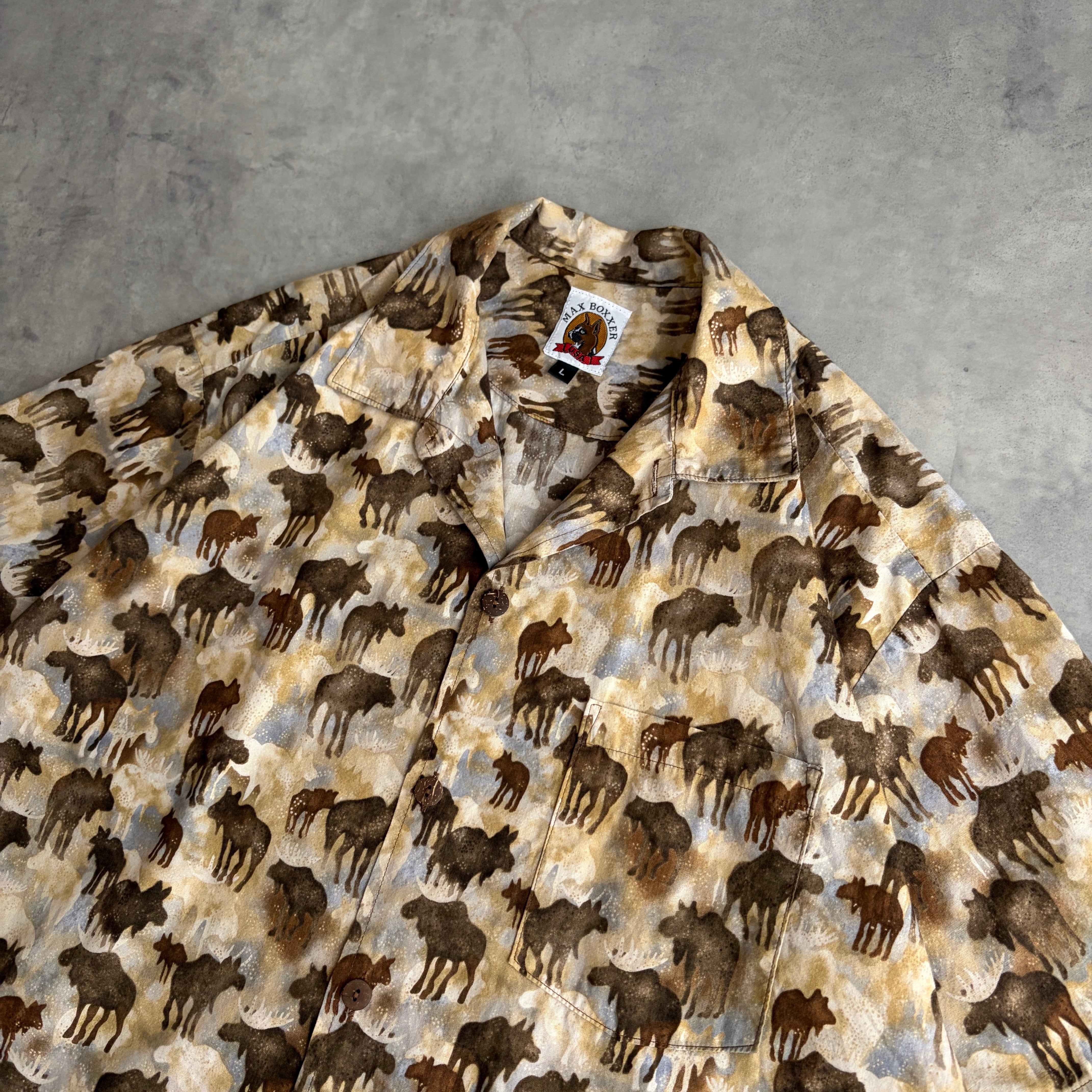 90s〜00s/MAX BOXXER/USA製/アメリカ製/半袖シャツ/開襟/オープンカラー/総柄/ヘラジカ/マーチングムース/アースカラー/jmaple