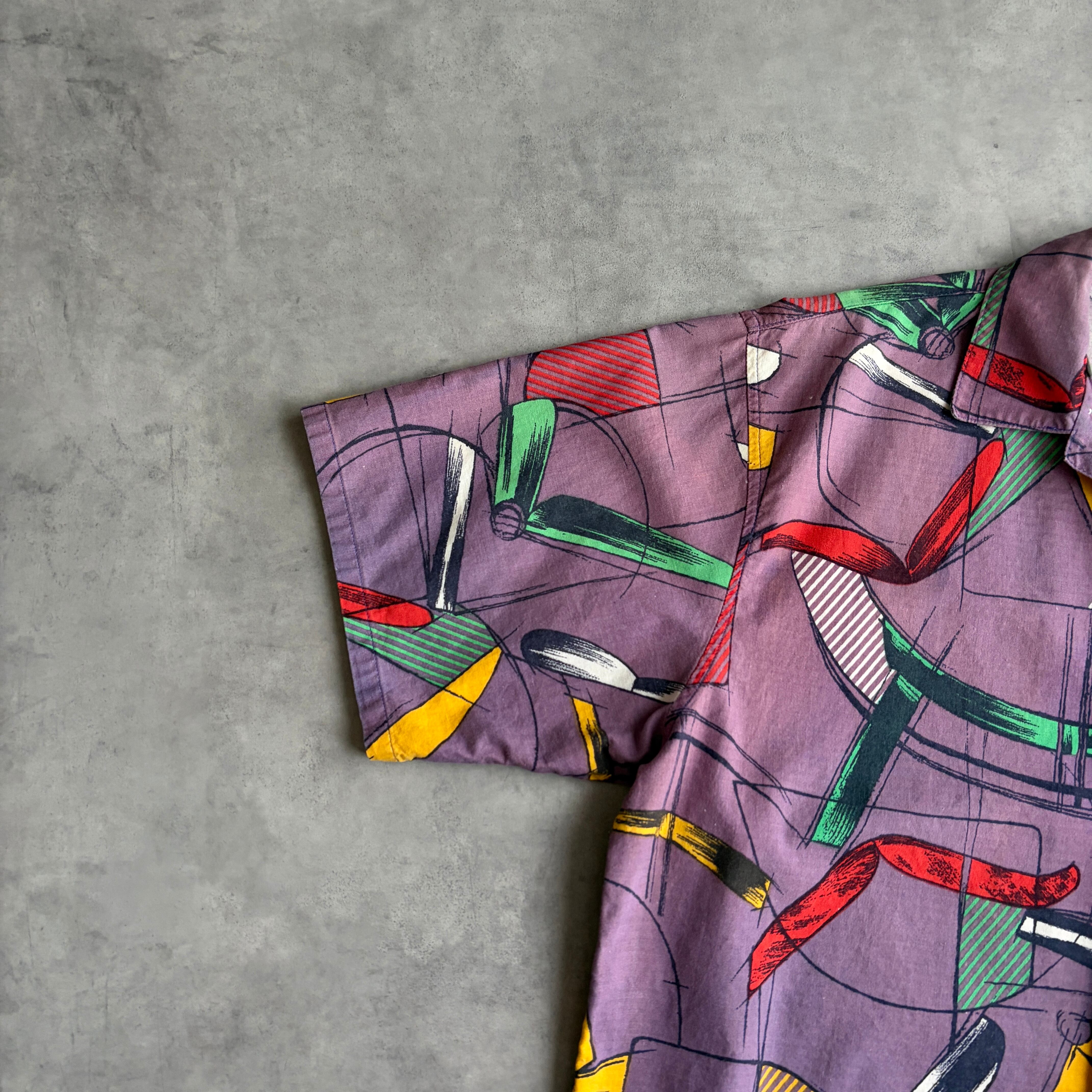 カラフルで抽象的な幾何学模様が散りばめられたプリントシャツ。