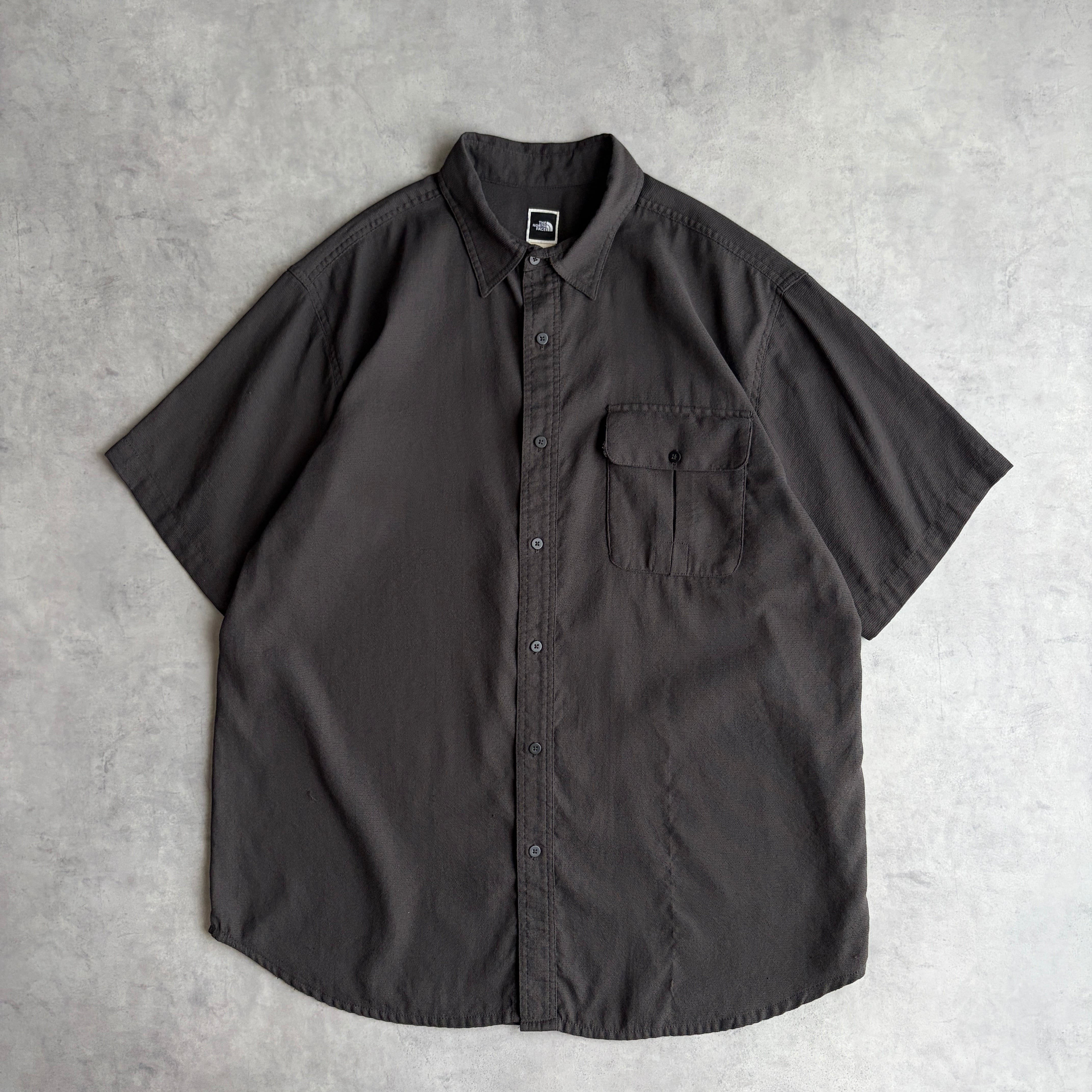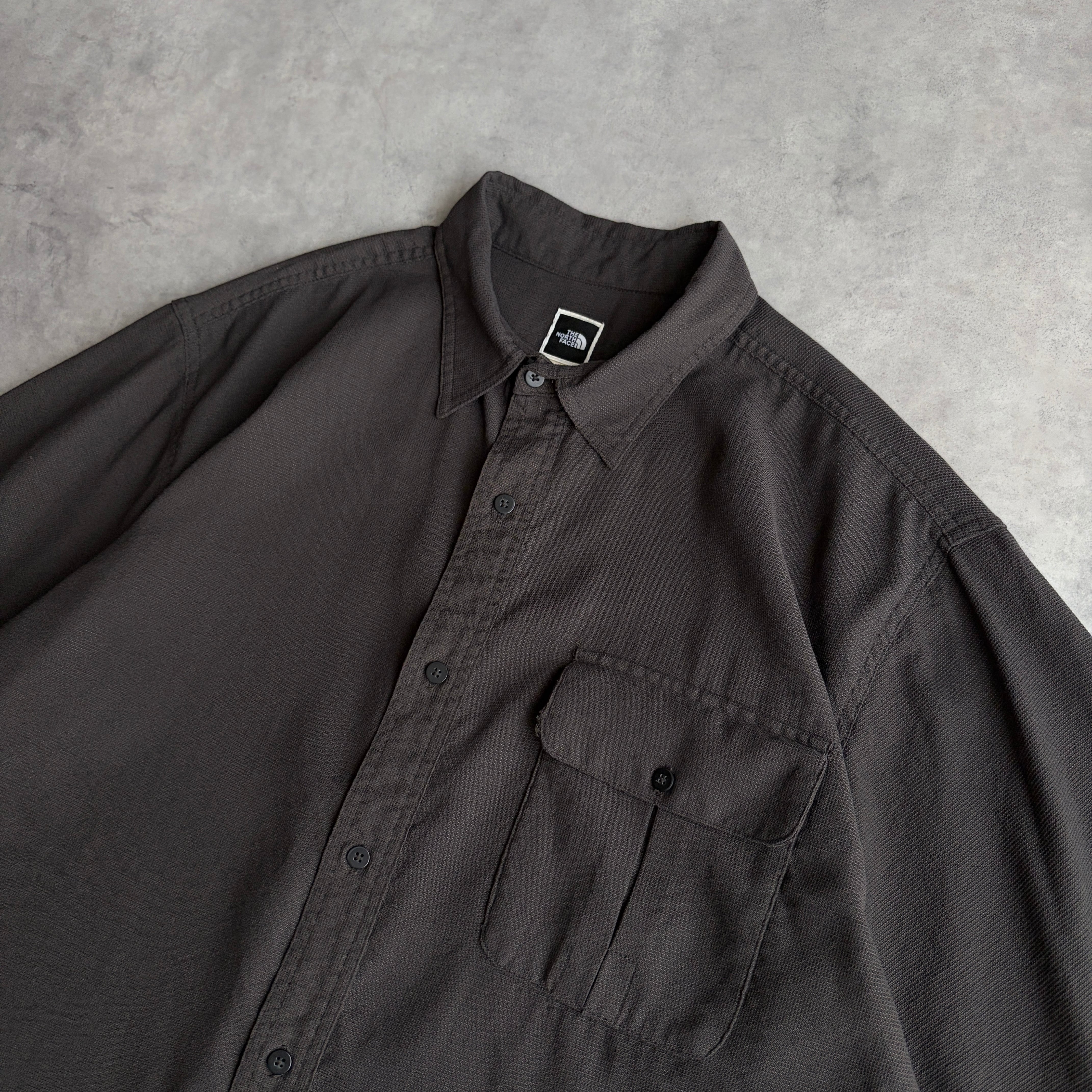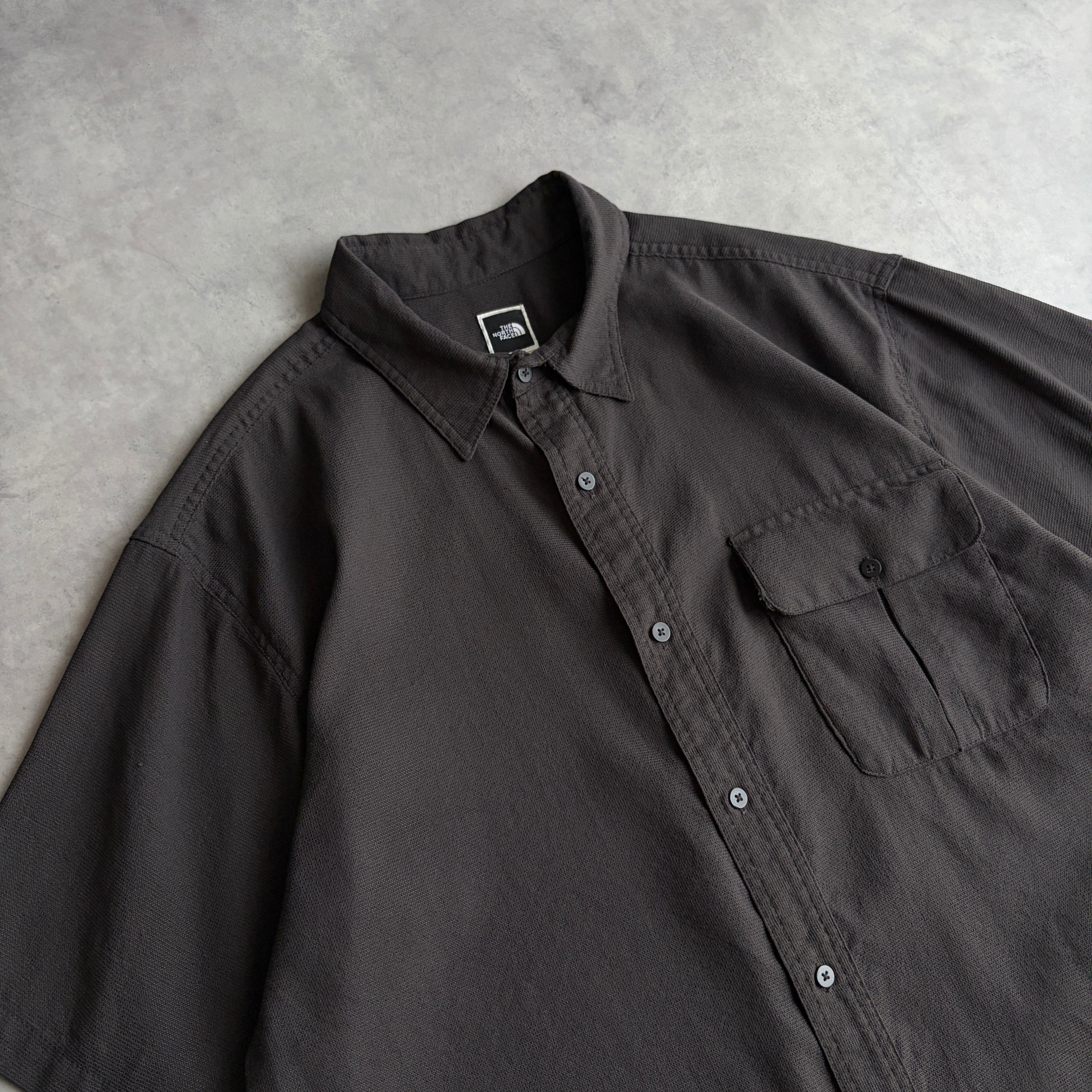 90s〜00s/THE NORTH FACE/ノースフェイス/半袖シャツ/ナイロン生地/レギュラーカラー/ロゴ刺繍/フラップポケット/ジップ/ワッフル風/墨黒/スミクロ/jmaple