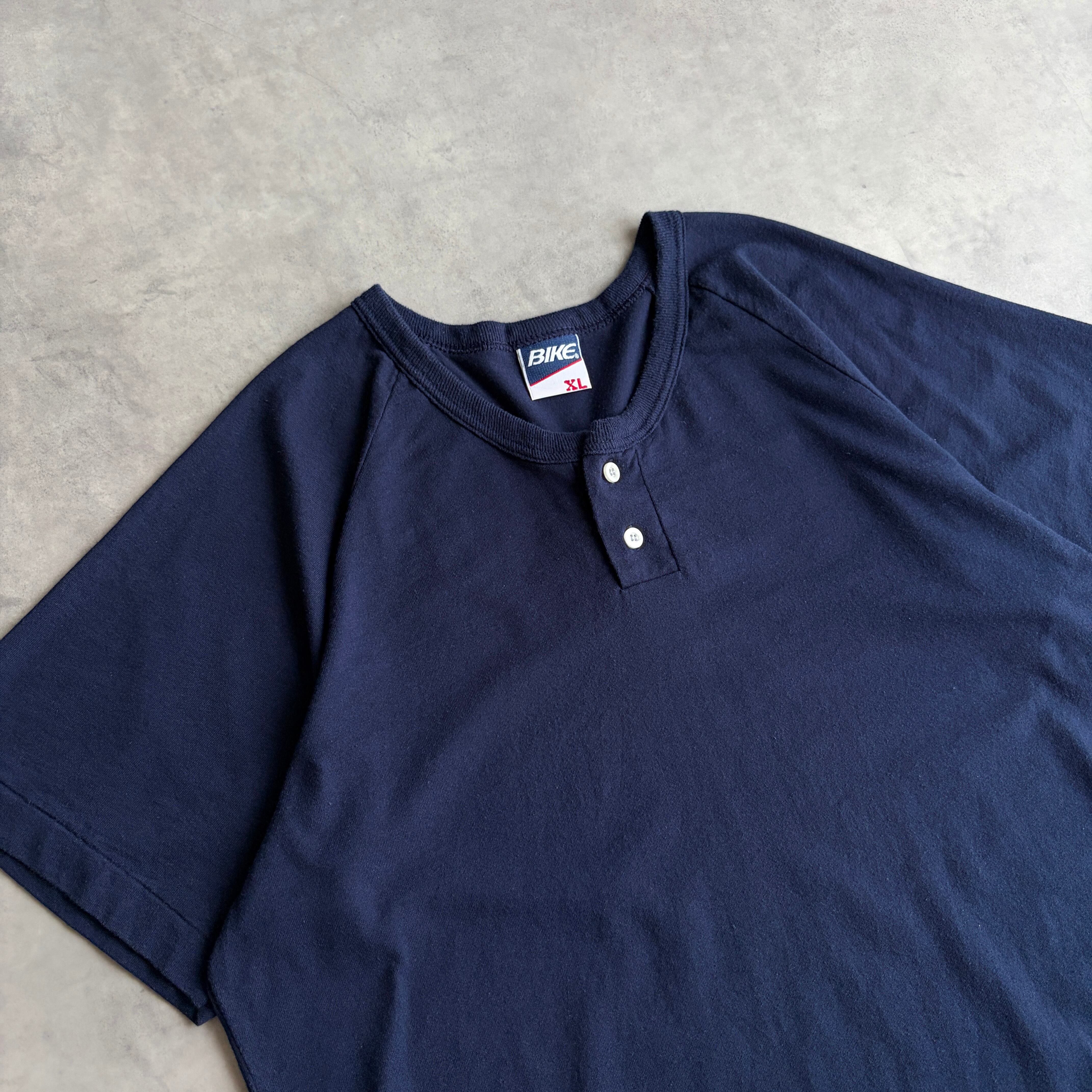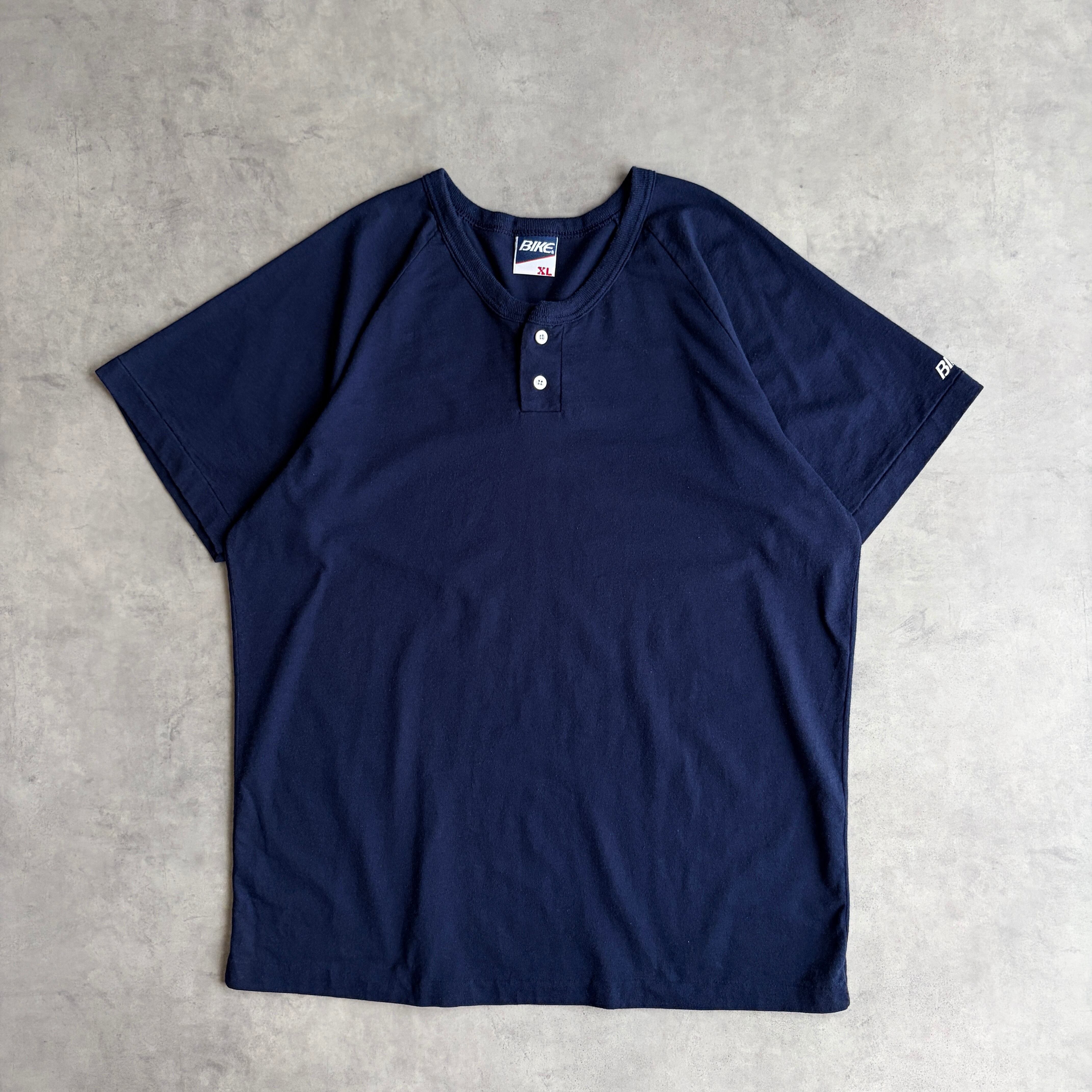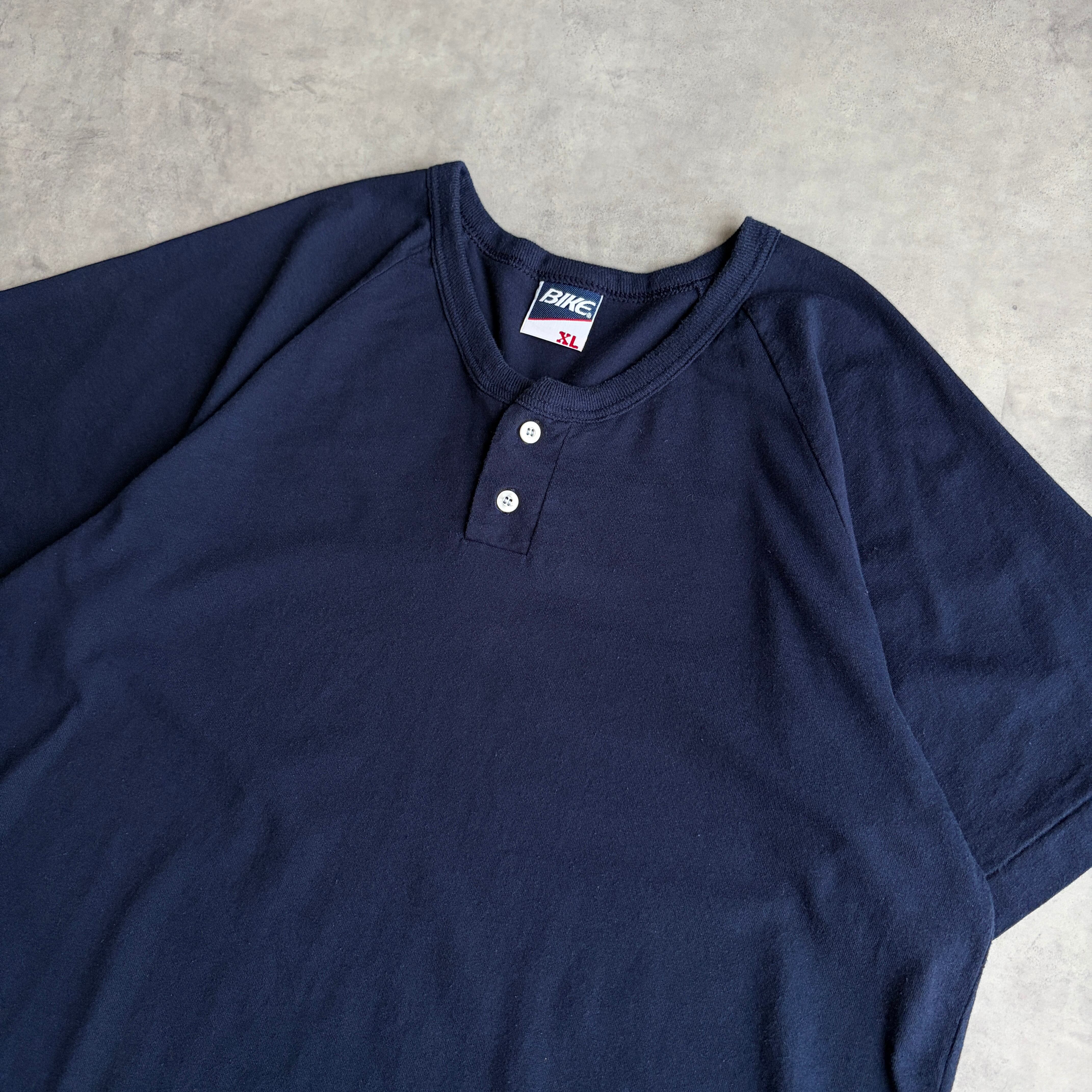 90s/BIKE/半袖Tシャツ/ヘンリーネック/シングルステッチ/ラグランスリーブ/袖ロゴプリント/無地/ソリッド/ノームコア/ワンポイント/ネイビー/紺/jmaple