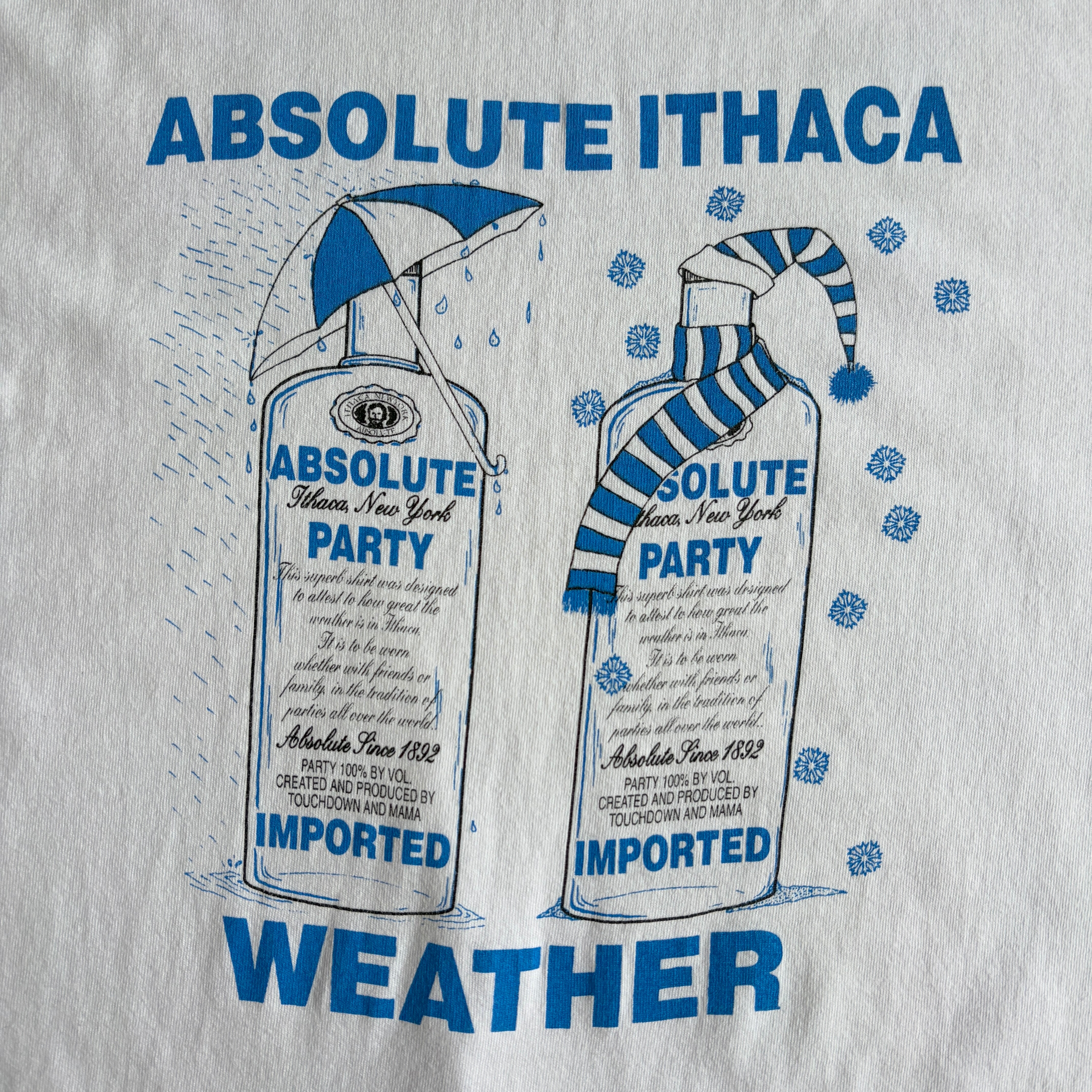 ボトルが2本並んでおり、左側は雨・右側は雪が描かれておひ、イサカの天気が極端で、雨か雪ばかりであることを表したデザイン。